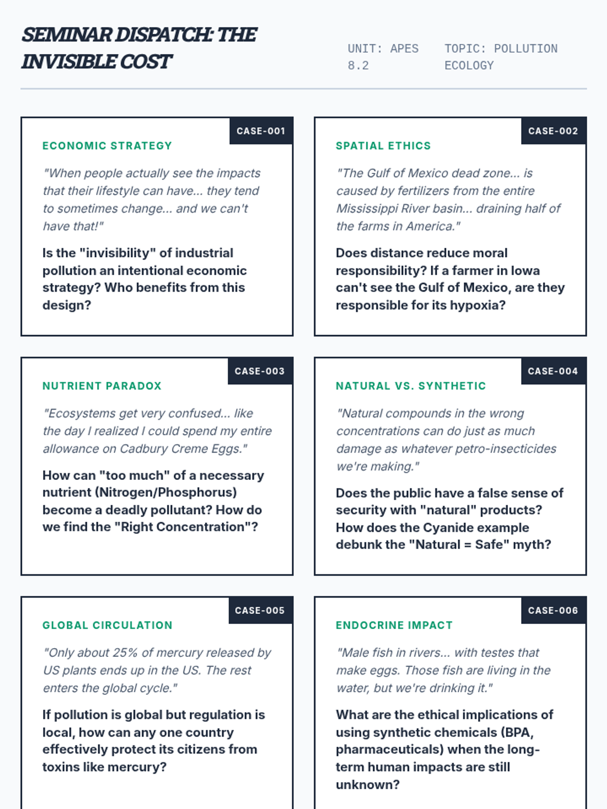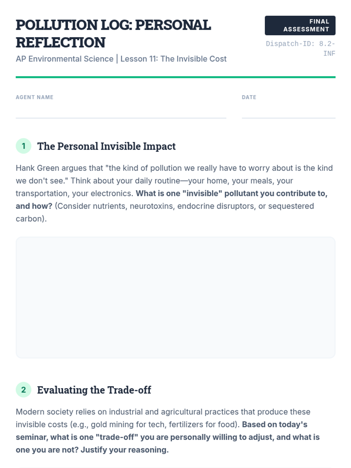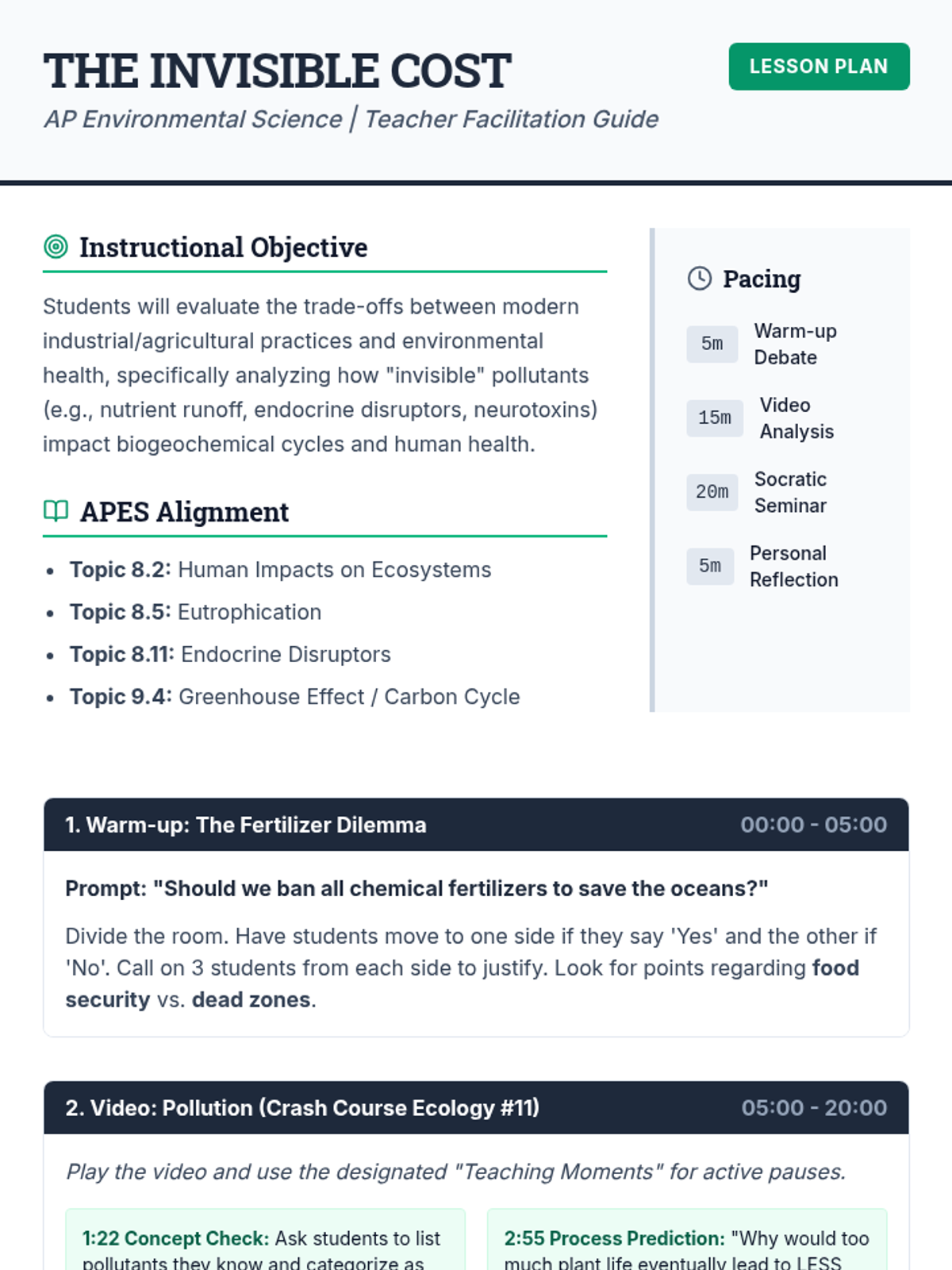 A lesson for AP Environmental Science exploring the hidden environmental costs of modern industrial and agricultural practices, featuring the Crash Course Ecology video on pollution.