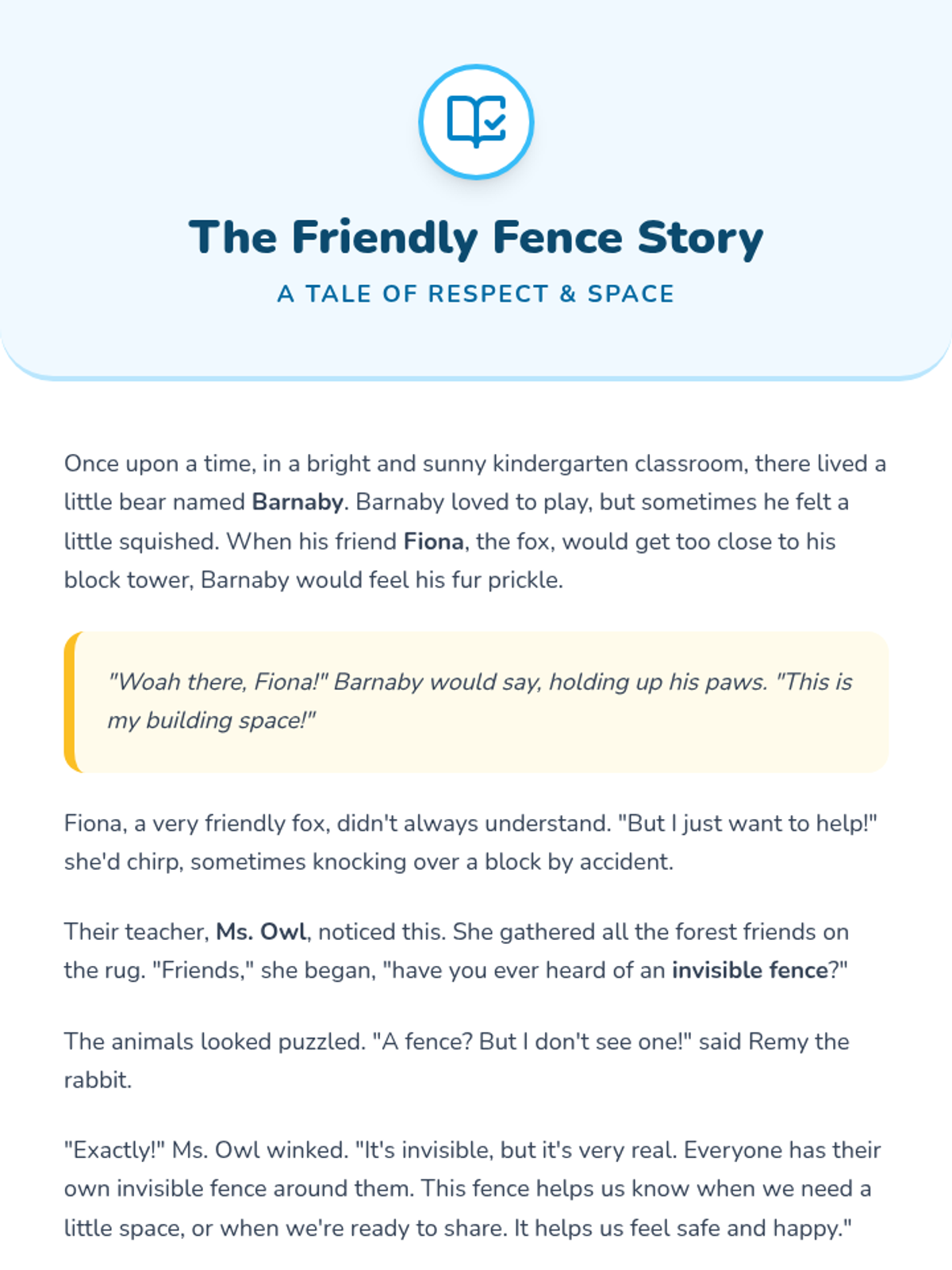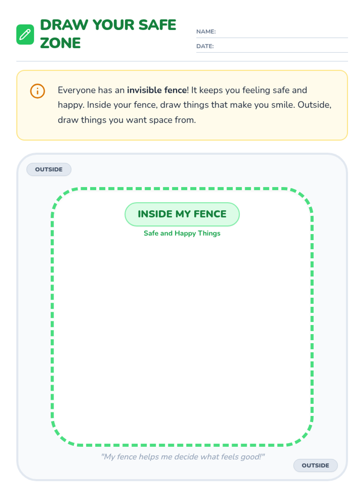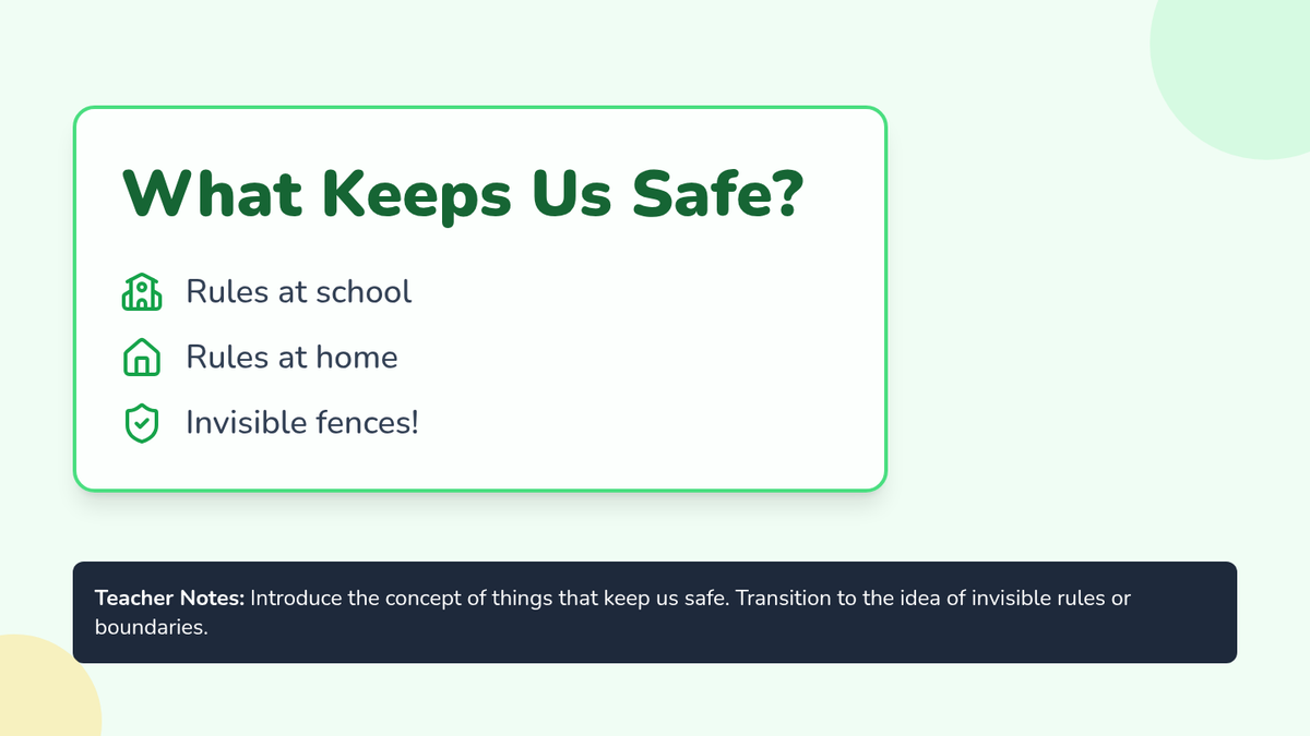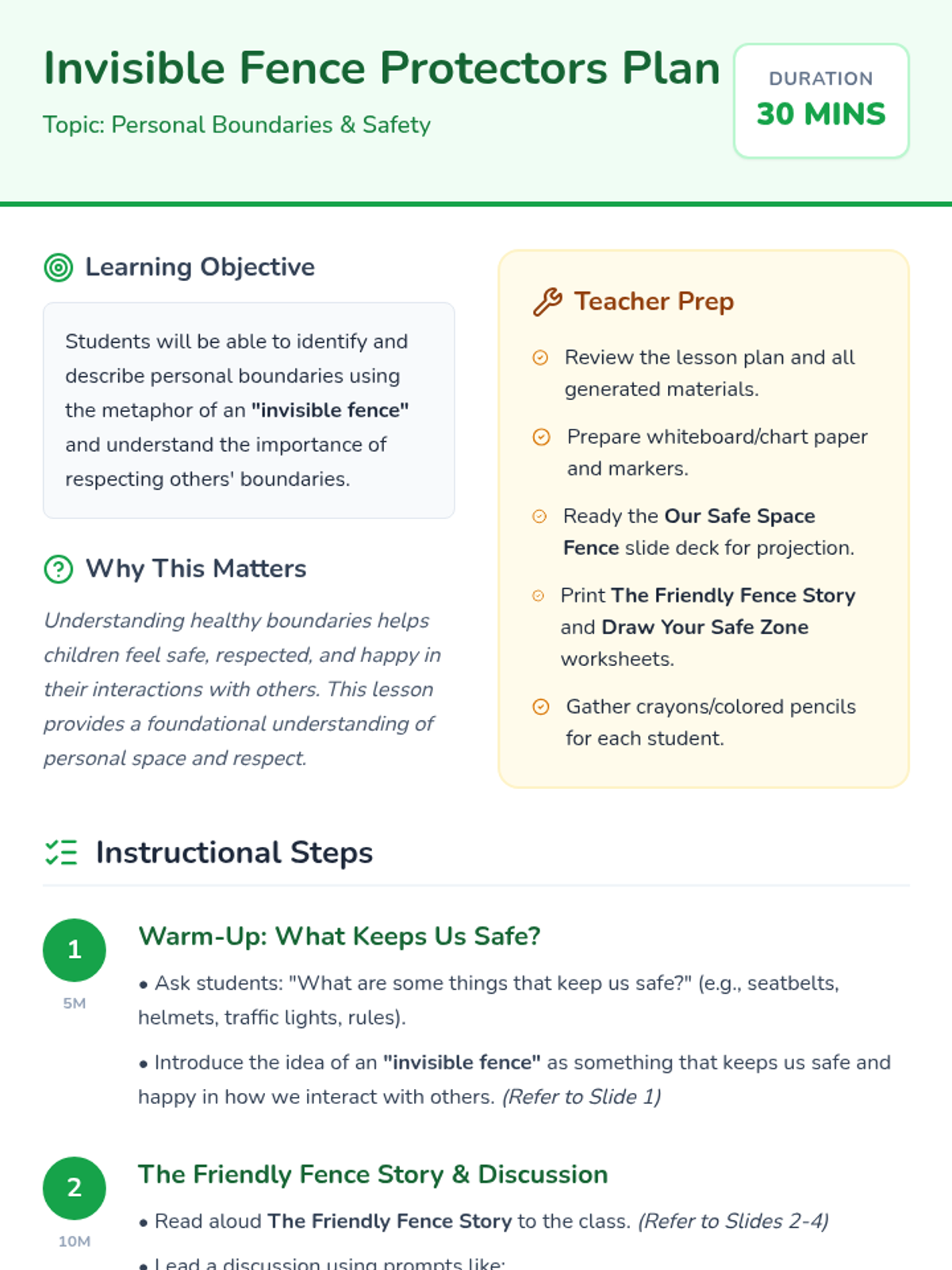 A 30-minute lesson for Kindergarten students introducing personal boundaries through the metaphor of an 'invisible fence' to help them feel safe and respected.