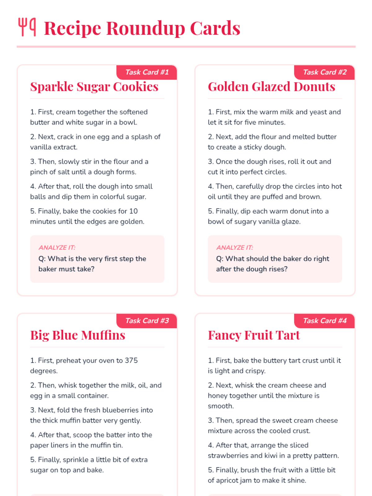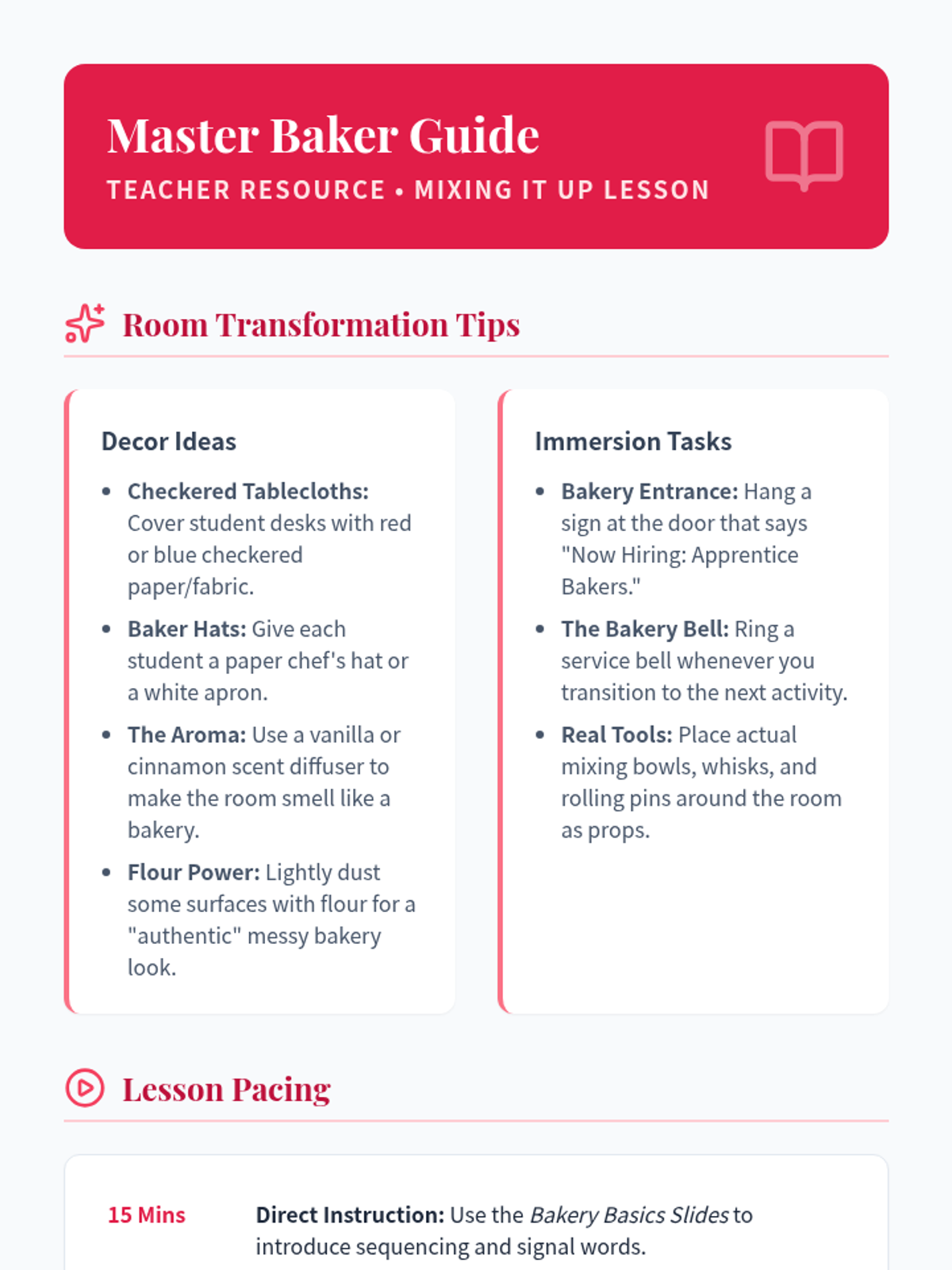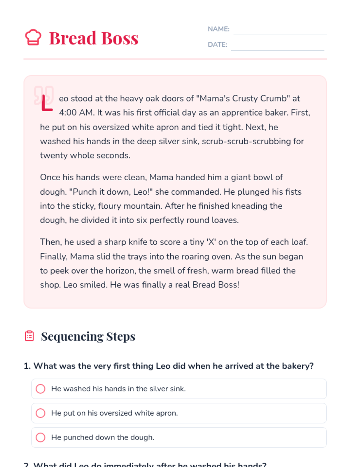 Students learn to identify and order sequential steps in both narrative stories and procedural texts within a bakery setting. The lesson includes a presentation on sequencing keywords, a fiction passage about a bakery, and a hands-on sequencing sort activity.