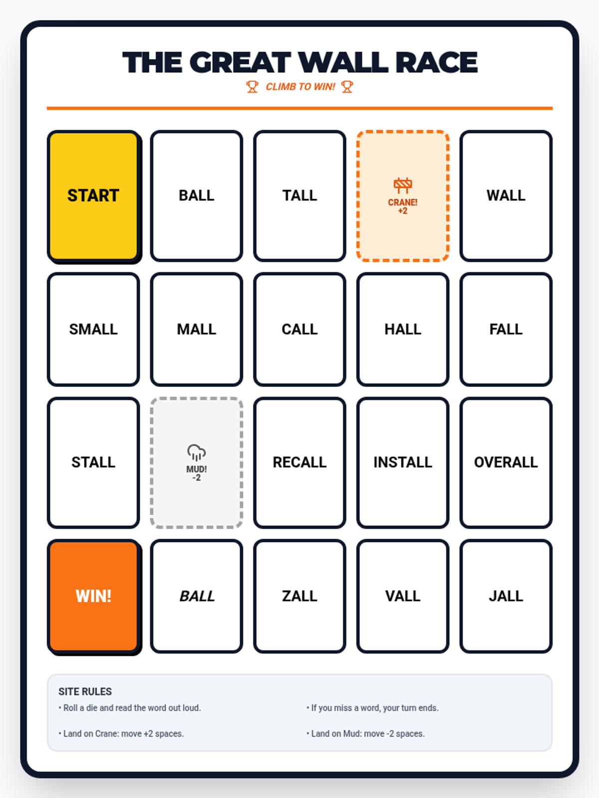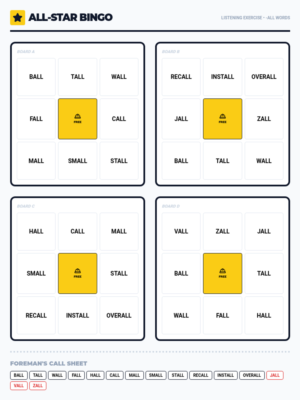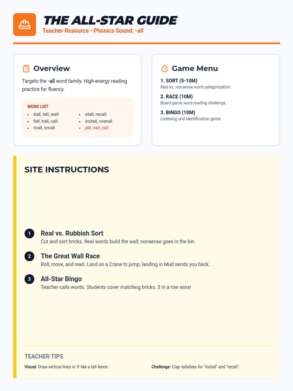 A comprehensive phonics lesson focusing on the '-all' sound through interactive games including matching, sorting, and a board game. Students will practice reading and identifying 15 real and nonsense words.