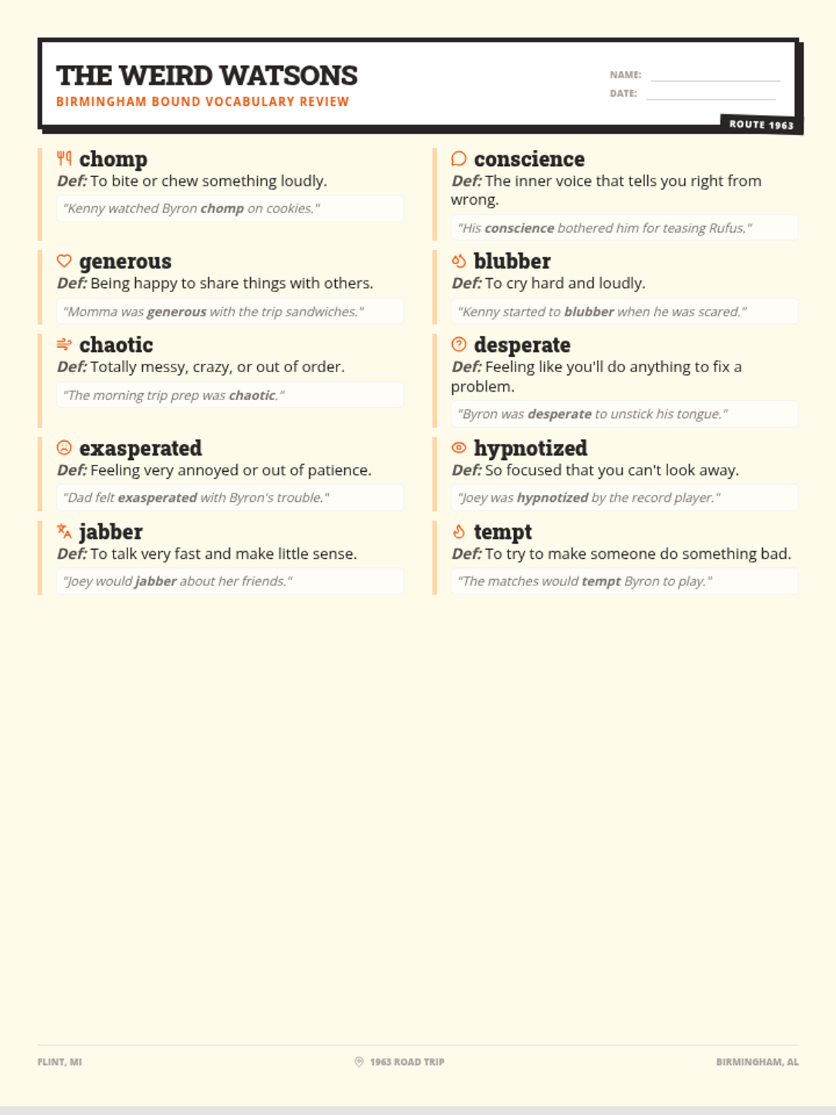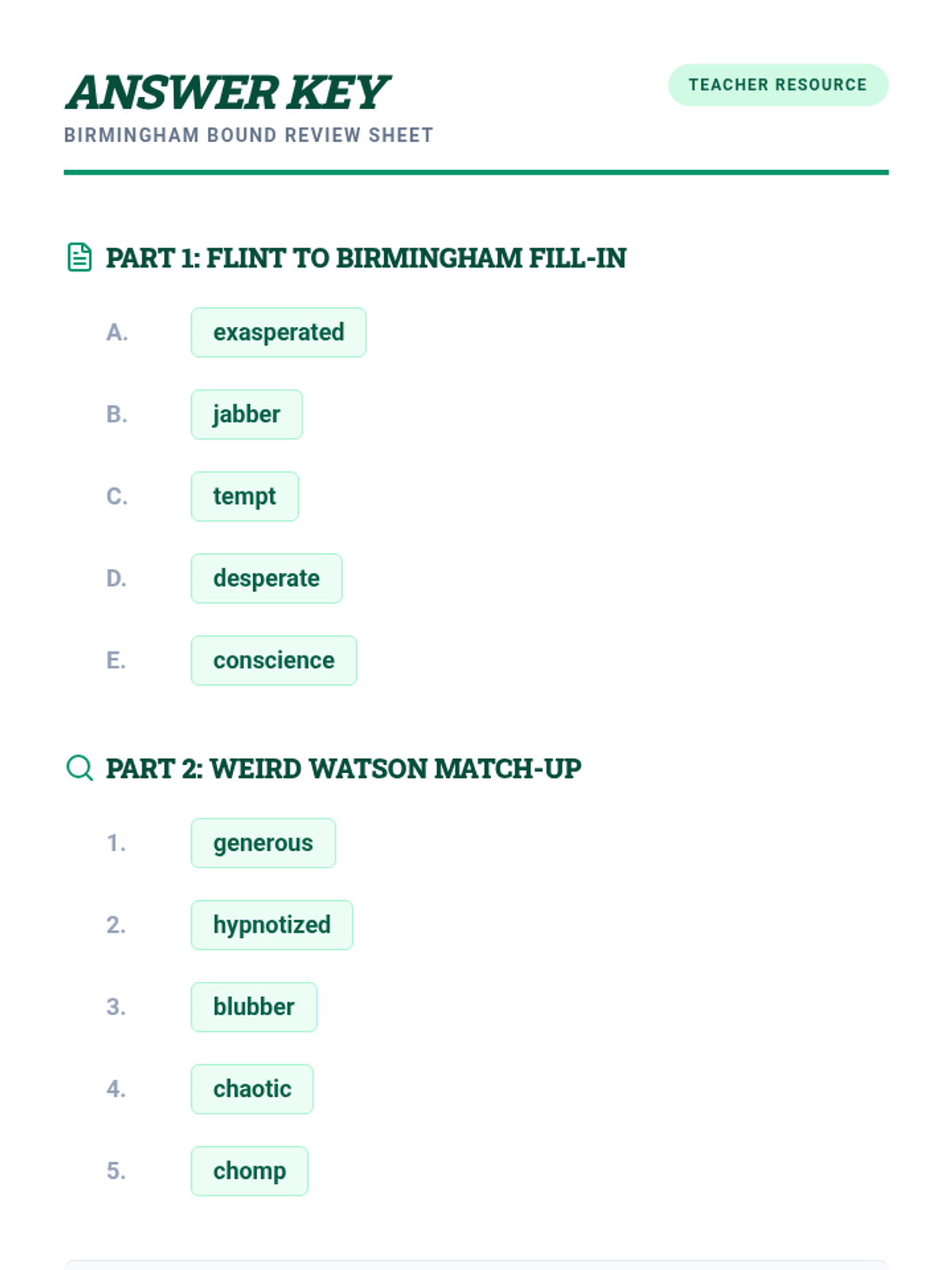 A focused vocabulary lesson targeting ten specific words through definitions, examples, and contextual practice. The lesson includes a comprehensive review sheet and an accompanying answer key to prepare students for a summative quiz.