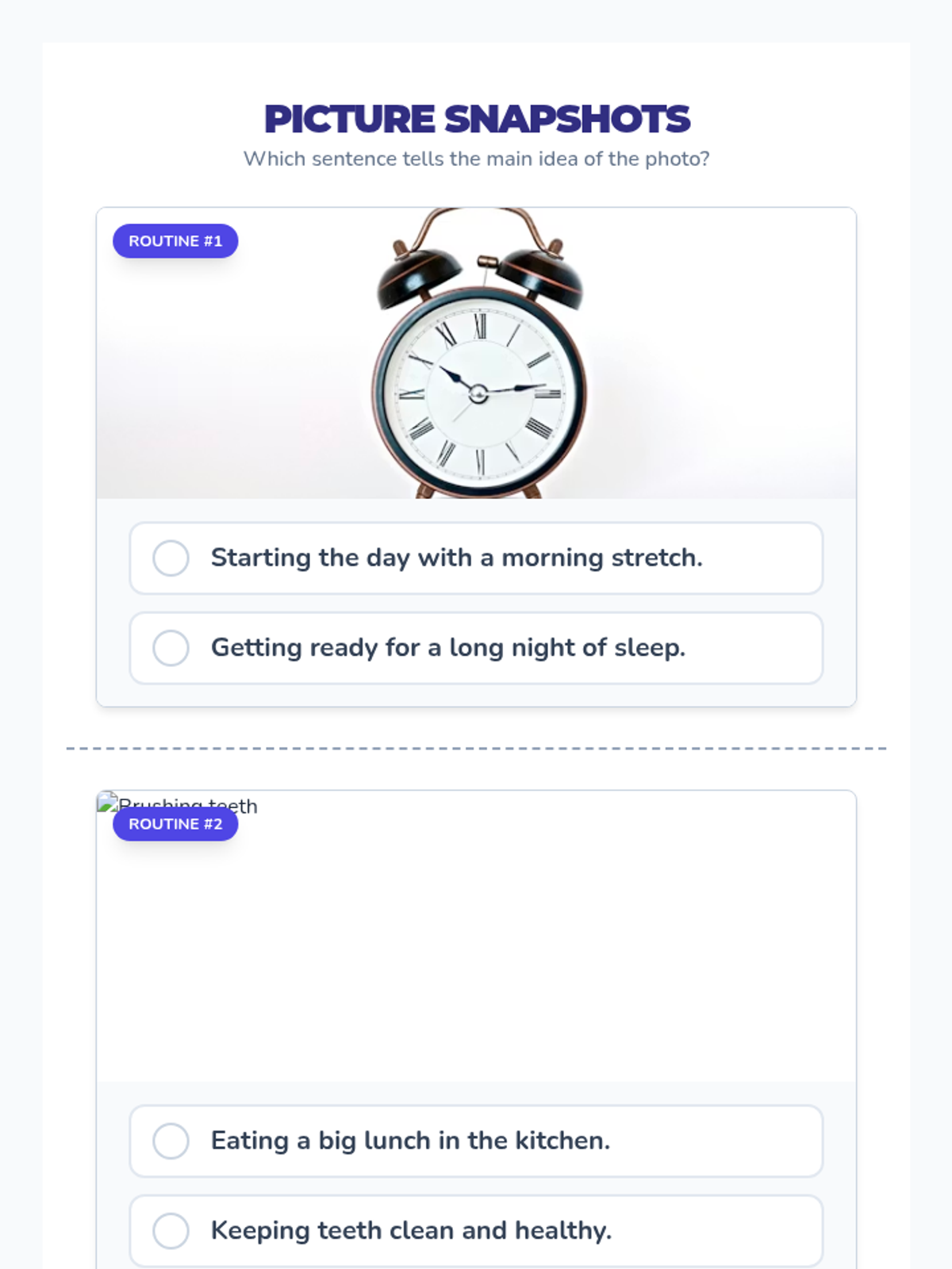 A collection of visual task cards designed to help students identify the main idea of daily routines and animal habitats through picture scenes and sentence selection.
