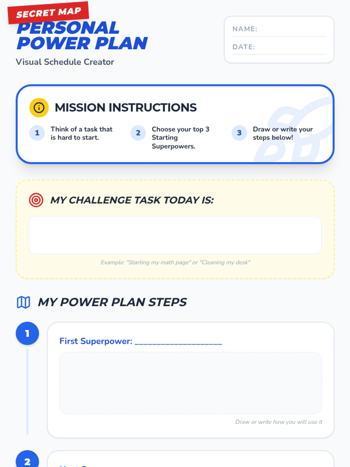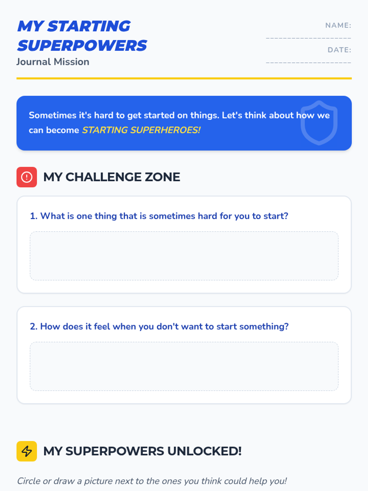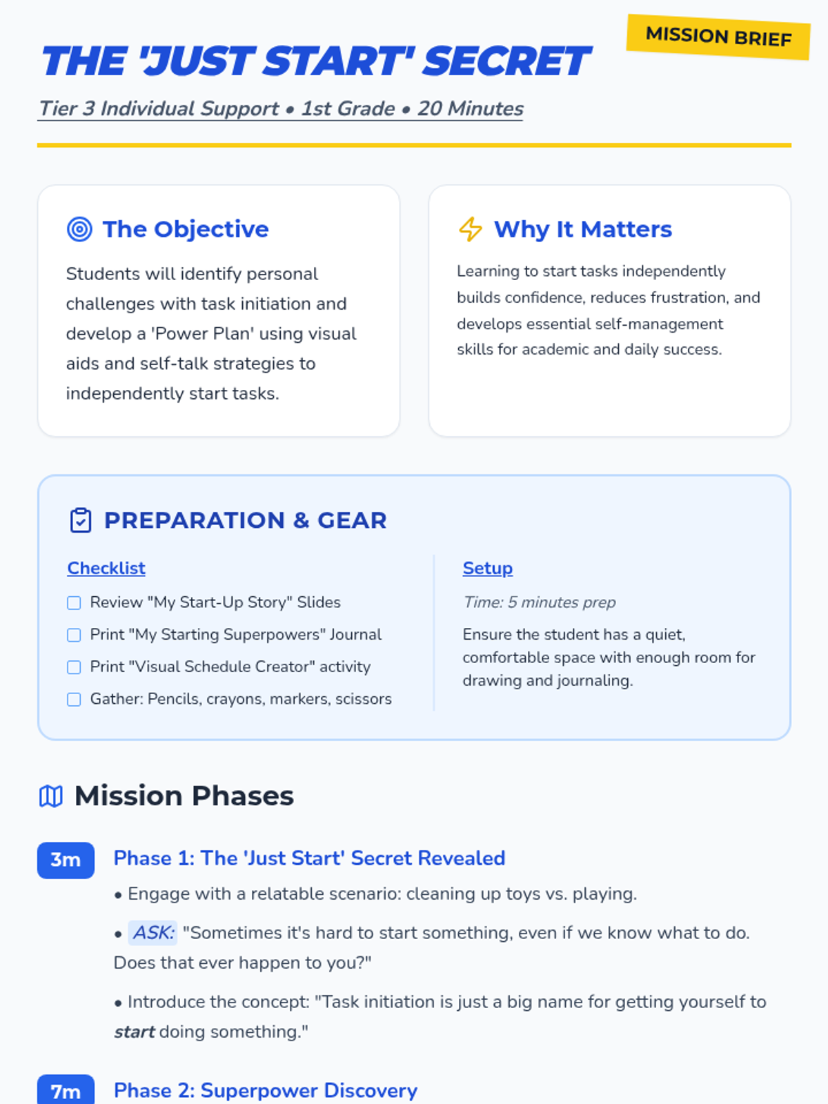 A Tier 3 individual lesson for 1st graders to develop personalized task-initiation strategies. Students identify challenges, discover 'starting superpowers', and create a visual power plan to overcome hurdles.