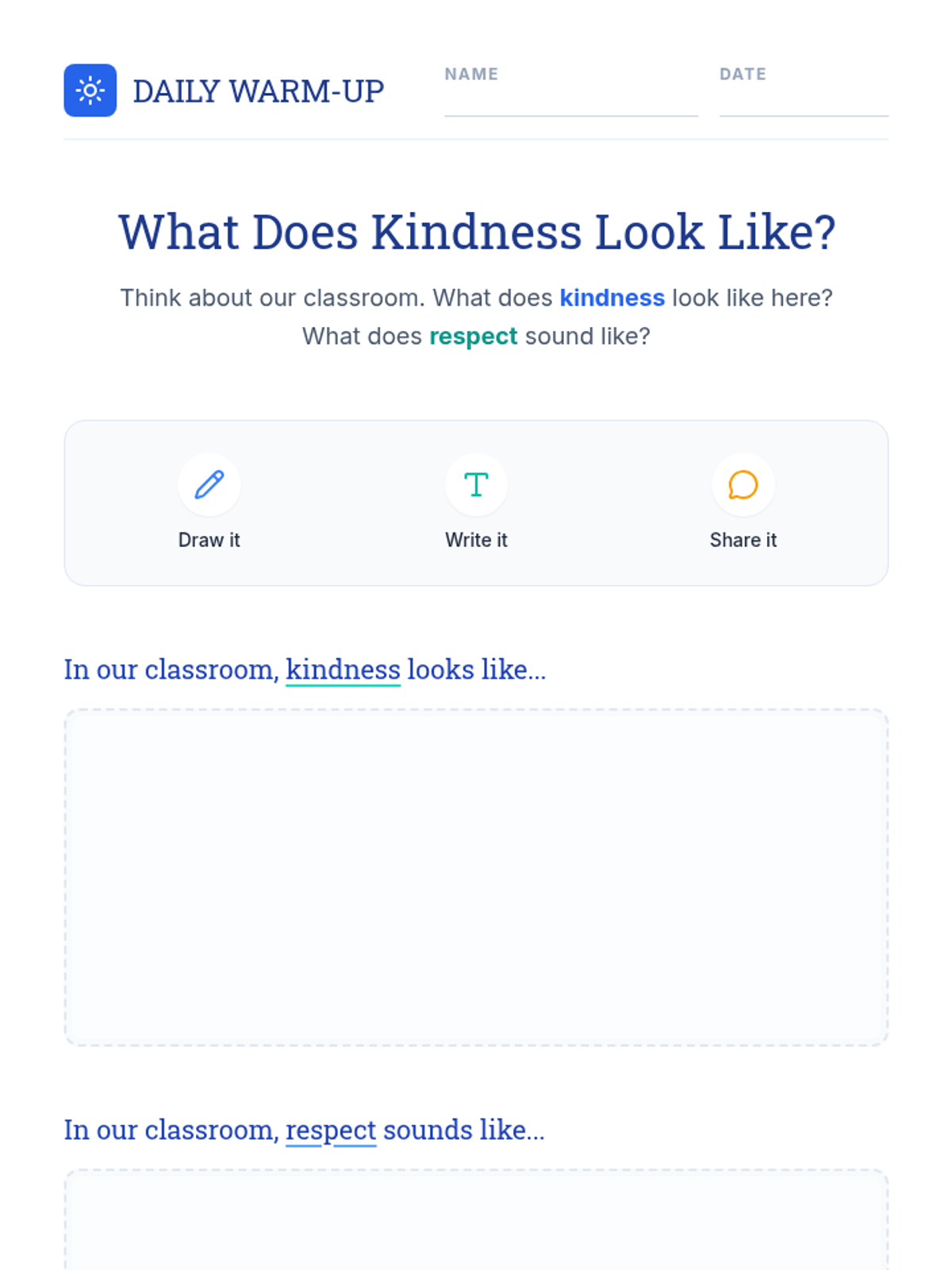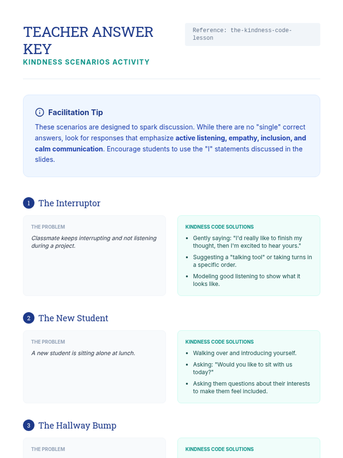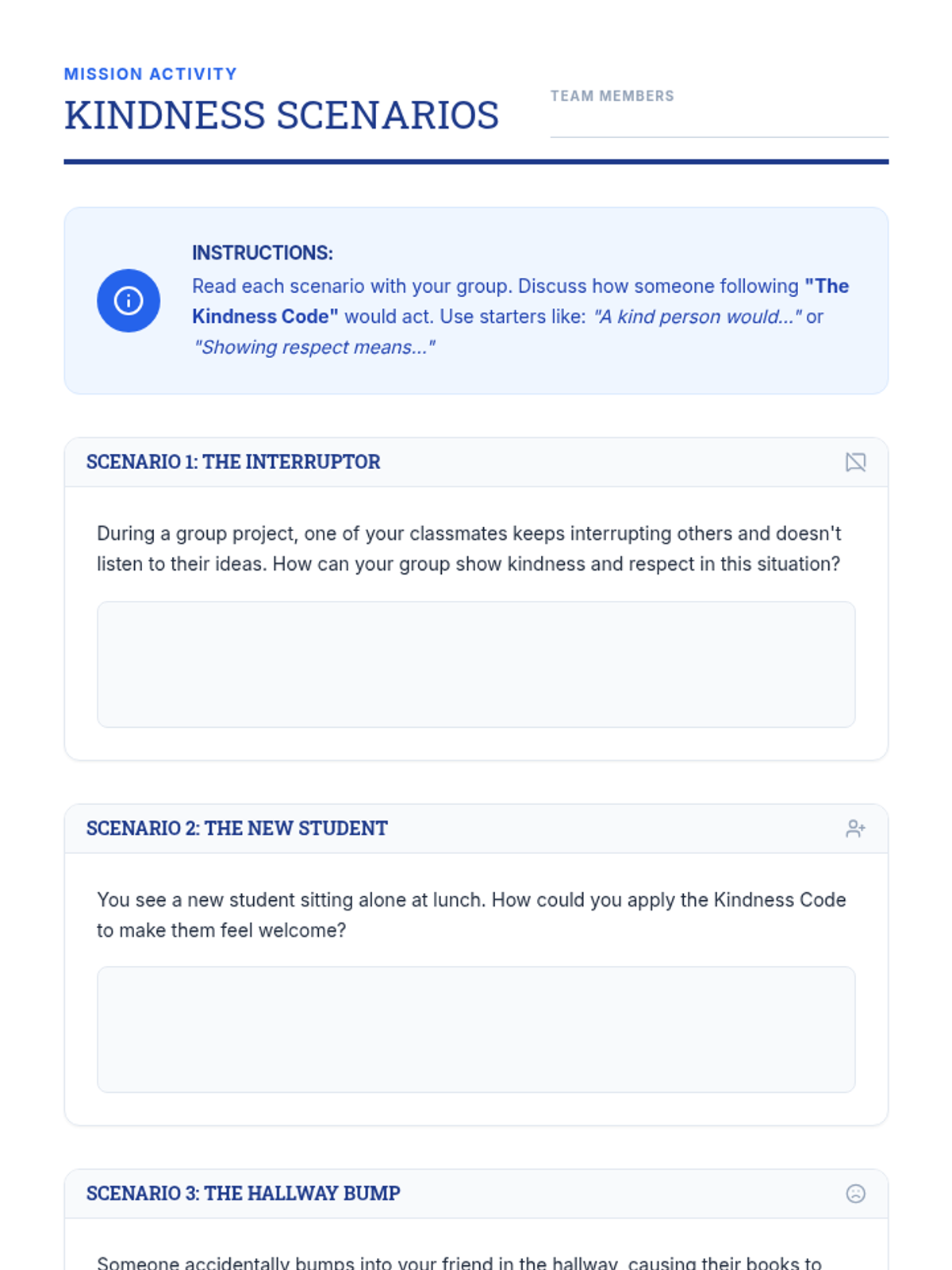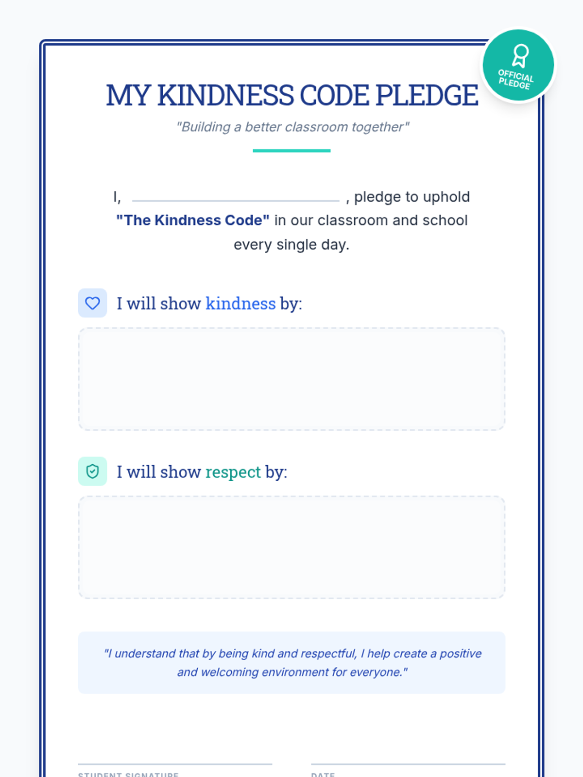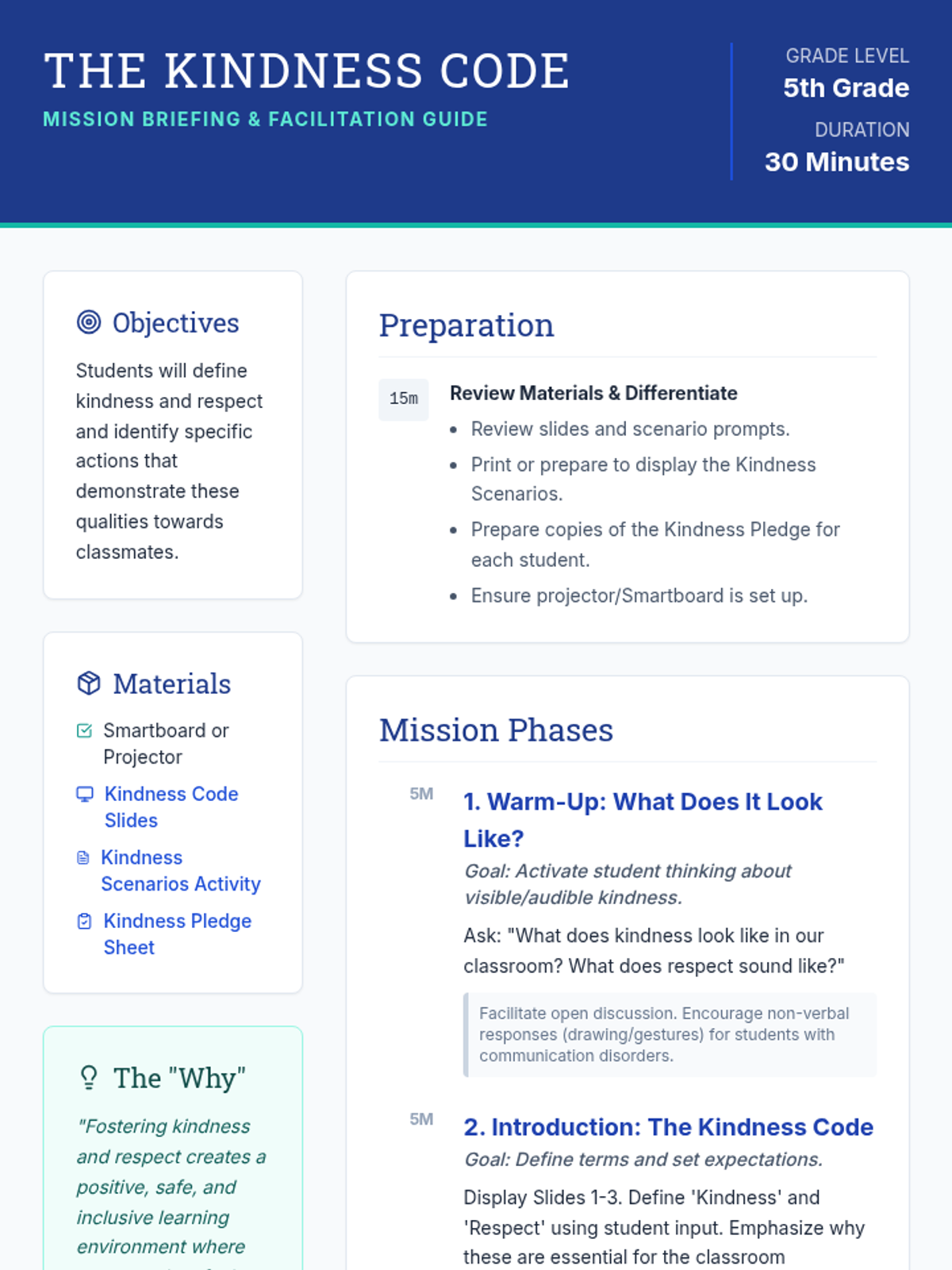 A 30-minute lesson for 5th graders to define and practice kindness and respect through scenarios and a personal pledge.