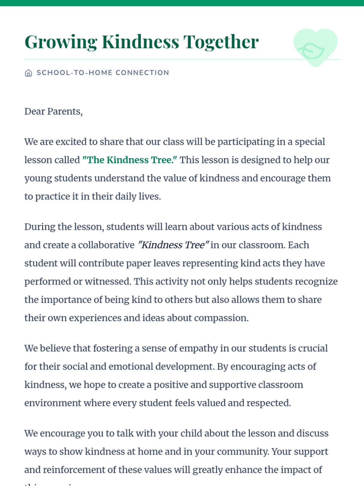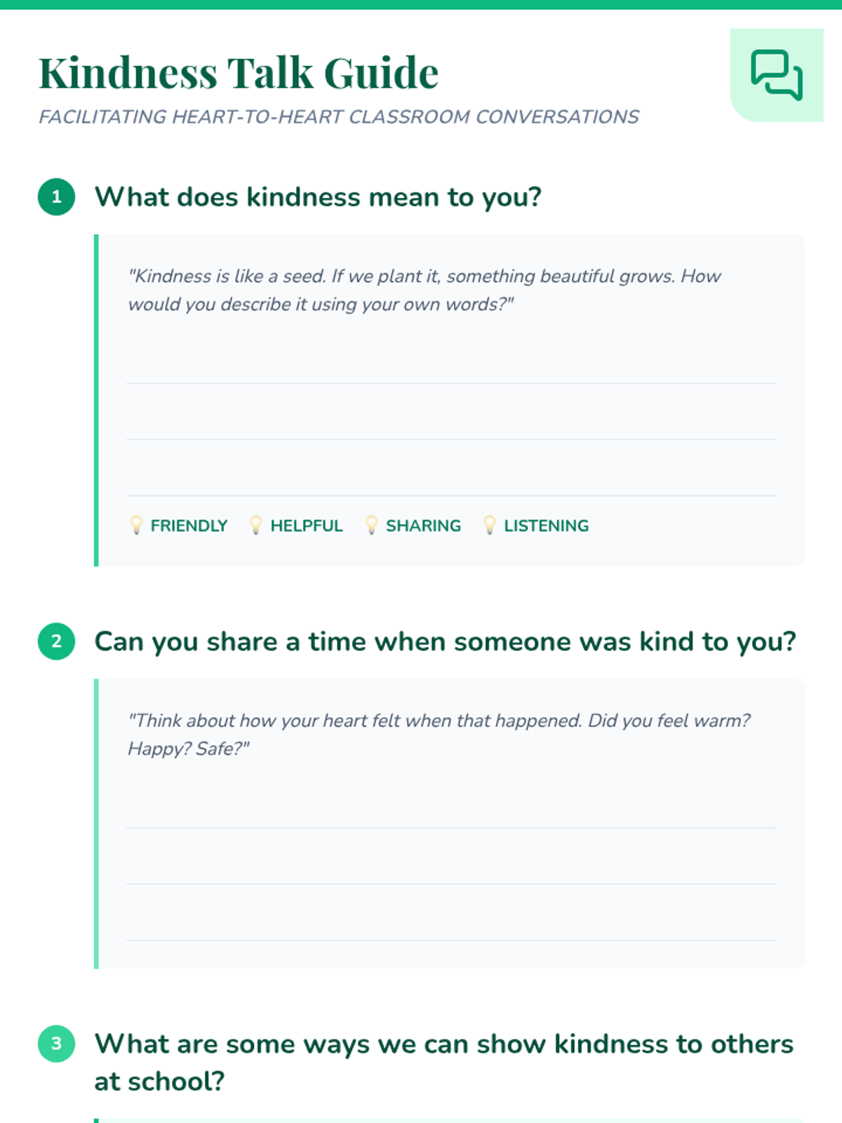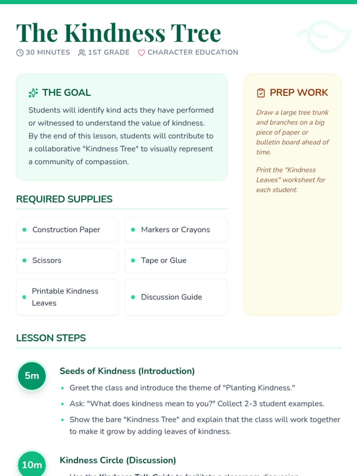 A heartfelt 1st-grade lesson where students explore the concept of kindness through discussion and a collaborative 'Kindness Tree' art project. Students identify and record kind acts to grow a classroom tree of compassion.