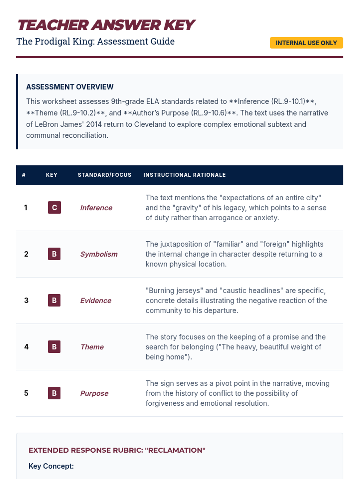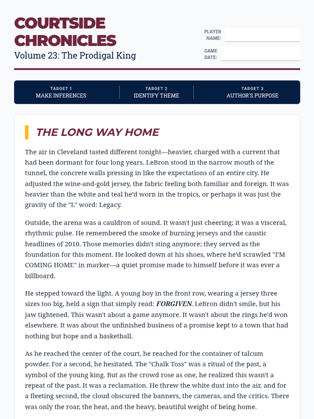 A 9th-grade English Language Arts lesson focusing on making inferences, identifying themes, and analyzing author's purpose through a narrative about LeBron James' return to Cleveland.