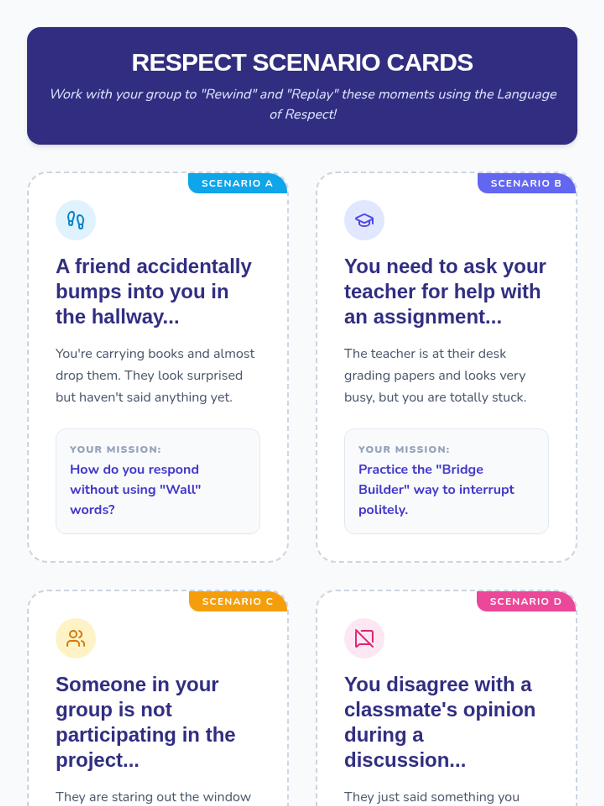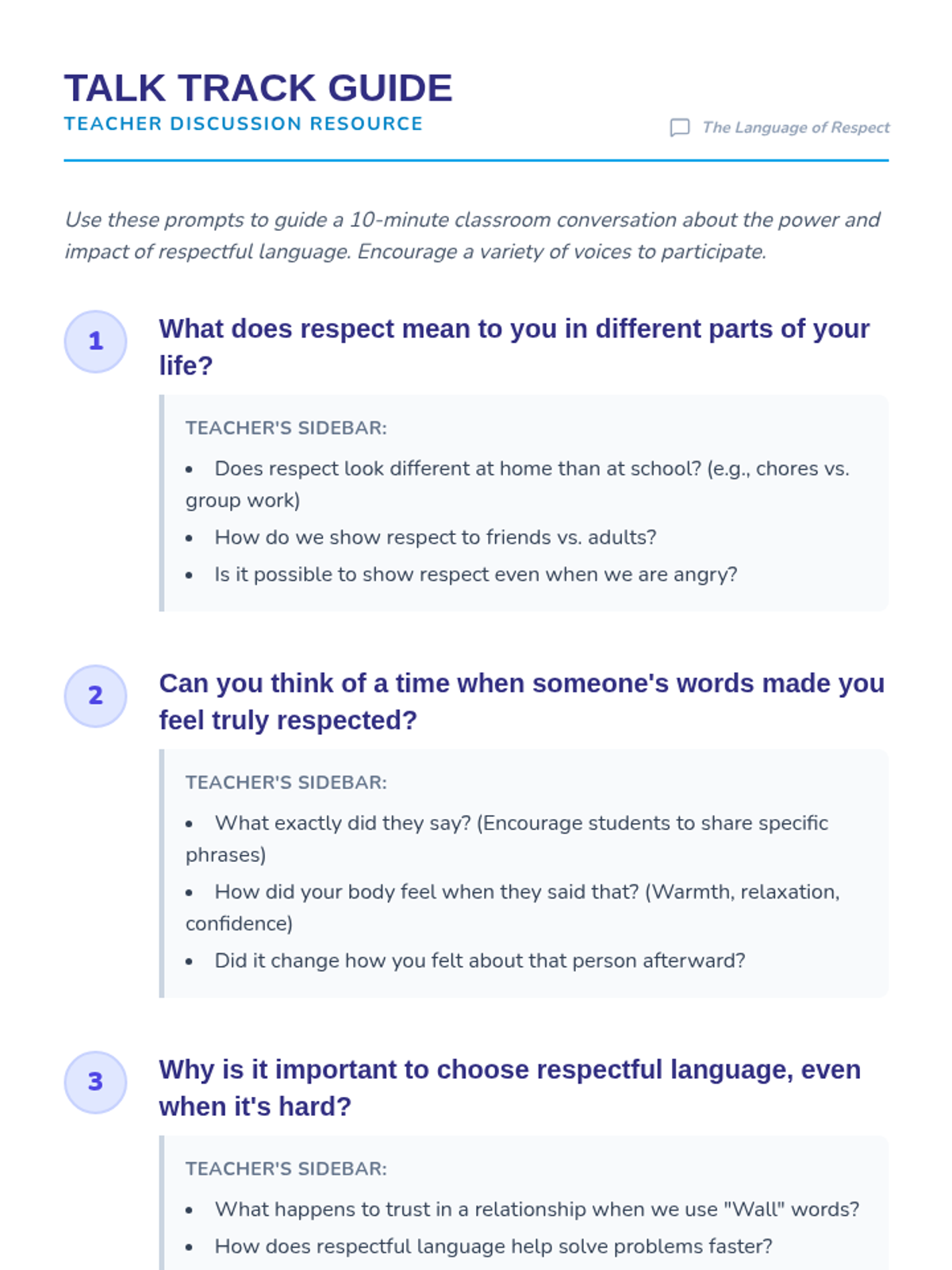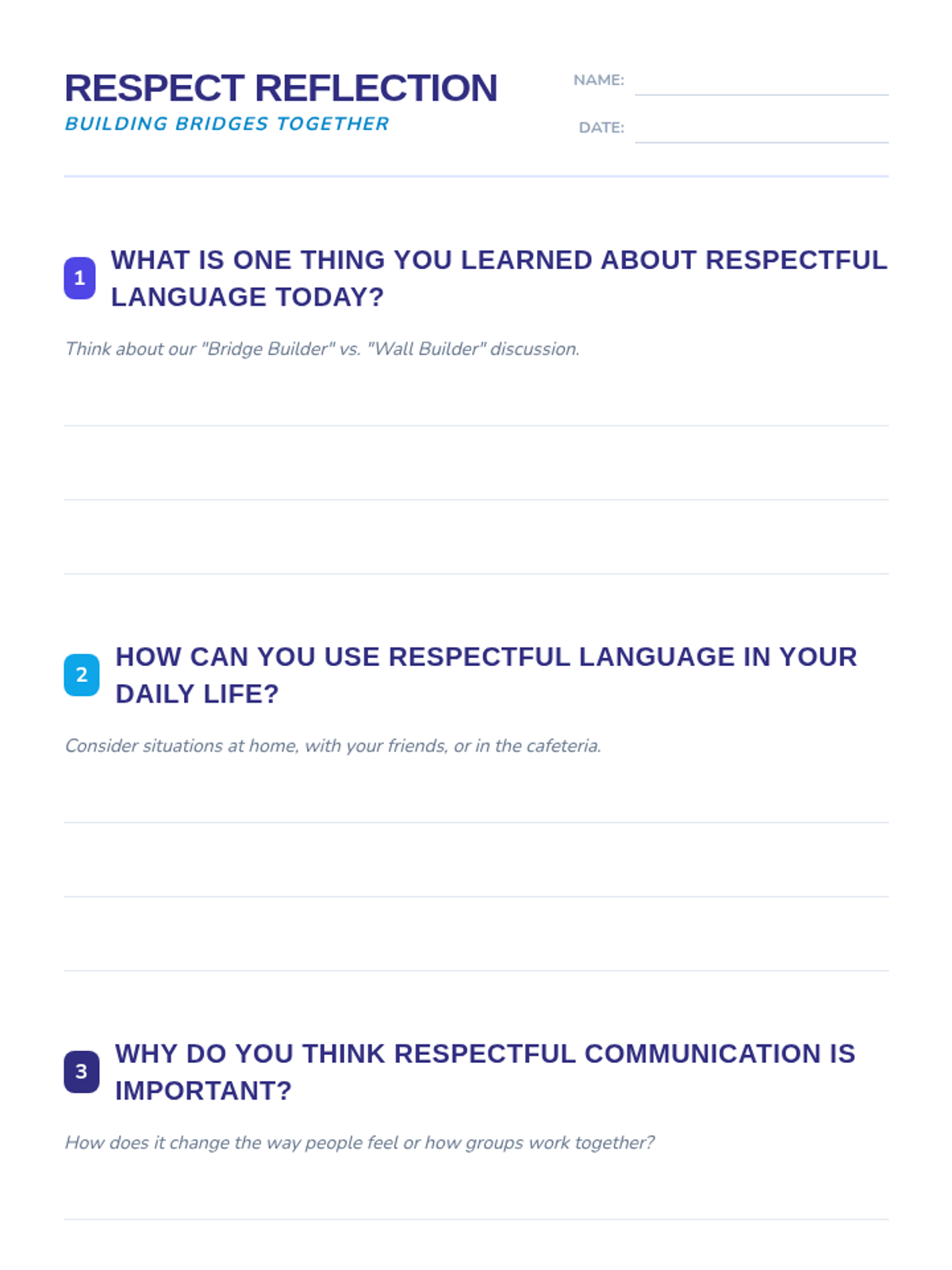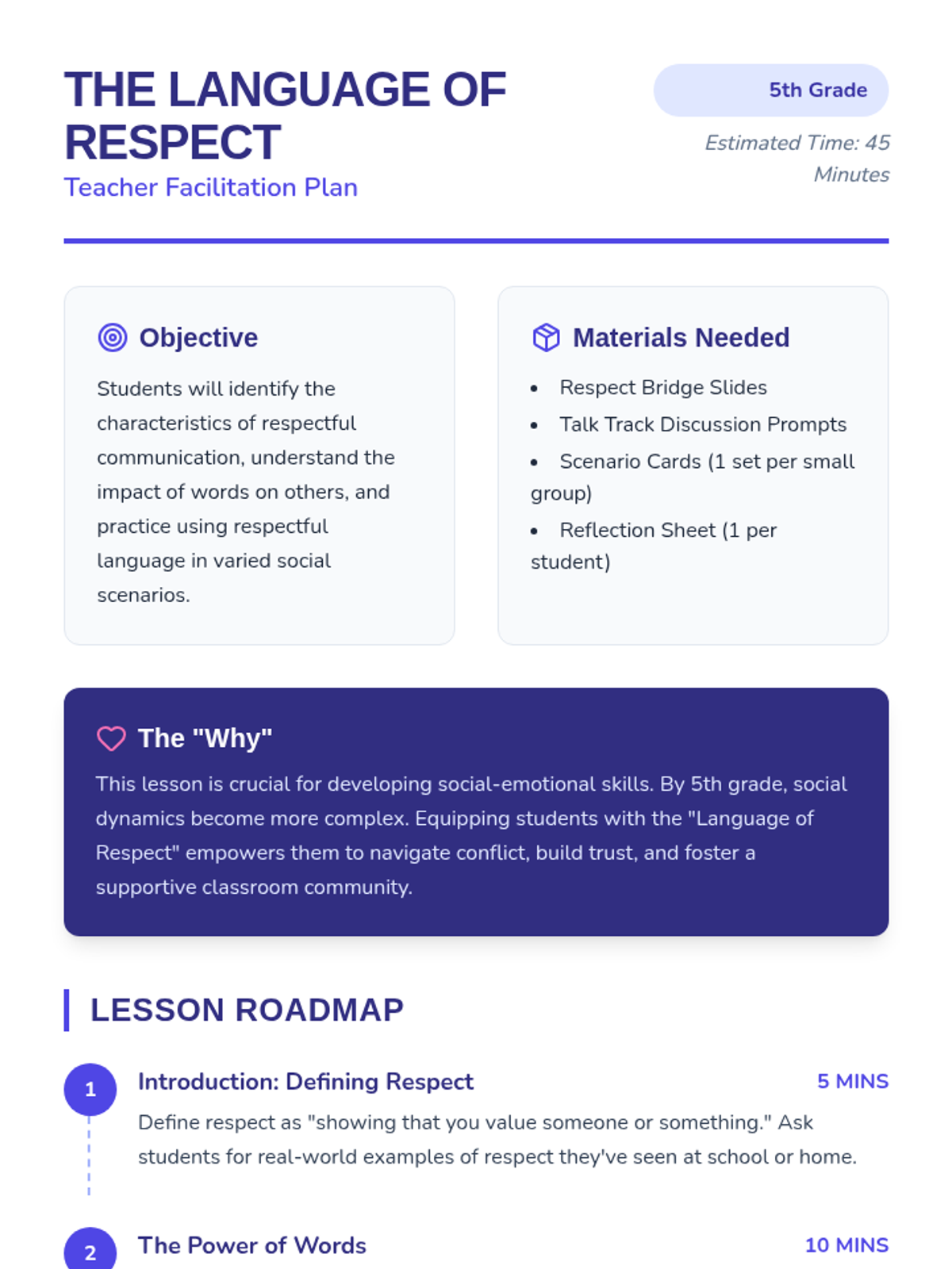A comprehensive 45-minute lesson for 5th graders on the power of respectful communication, featuring role-play scenarios and reflection activities to build a positive classroom culture.