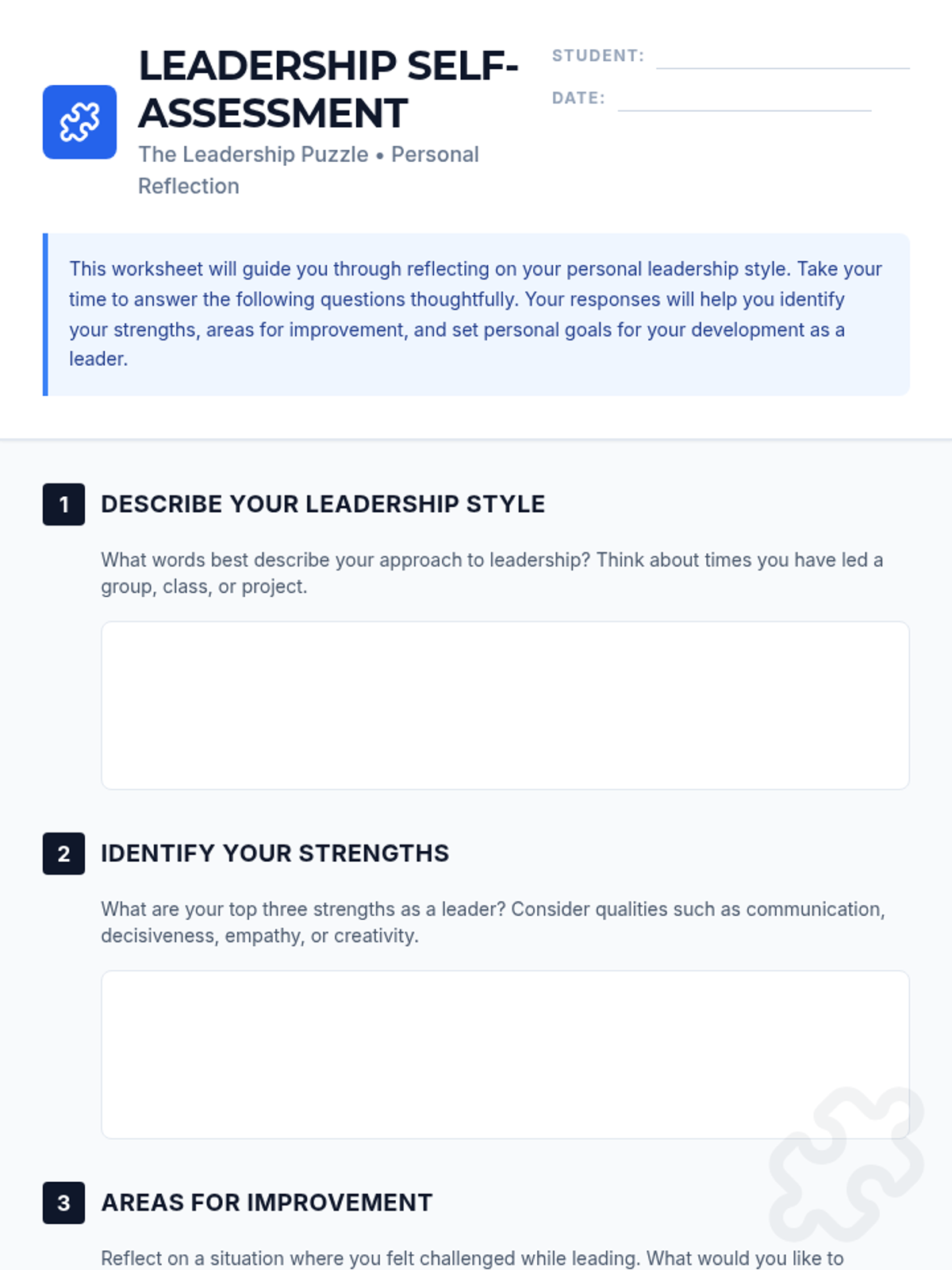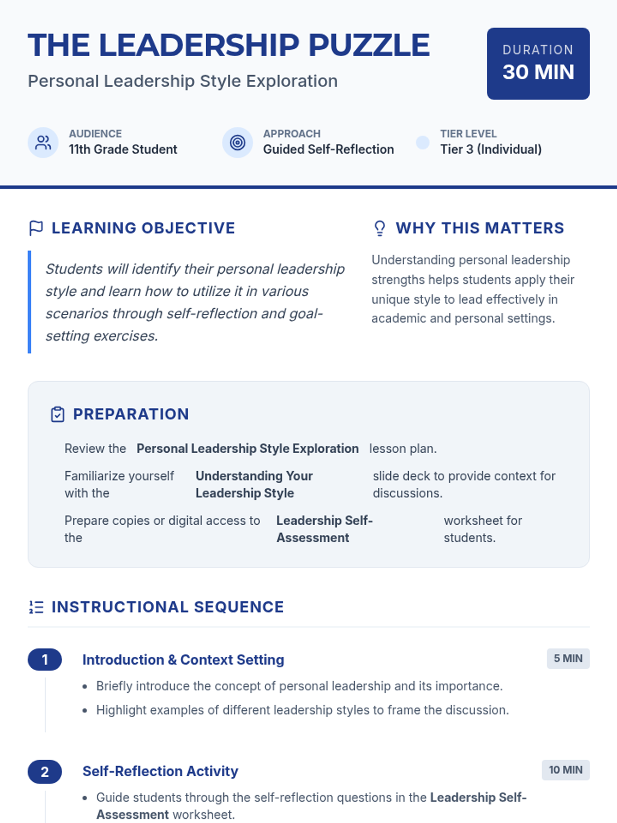 An individual-focused lesson for 11th-grade students to identify their personal leadership styles, strengths, and areas for growth through self-reflection and goal setting.