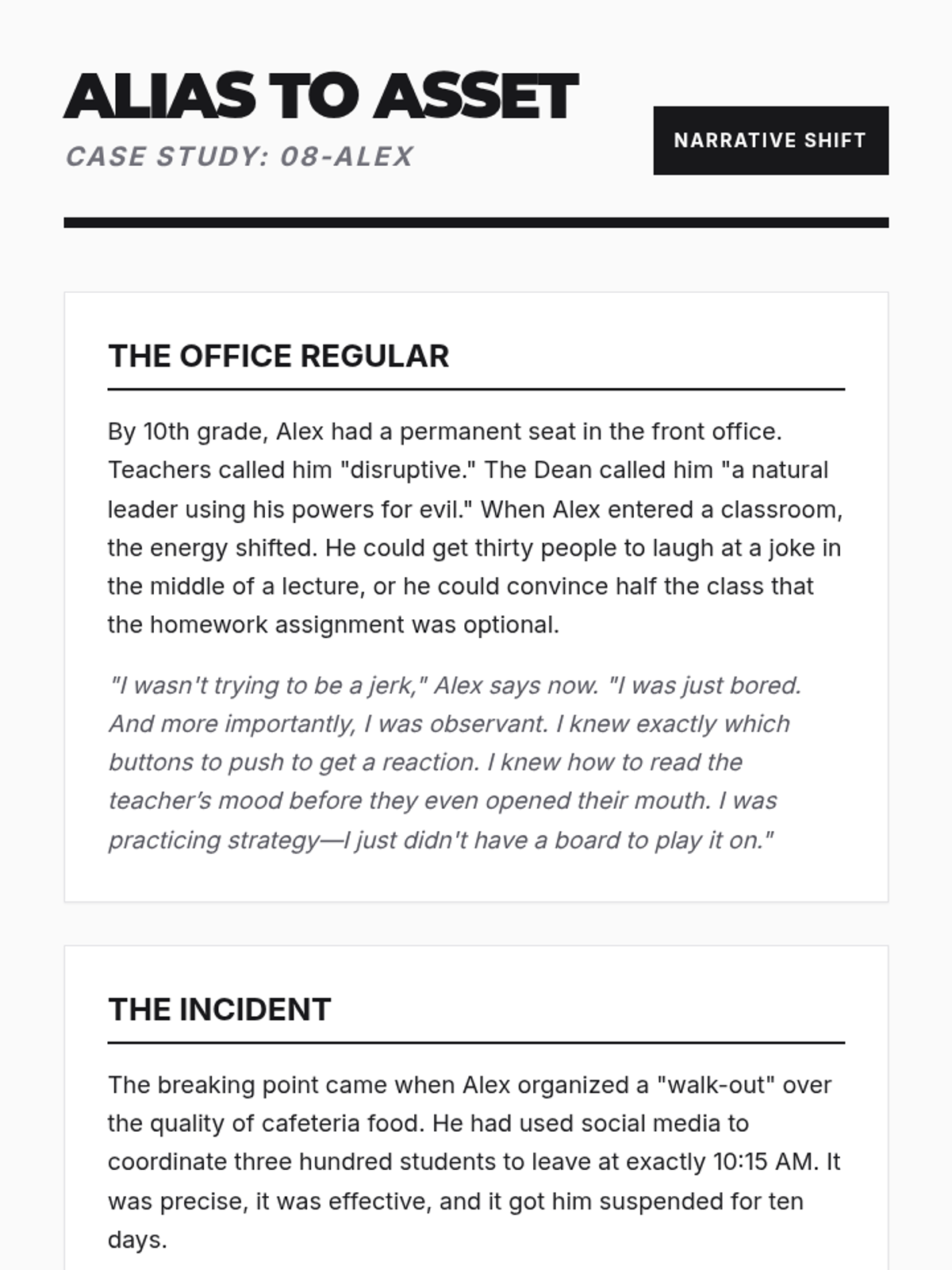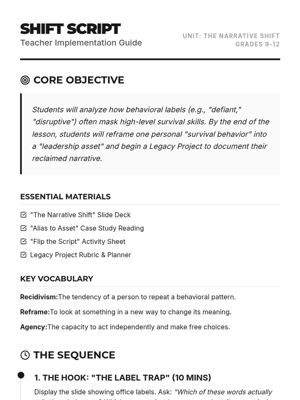 A high-impact identity reframing unit designed for students with behavioral intervention histories. It transforms 'survival traits' into leadership assets through narrative psychology and project-based learning.