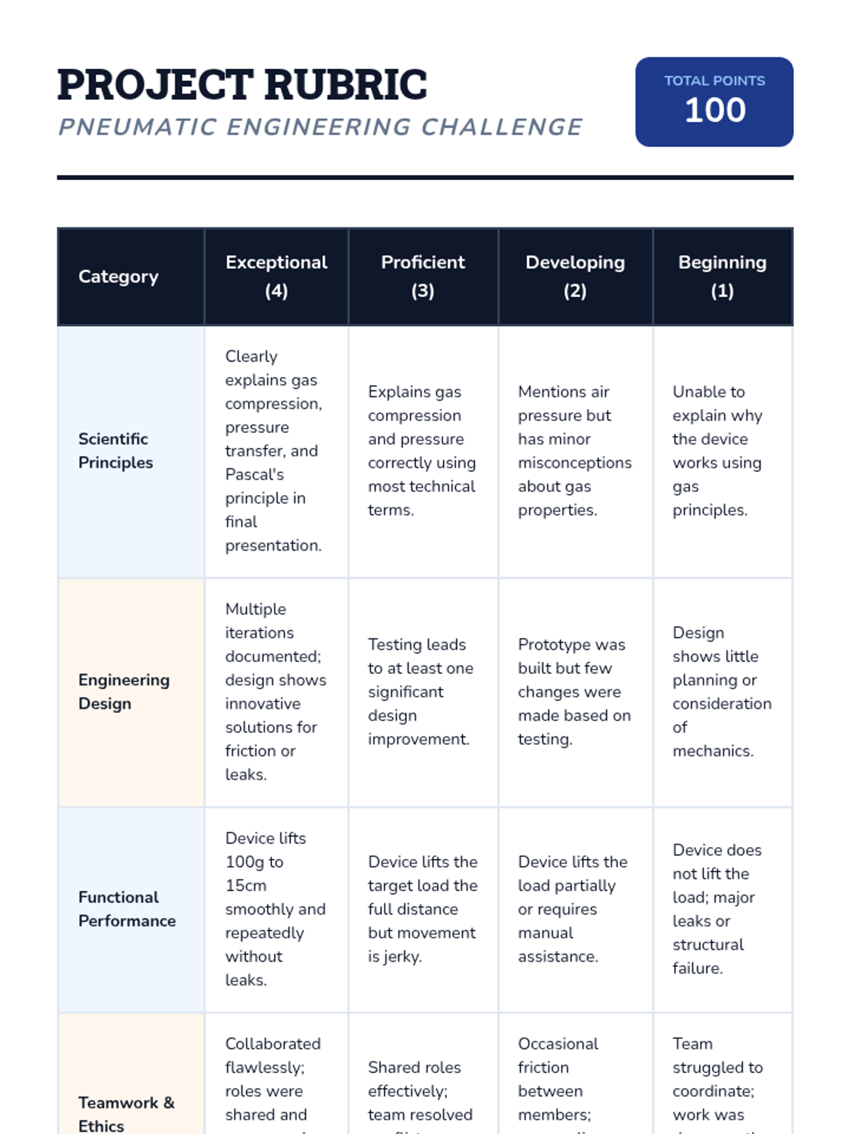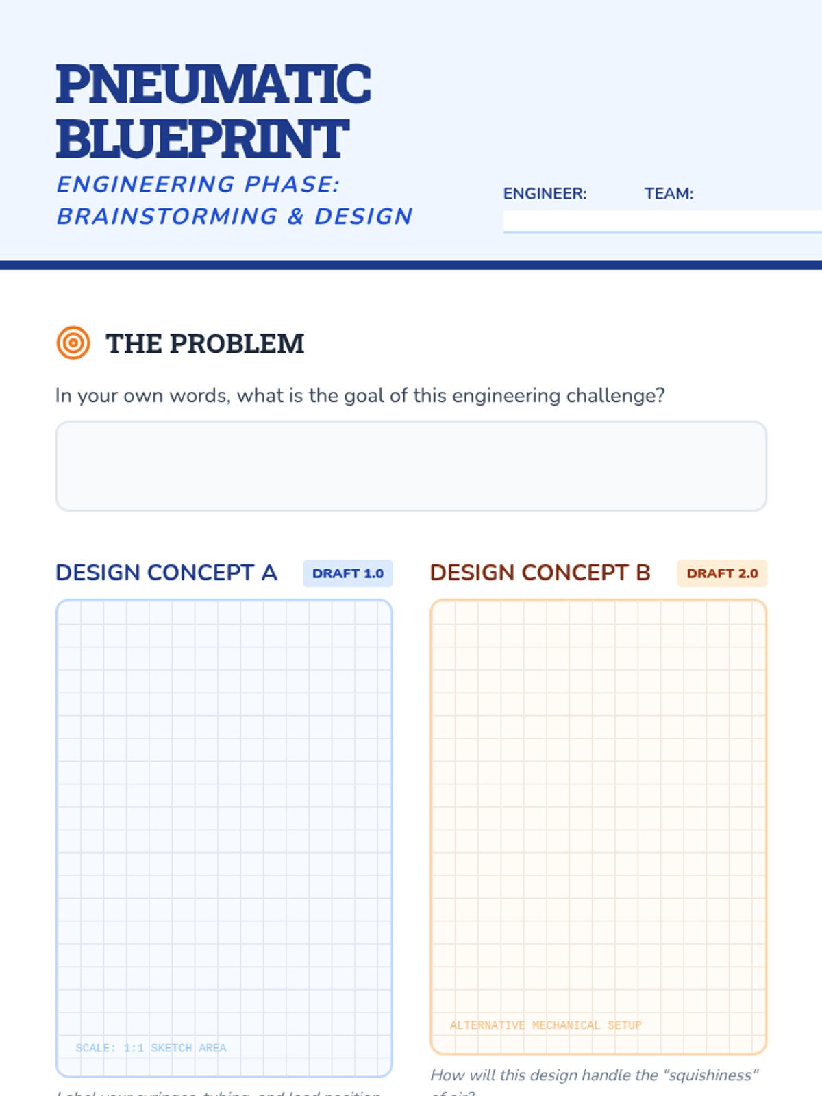Students receive their engineering challenge to build a pneumatic lifter and begin the brainstorming and technical drawing phase.