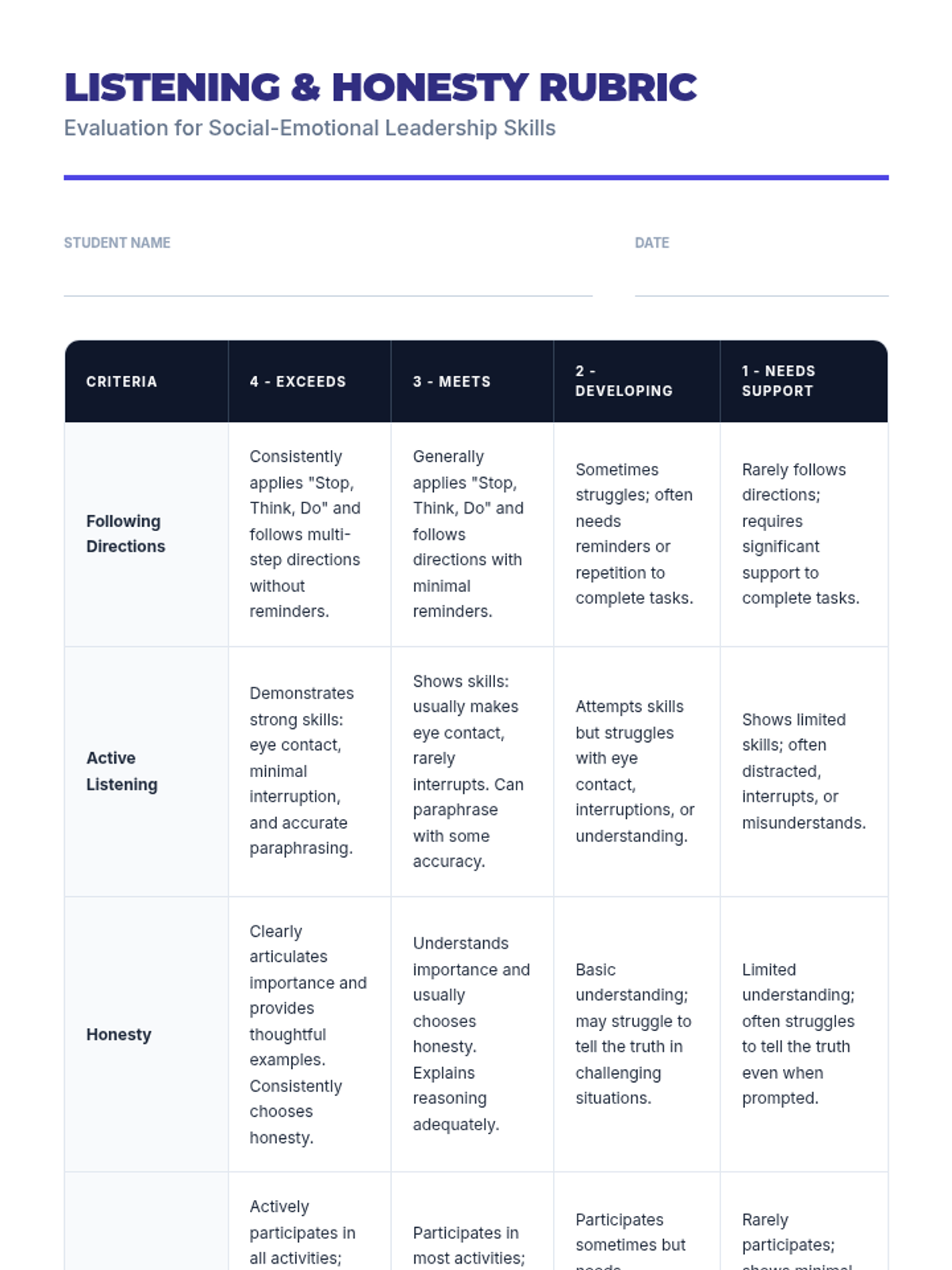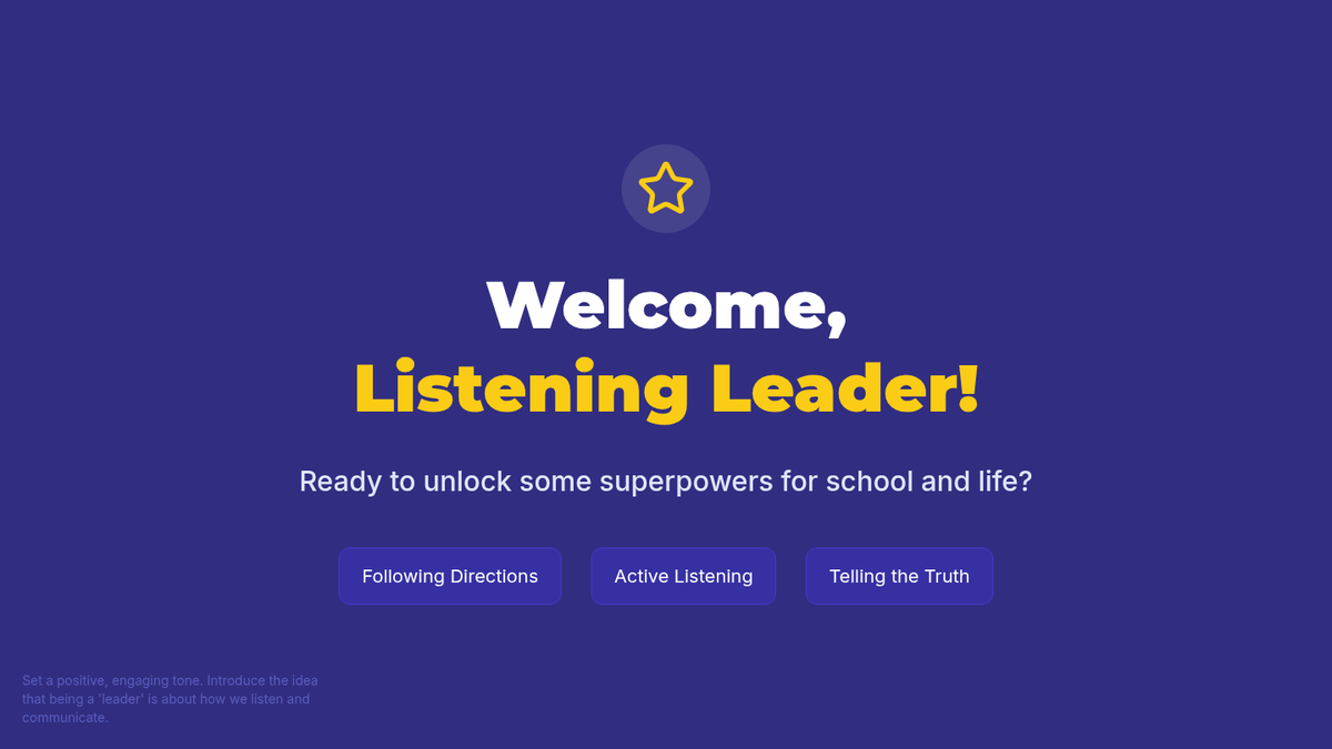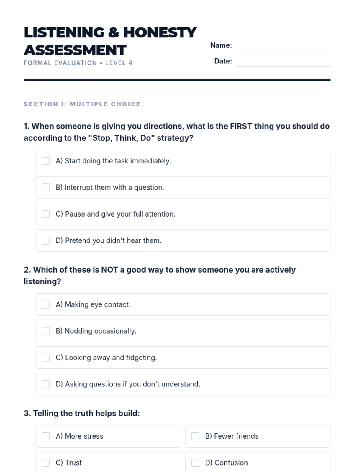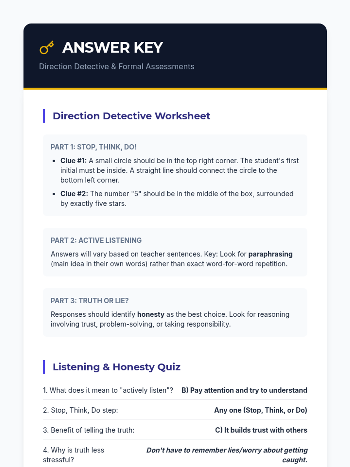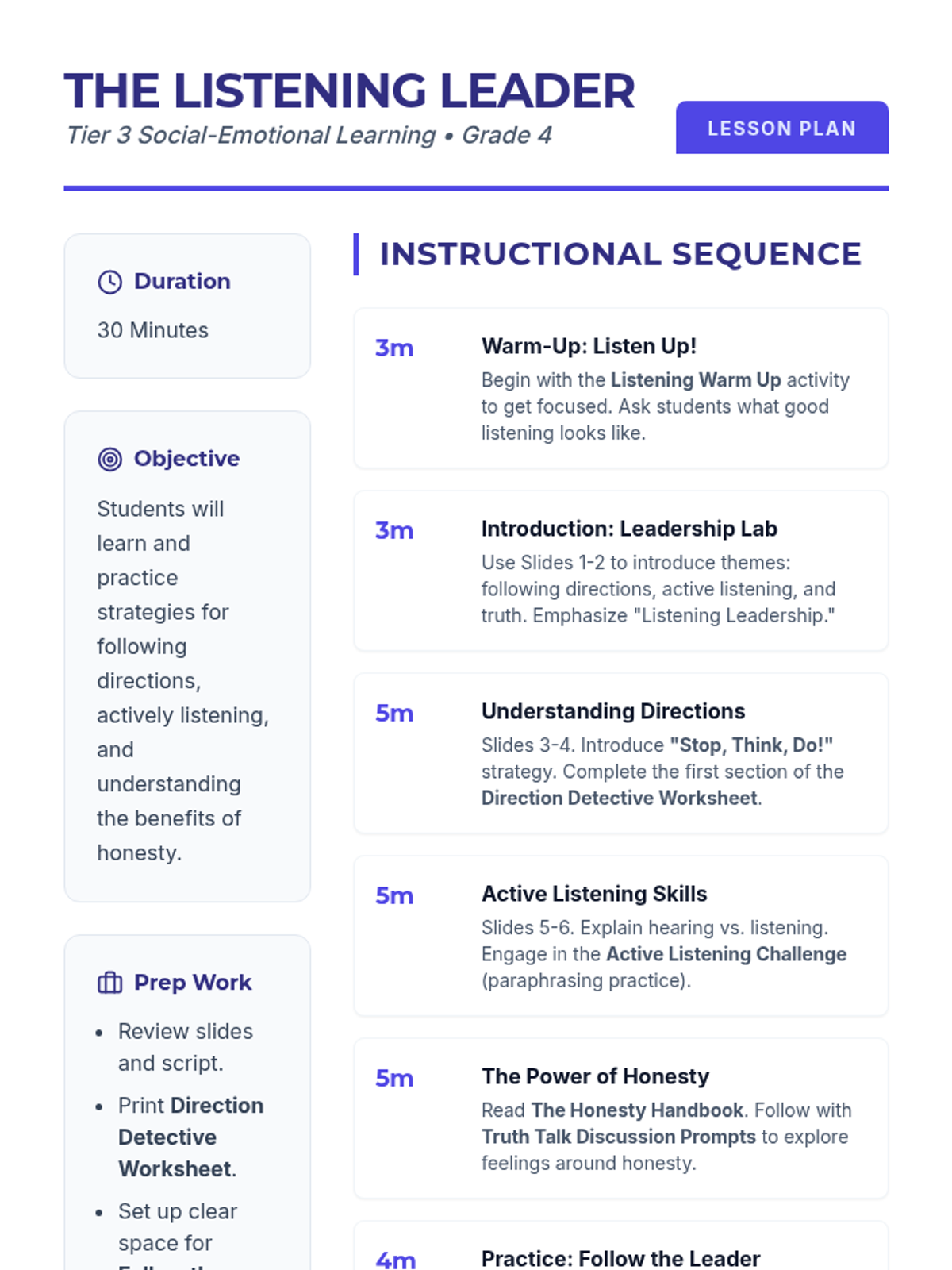 A 30-minute individual Tier 3 lesson for 4th graders focused on active listening, following directions using the 'Stop, Think, Do' strategy, and the importance of honesty in building trust.