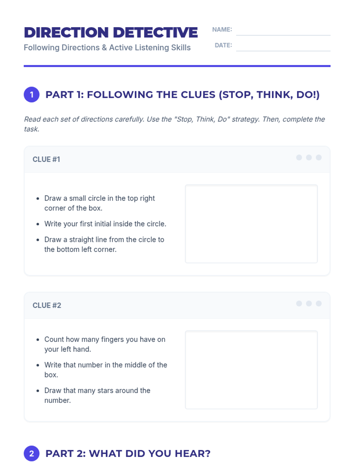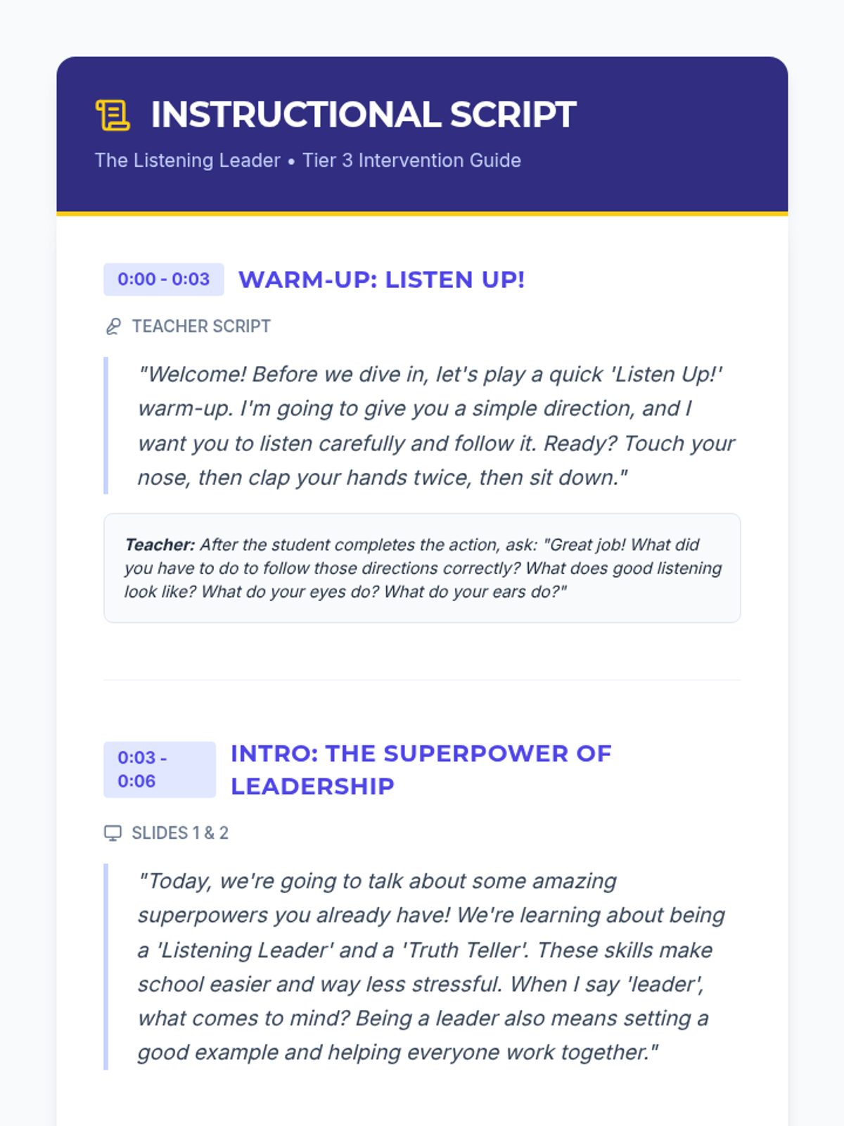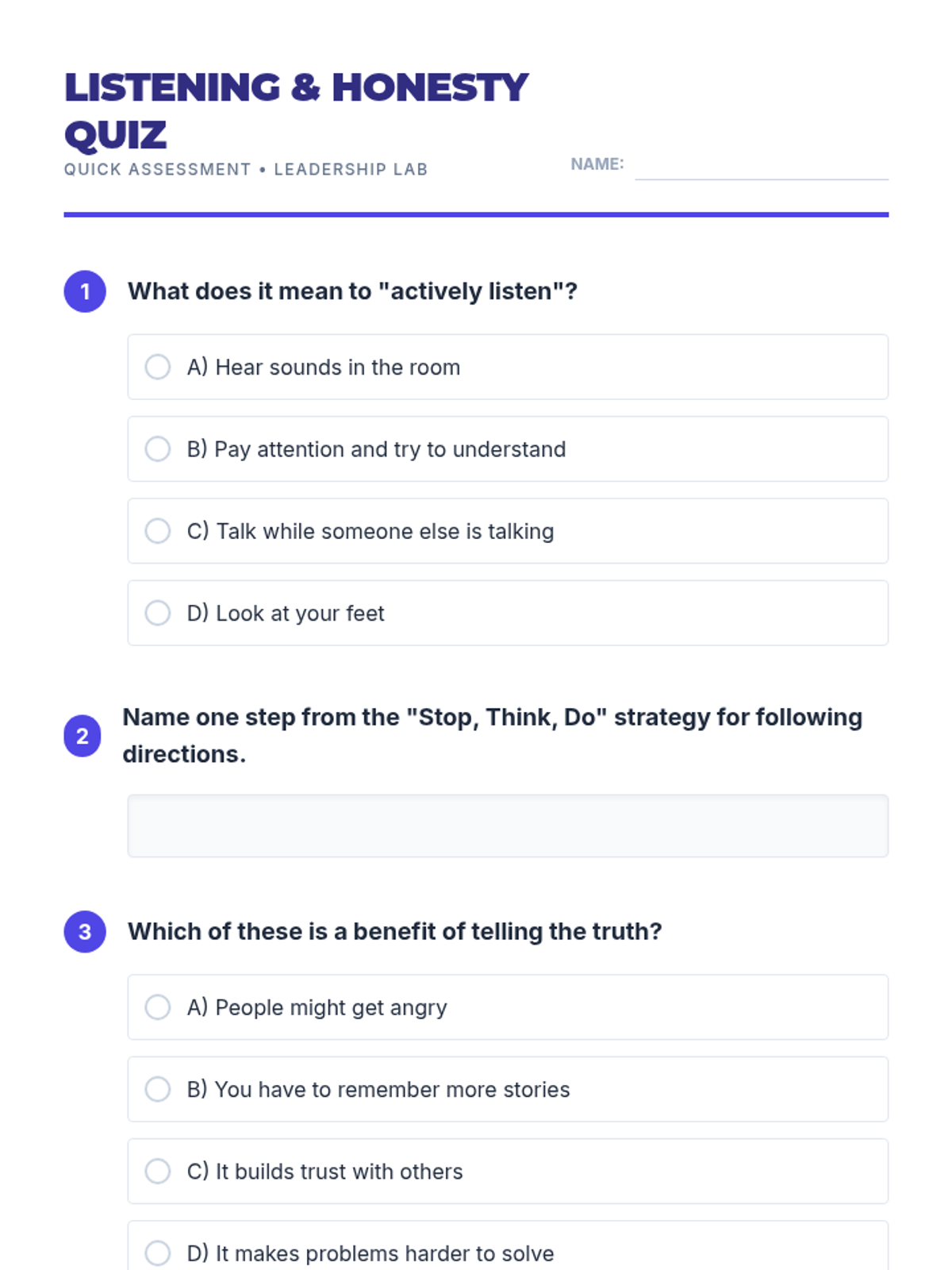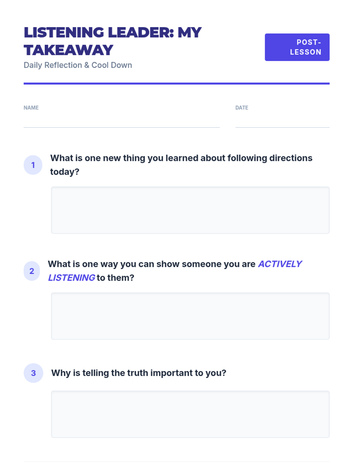 A 30-minute individual Tier 3 lesson for 4th graders focused on active listening, following directions using the 'Stop, Think, Do' strategy, and the importance of honesty in building trust.