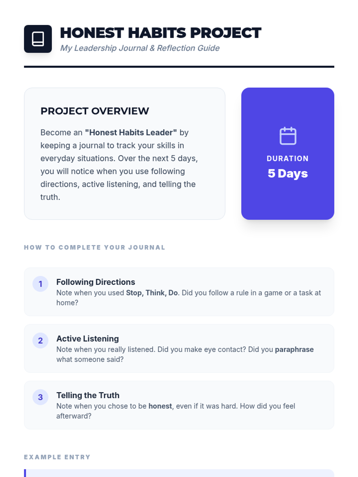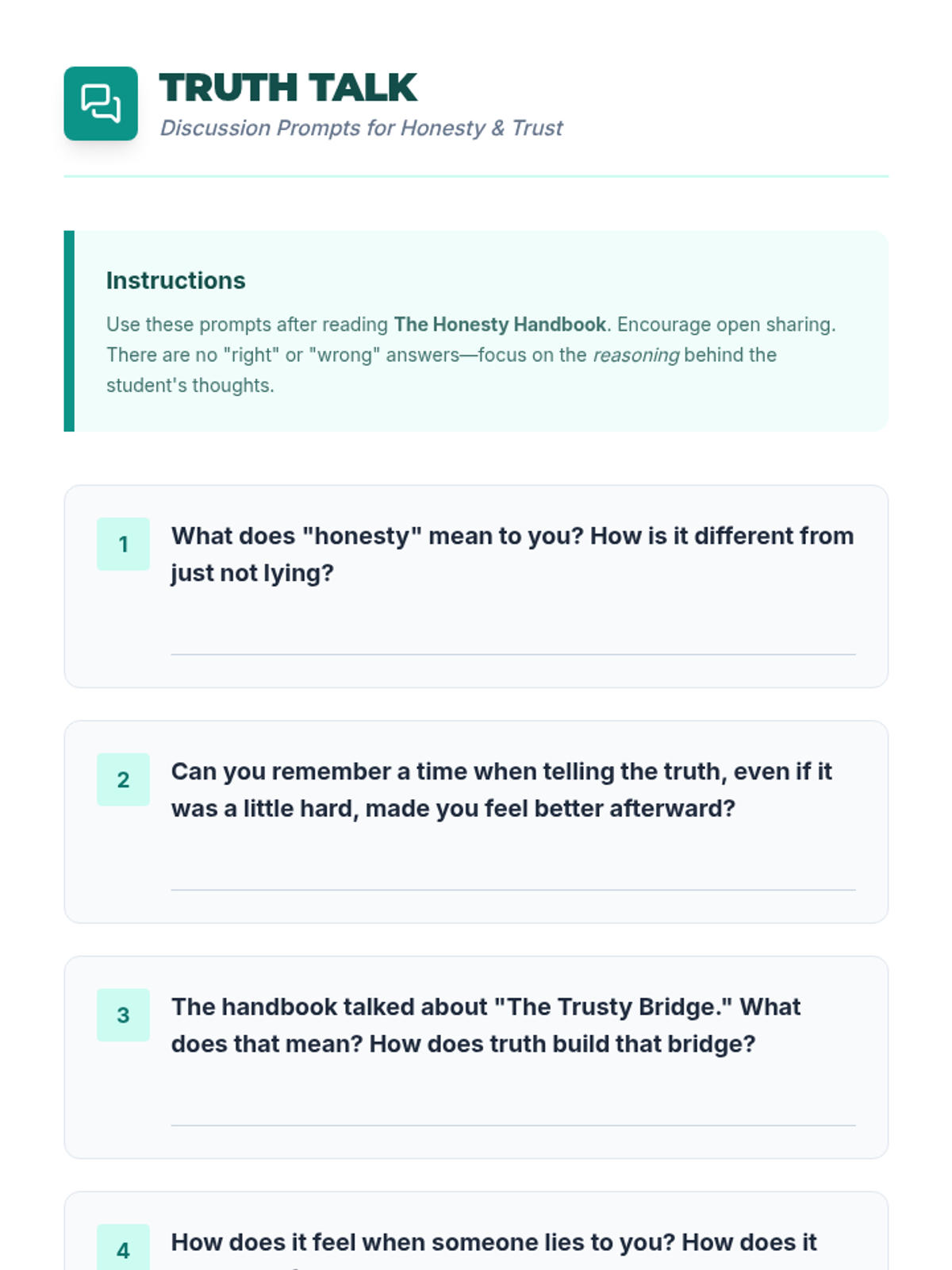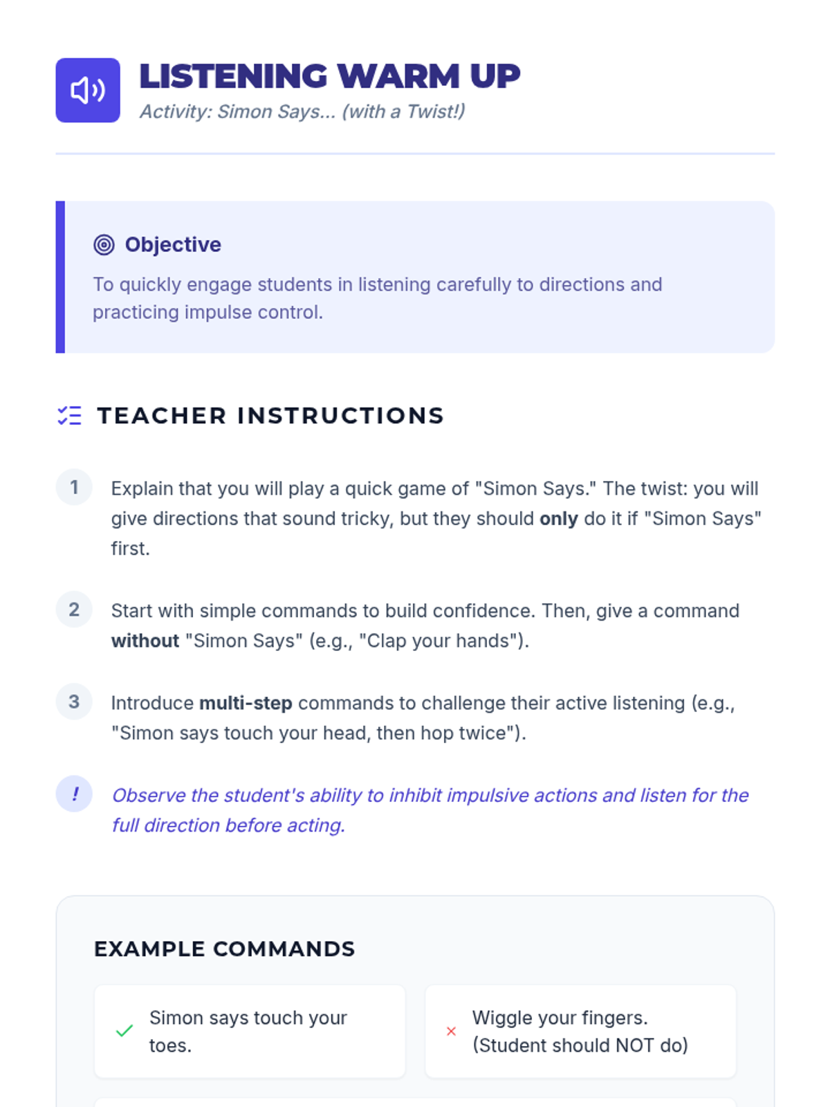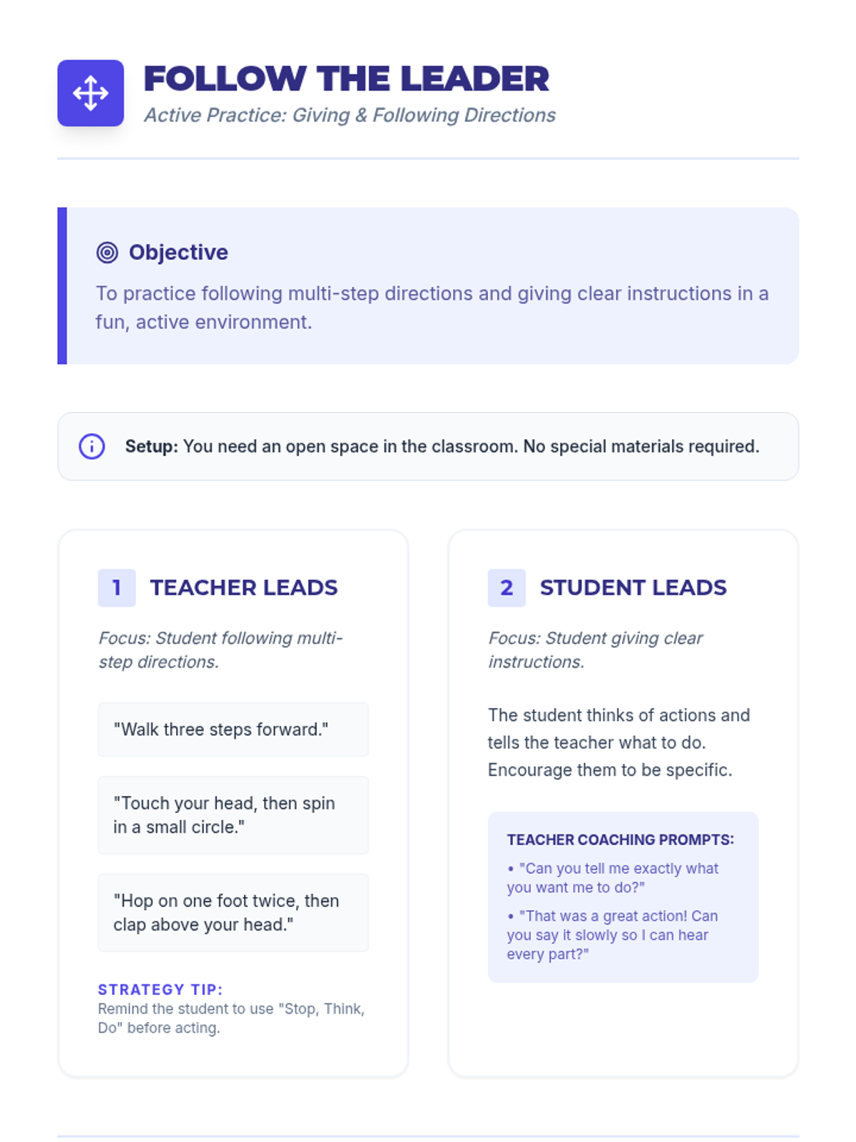 A 30-minute individual Tier 3 lesson for 4th graders focused on active listening, following directions using the 'Stop, Think, Do' strategy, and the importance of honesty in building trust.