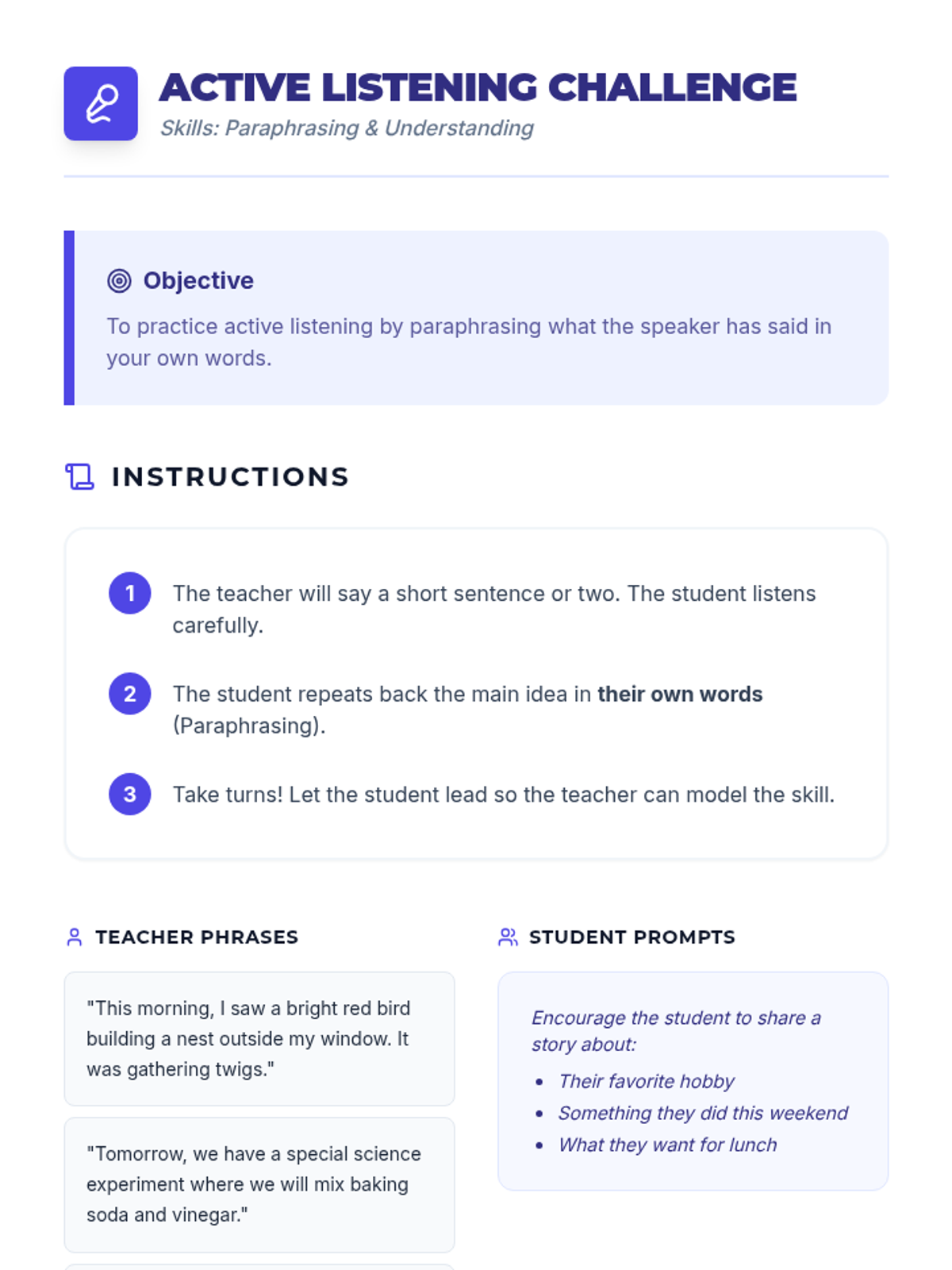Developing advanced listening skills, including paraphrasing and validating others' perspectives in English.