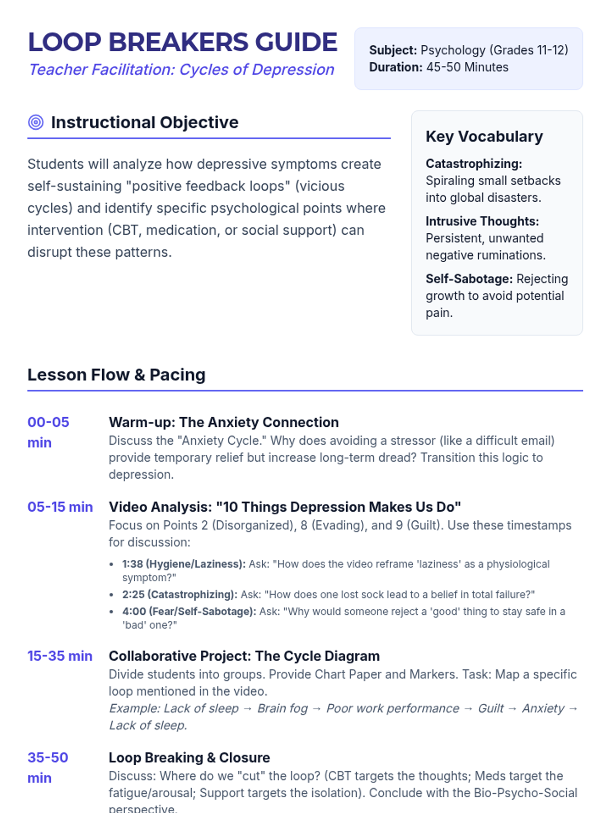 Students investigate the psychological mechanisms of depressive disorders, focusing on how avoidance and negative feedback loops sustain and worsen symptoms. They will analyze a video to map out specific behavioral cycles and identify points of therapeutic intervention.