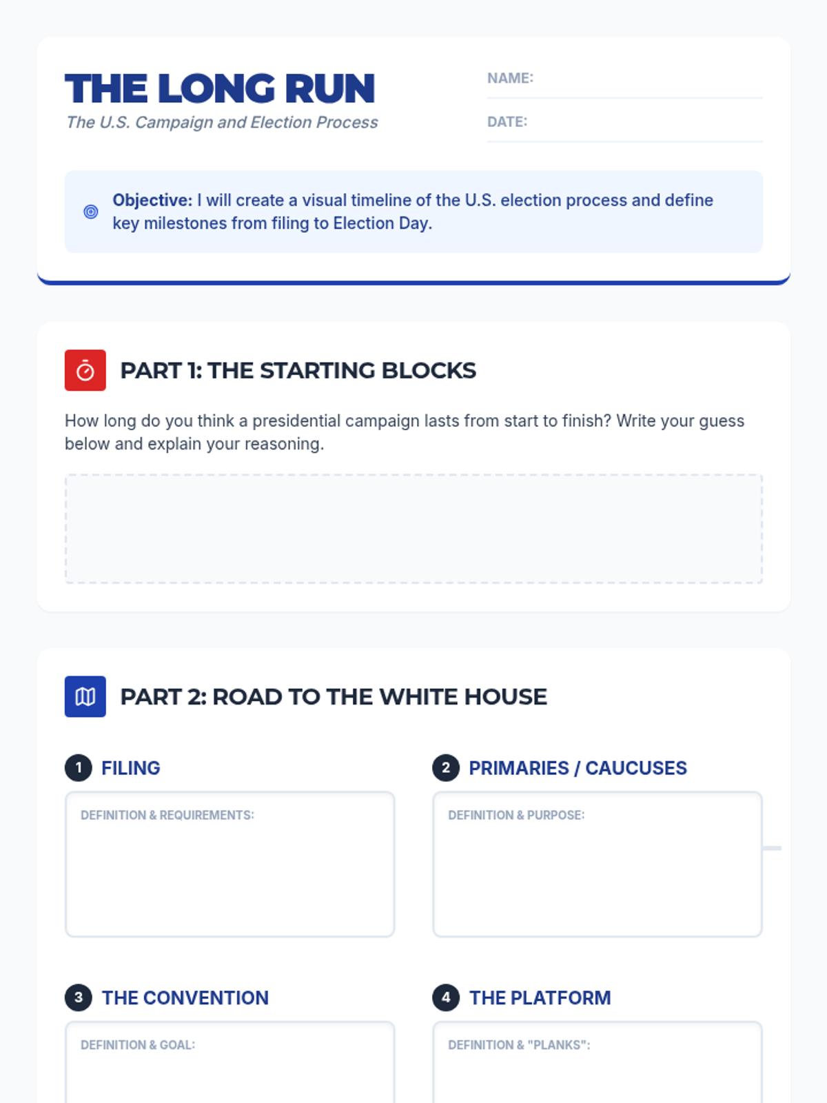 Students will trace the journey of a political candidate from their initial announcement to Election Day. They will use a video to identify key milestones like filing, primaries, and conventions, while defining essential vocabulary related to the U.S. campaign process.