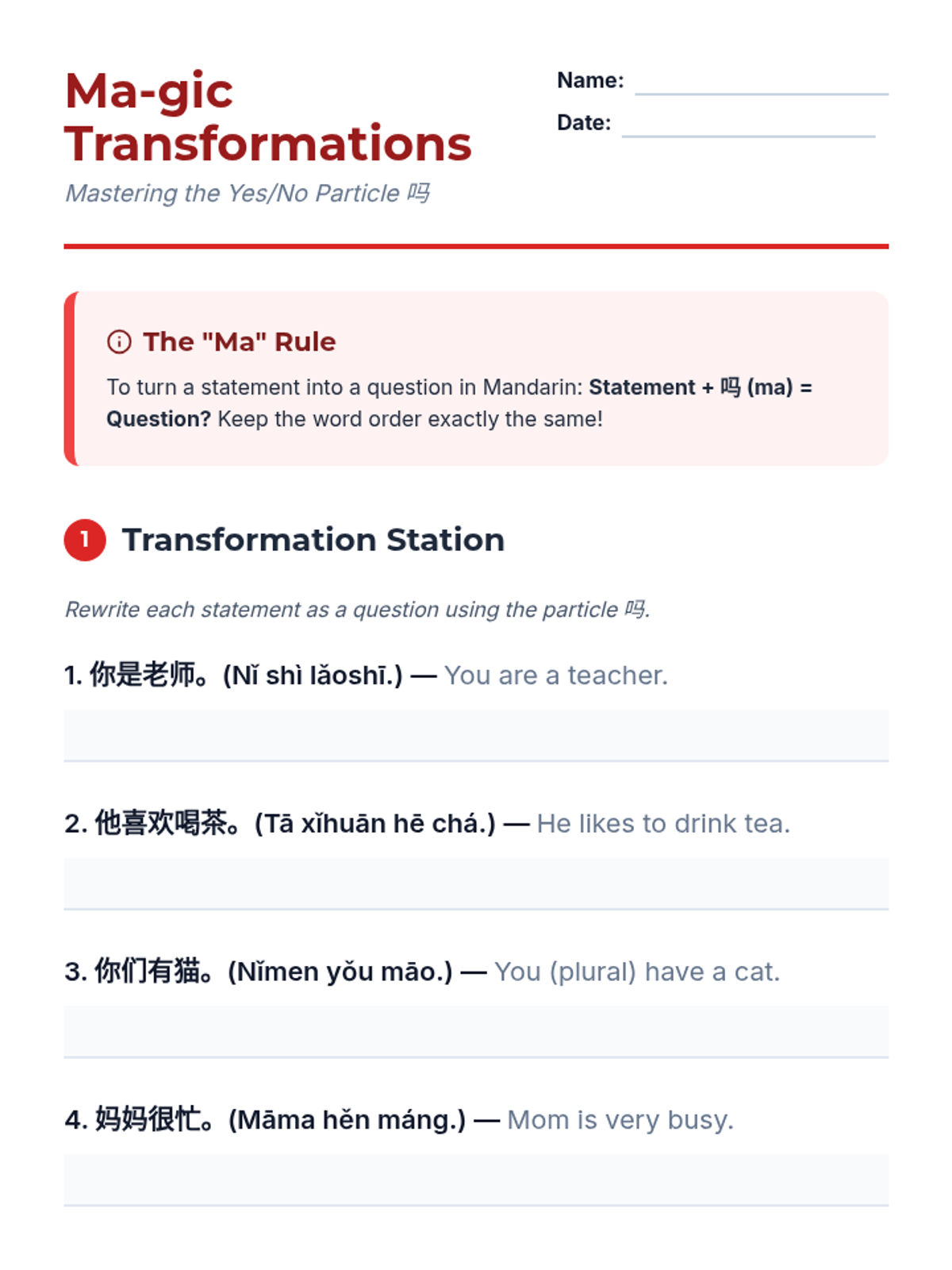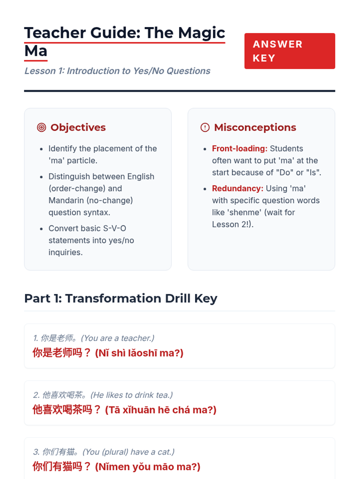 Students learn to transform declarative statements into yes/no questions using the 'ma' particle. The lesson emphasizes that Mandarin maintains statement word order even when asking questions.