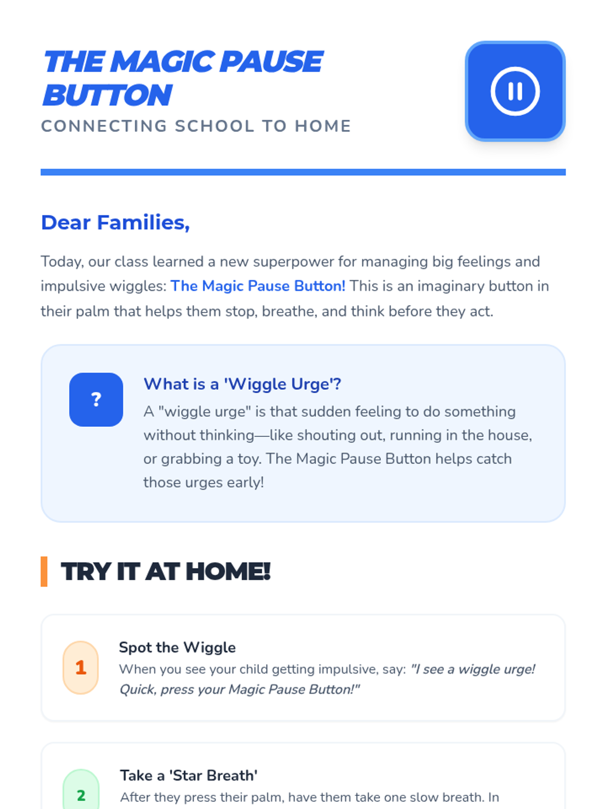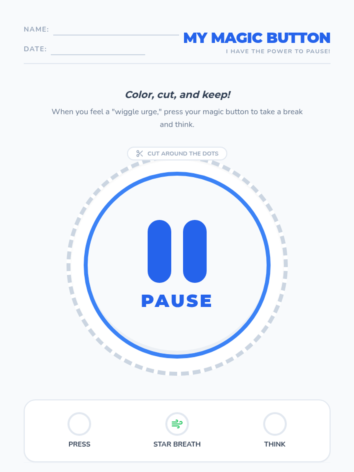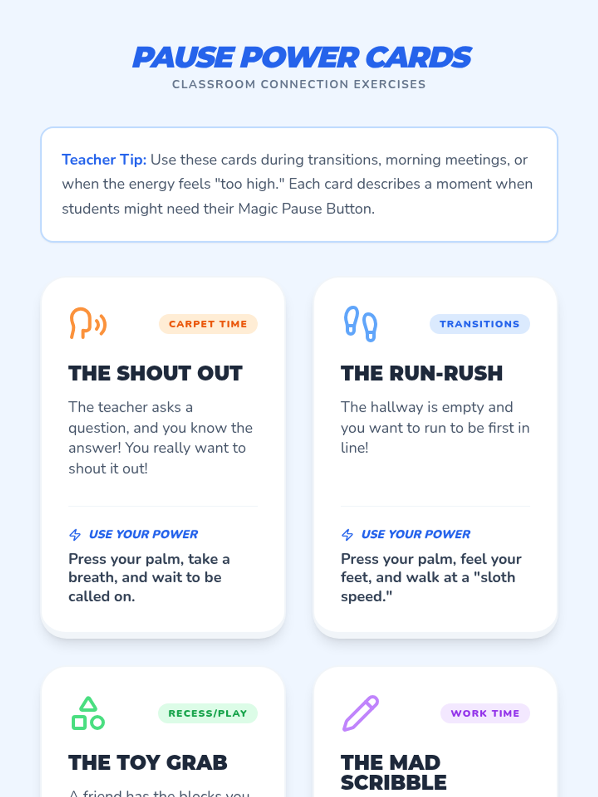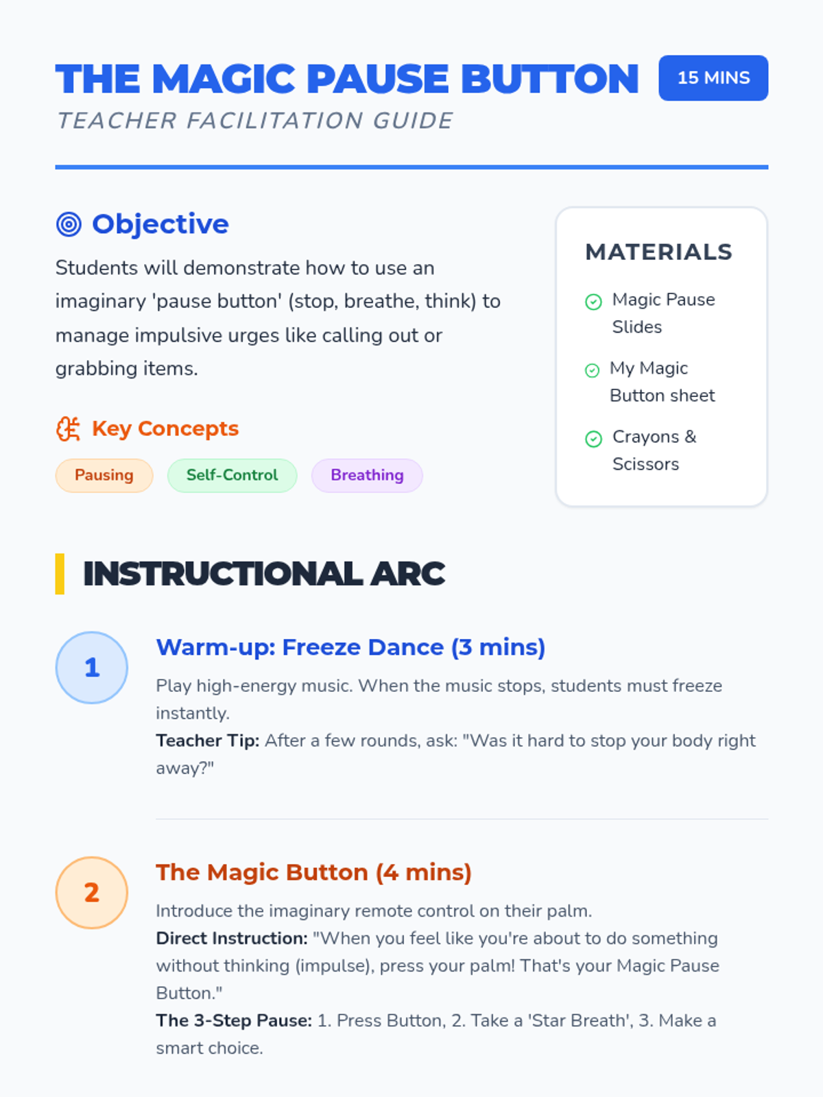 A high-energy, 15-minute social-emotional learning lesson for 1st graders focused on self-control and impulse management through the metaphor of a 'Magic Pause Button'. Students learn to stop, breathe, and think before acting.