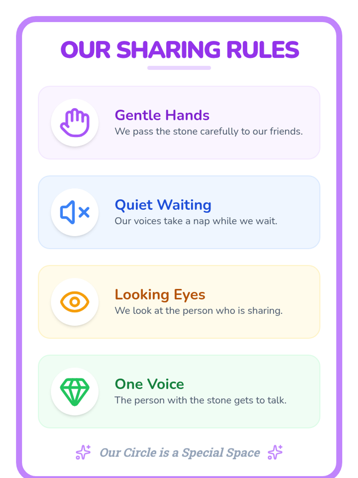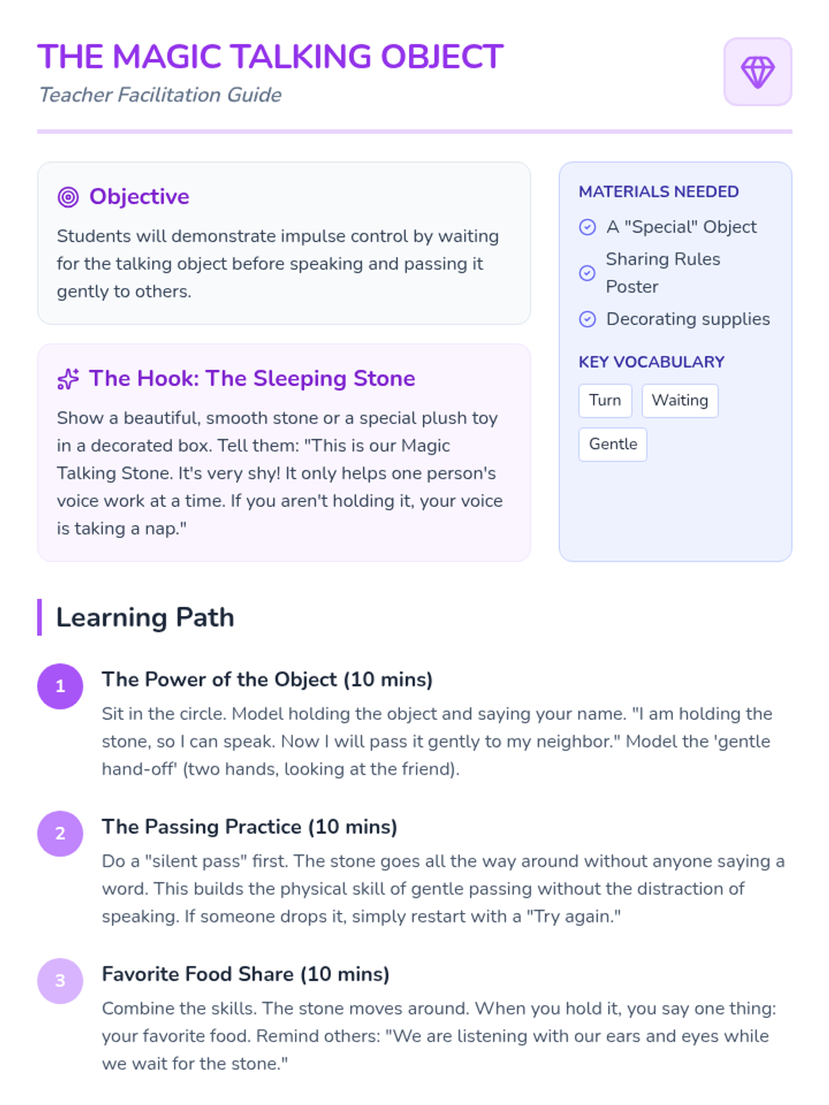 Students practice using a concrete talking object to manage turn-taking and impulse control during group sharing.