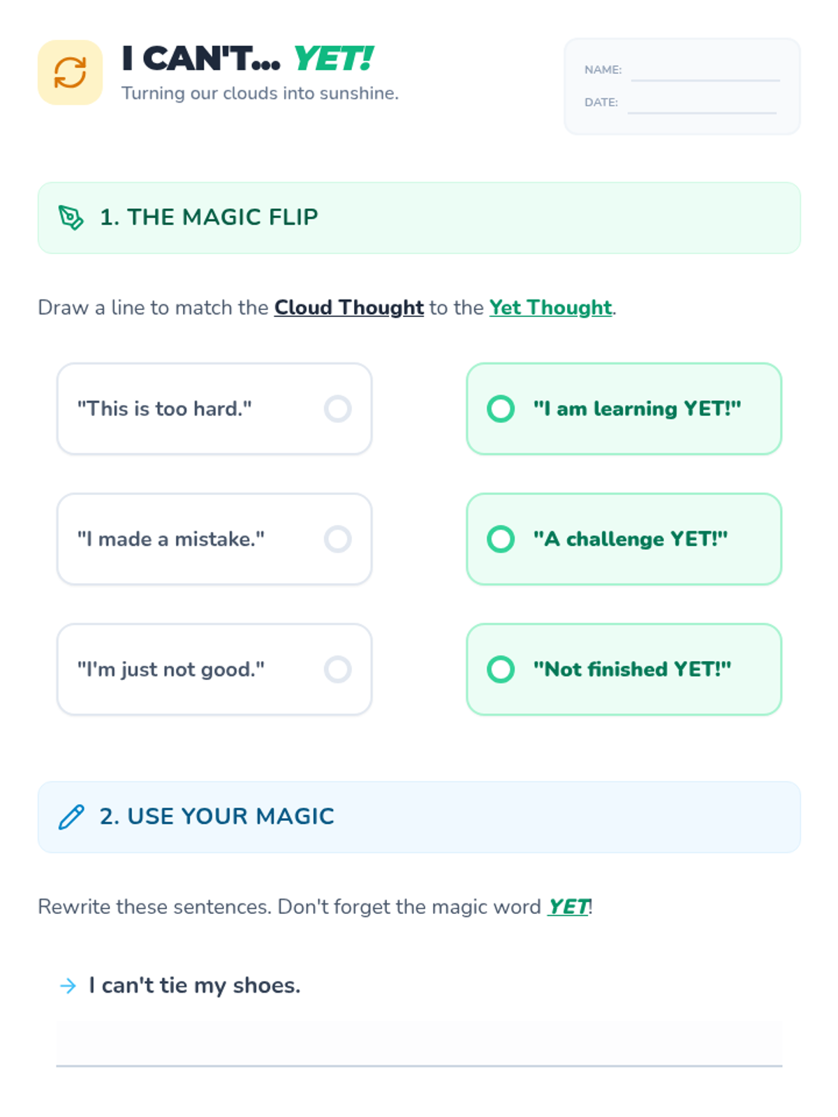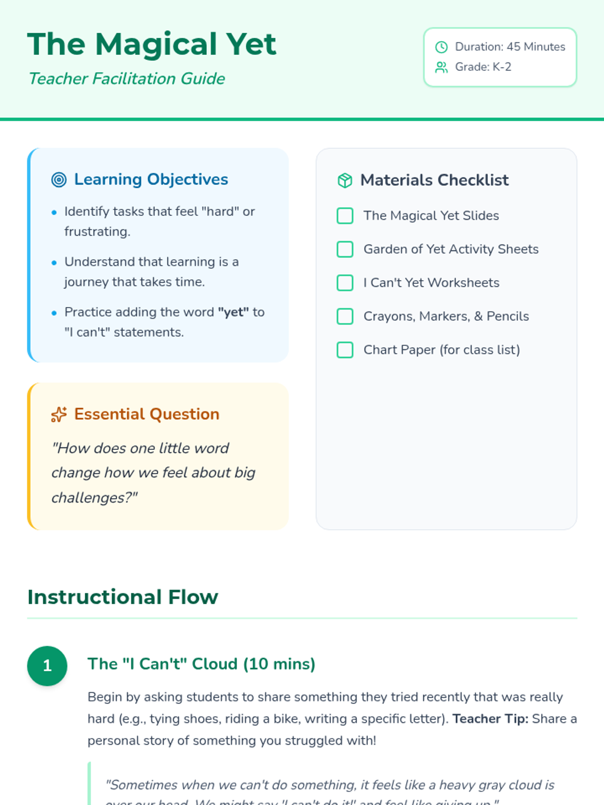 This lesson introduces K-2 students to the concept of a growth mindset through the 'The Power of Yet'. Students learn to reframe frustration as a part of the learning process, identifying personal challenges and practicing positive self-talk to build persistence and self-efficacy.