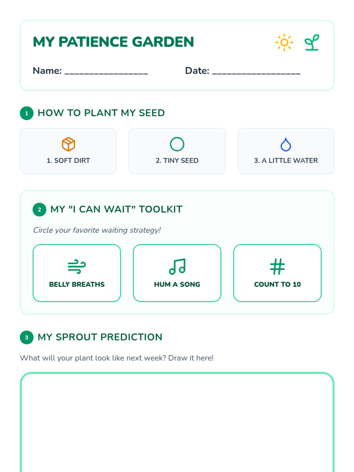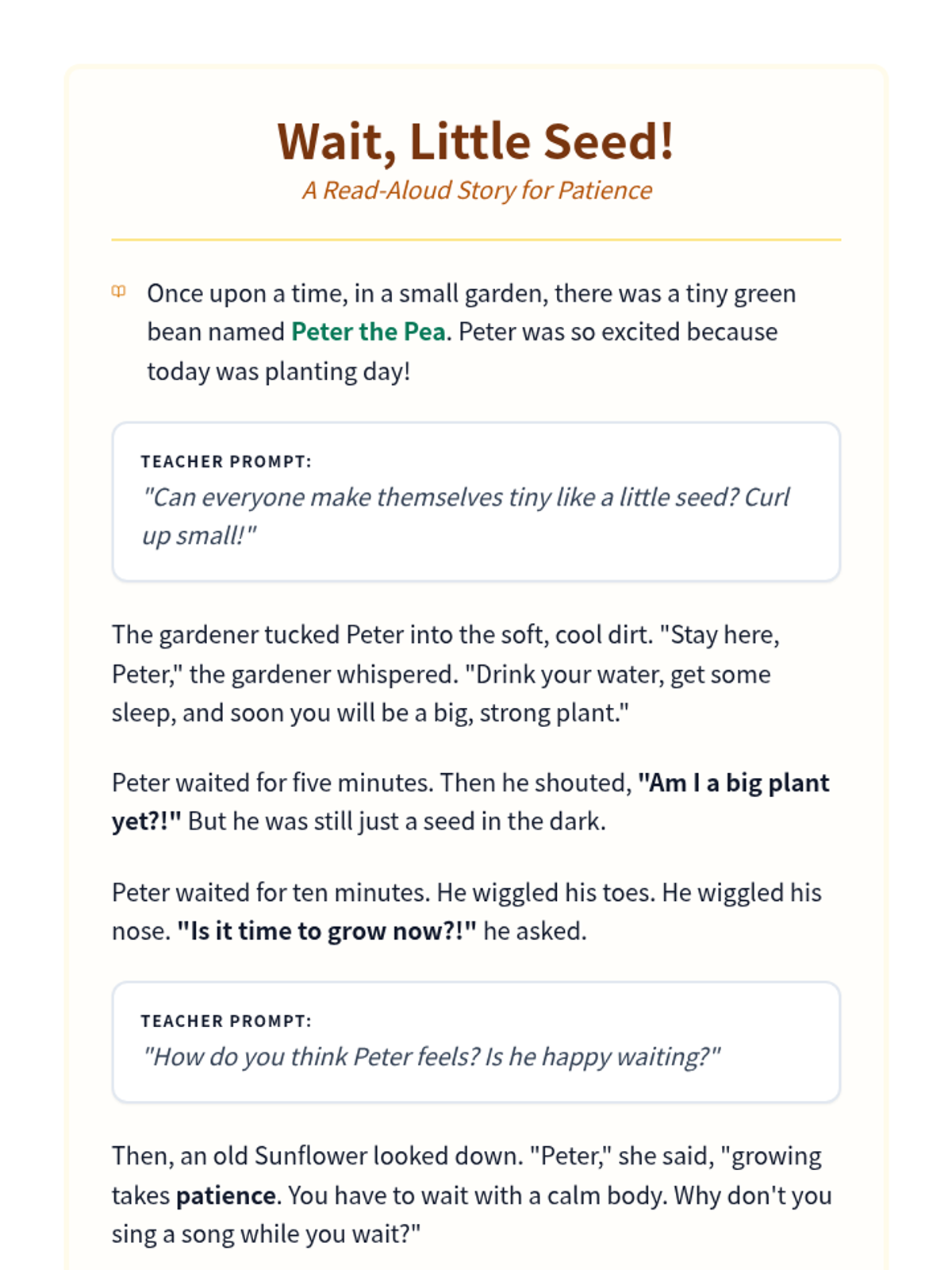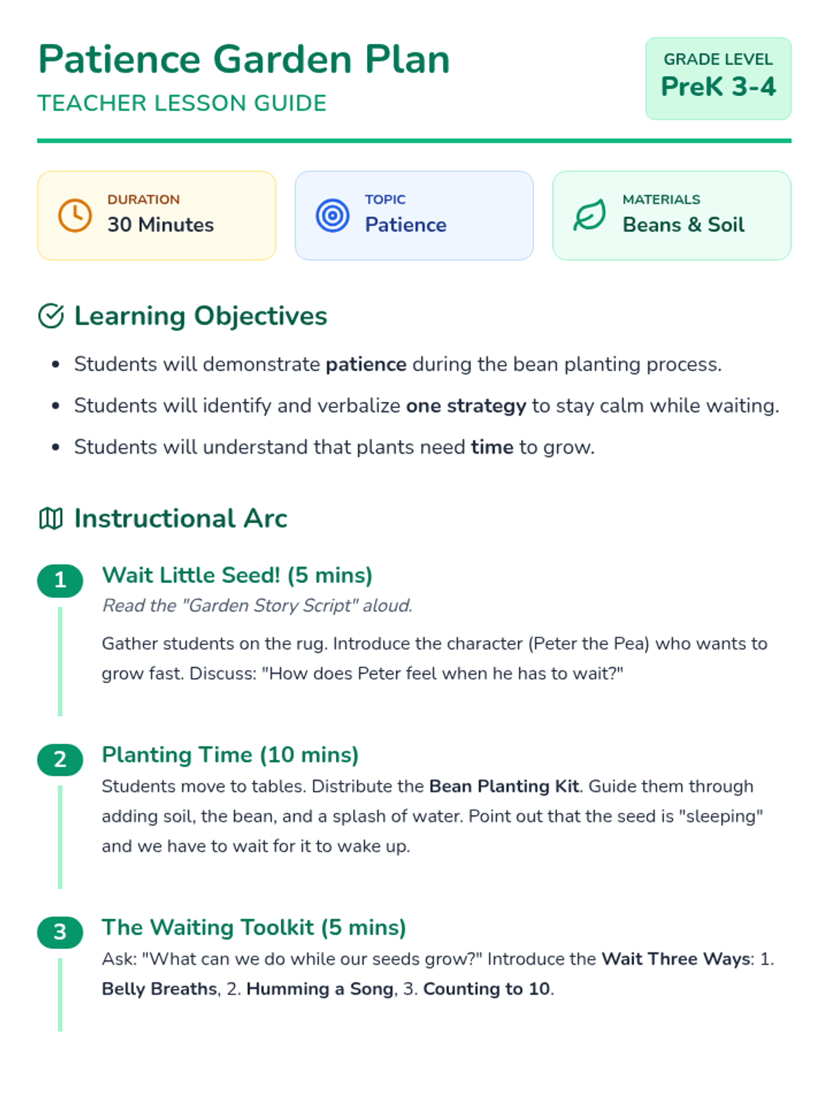A 30-minute social-emotional learning and science lesson for PreK students focusing on patience through the lens of planting bean seeds. Students learn self-soothing strategies and the concept of delayed gratification as they wait for their seeds to grow.
