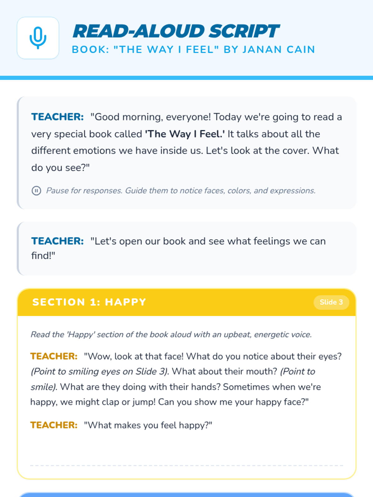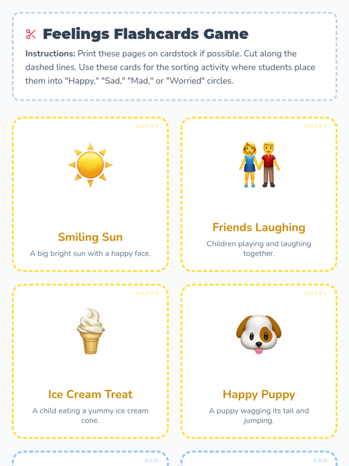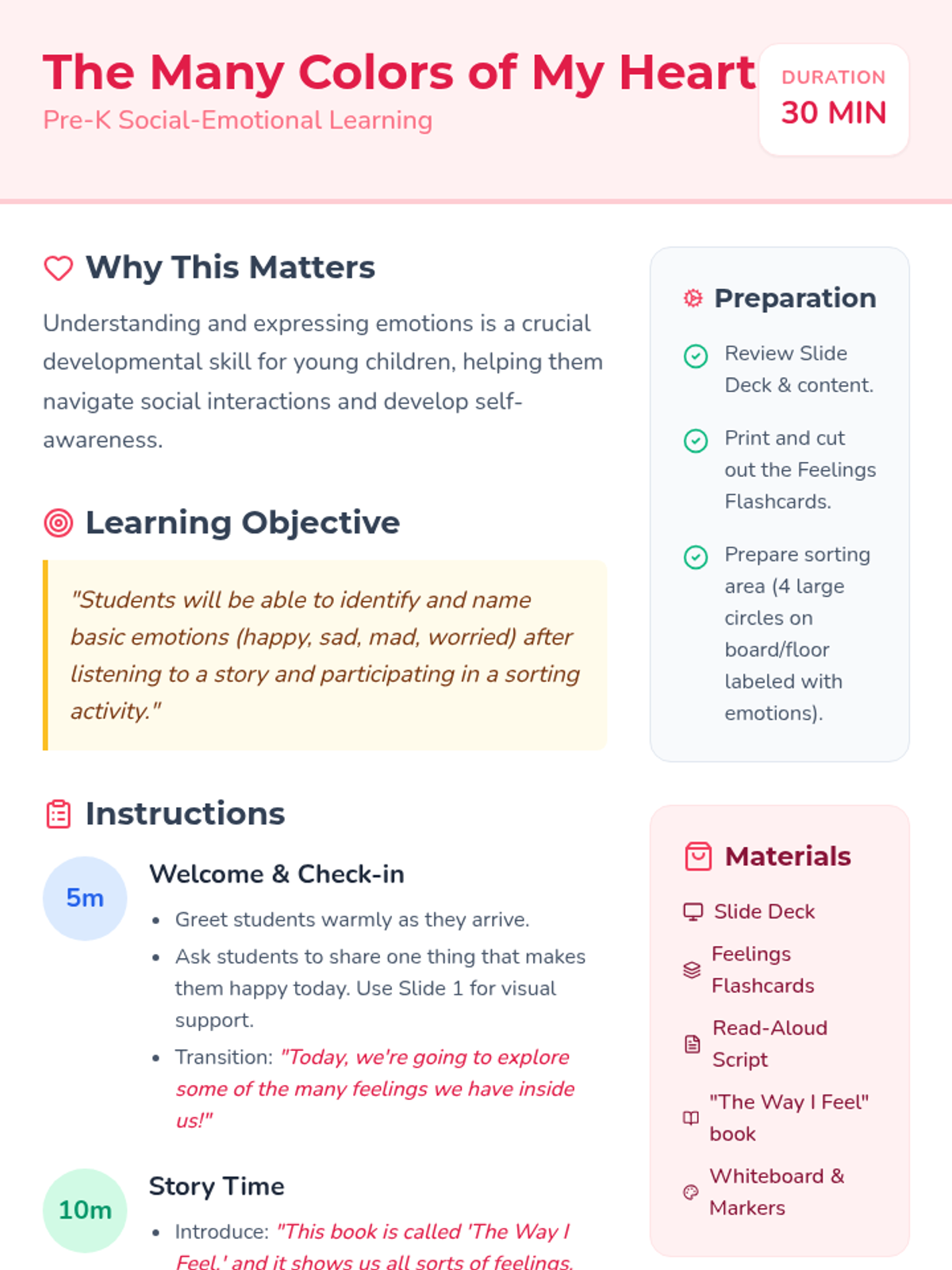 A social-emotional learning lesson for Pre-K students to identify and name basic emotions (happy, sad, mad, and worried) through a story, visual aids, and an interactive sorting game.
