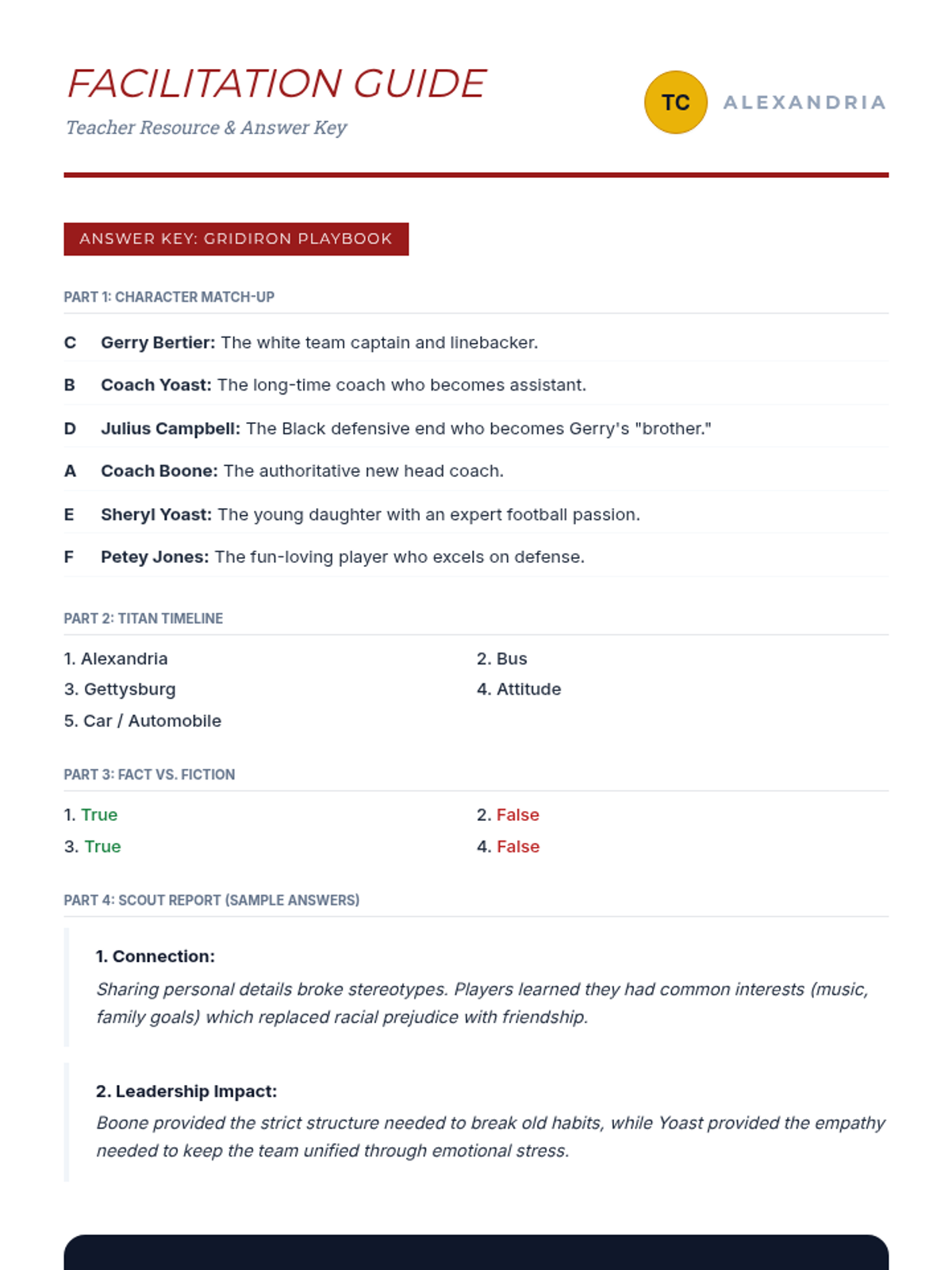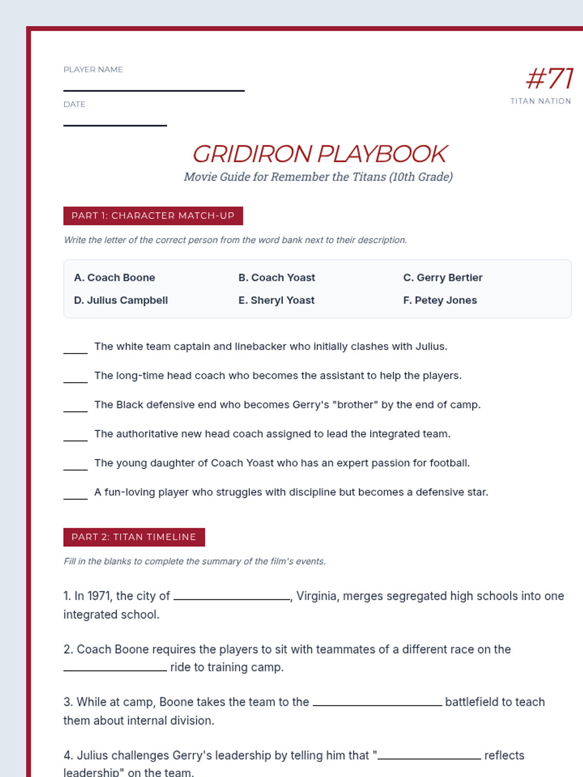 A lesson exploring the themes of leadership, racial integration, and conflict resolution through the film Remember the Titans. Students analyze character development and the historical context of 1971 Alexandria, Virginia.