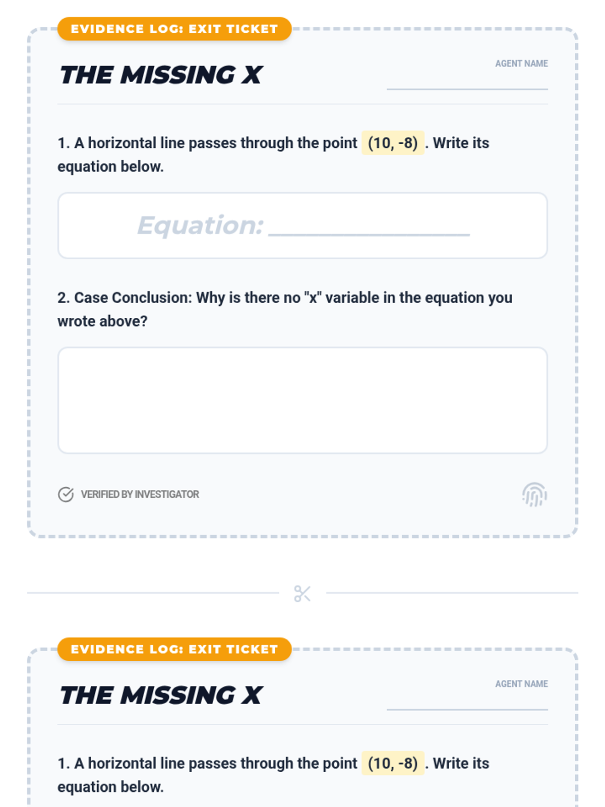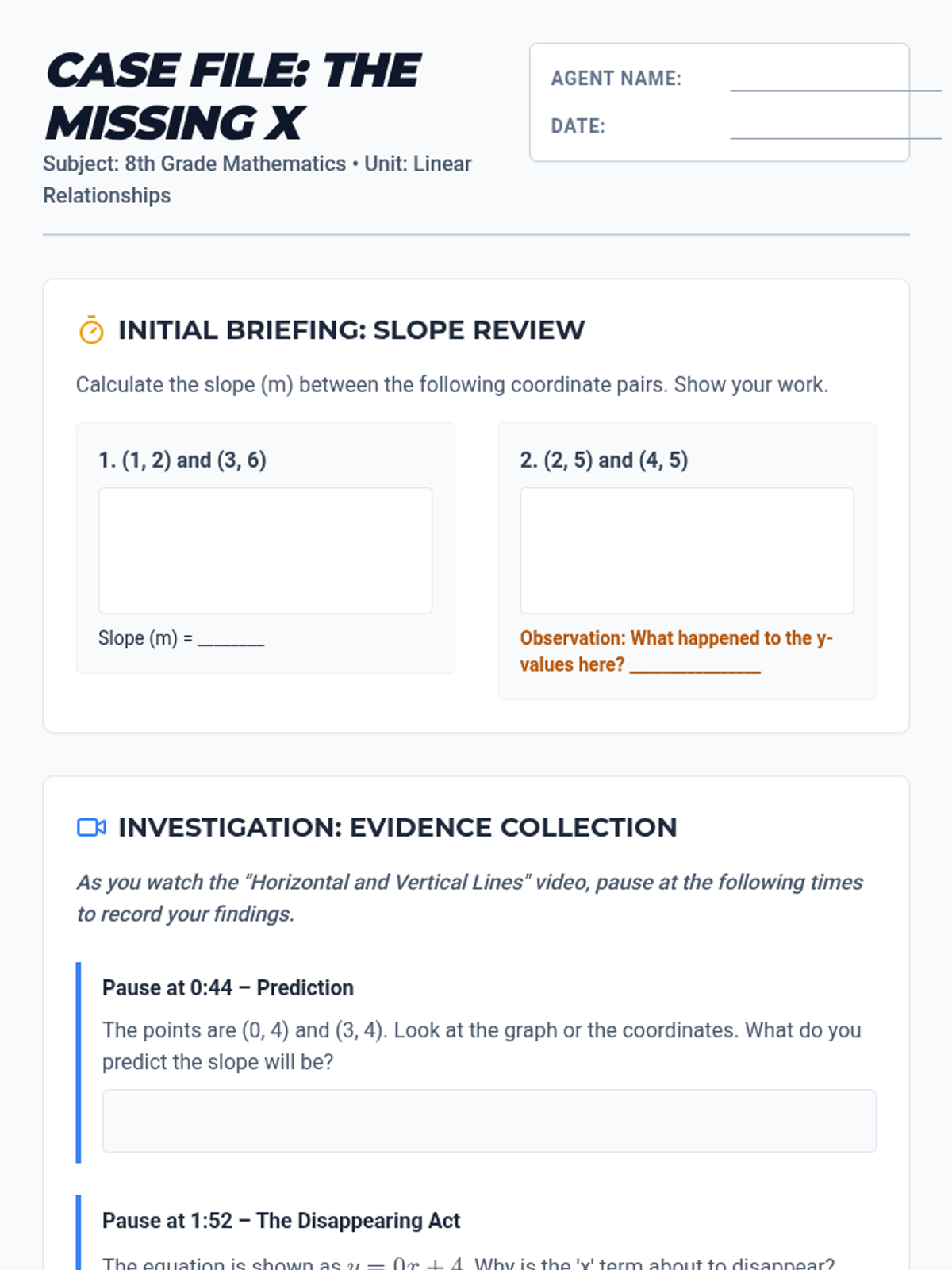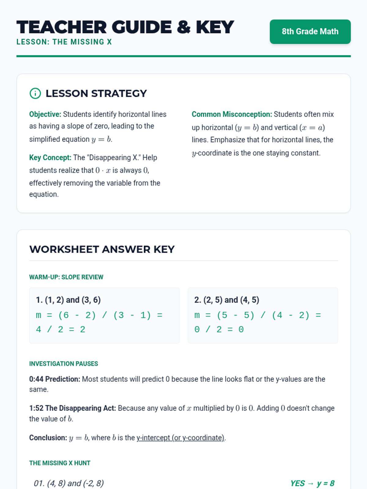 Students investigate the mysterious disappearance of 'x' in horizontal line equations, discovering that a slope of zero leads to the simple constant equation y=b.