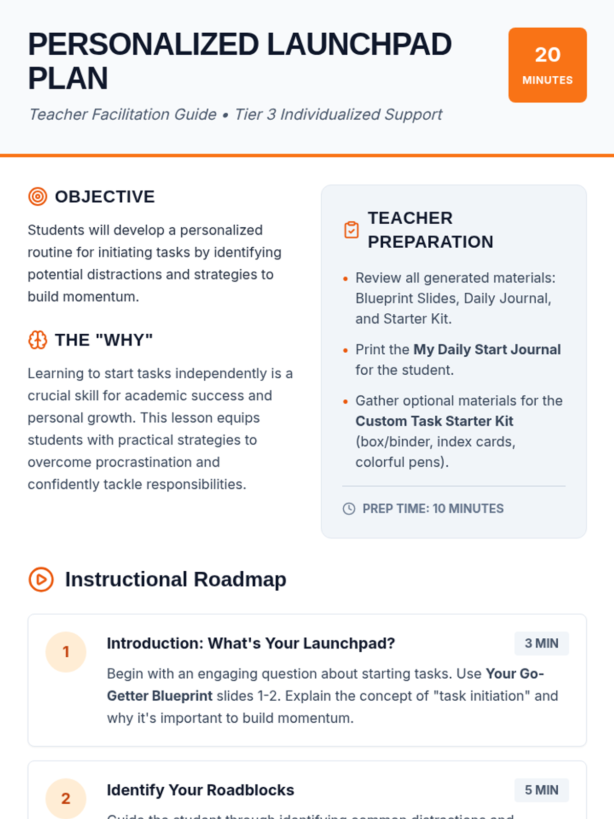 A Tier 3 individualized 20-minute lesson for 6th-grade students to develop a personalized task initiation routine, focusing on building momentum and minimizing distractions.