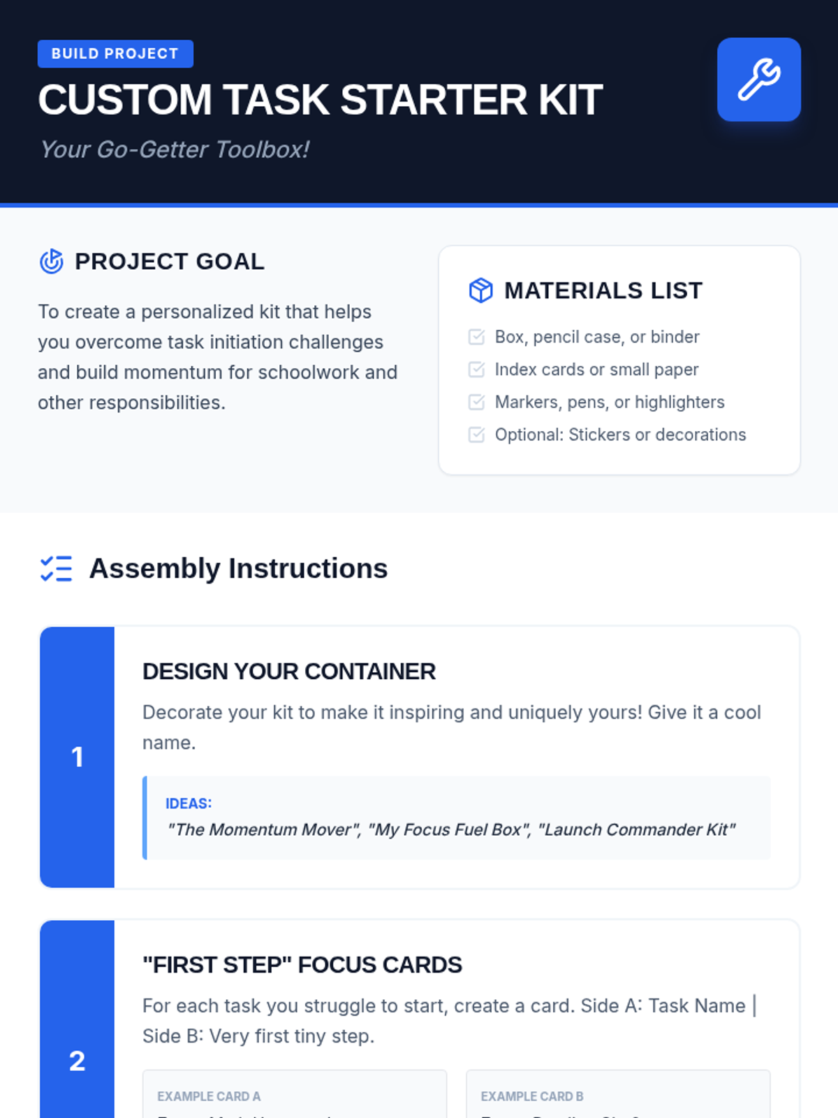 A set of tools designed to help students with ADHD improve their organization, planning, focus, and task initiation through structured self-monitoring.