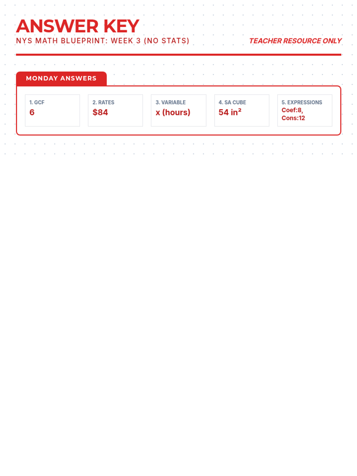Focusing on surface area (NY-6.G.4), GCF/LCM (NY-6.NS.4), and independent/dependent variables (NY-6.EE.9).