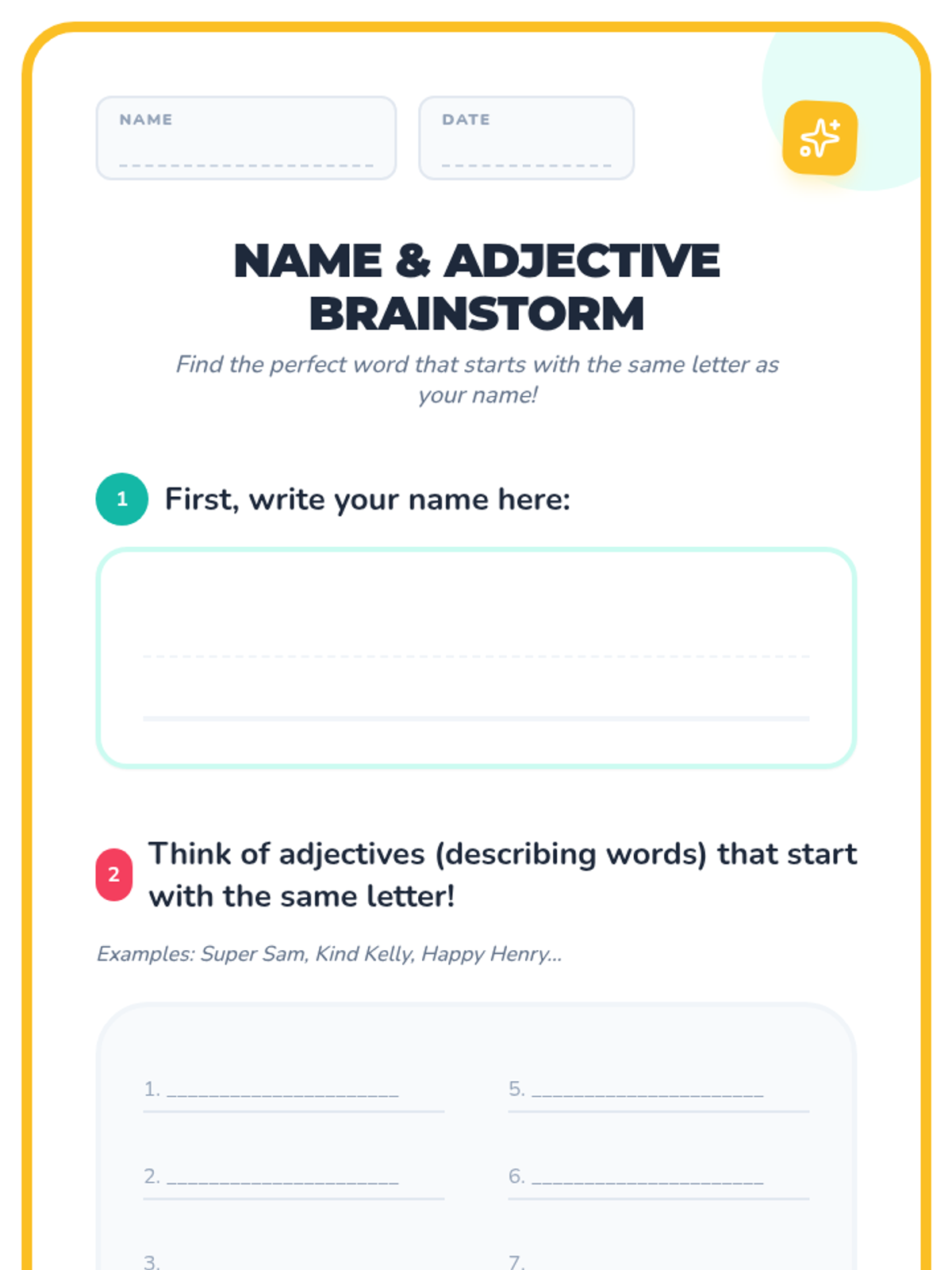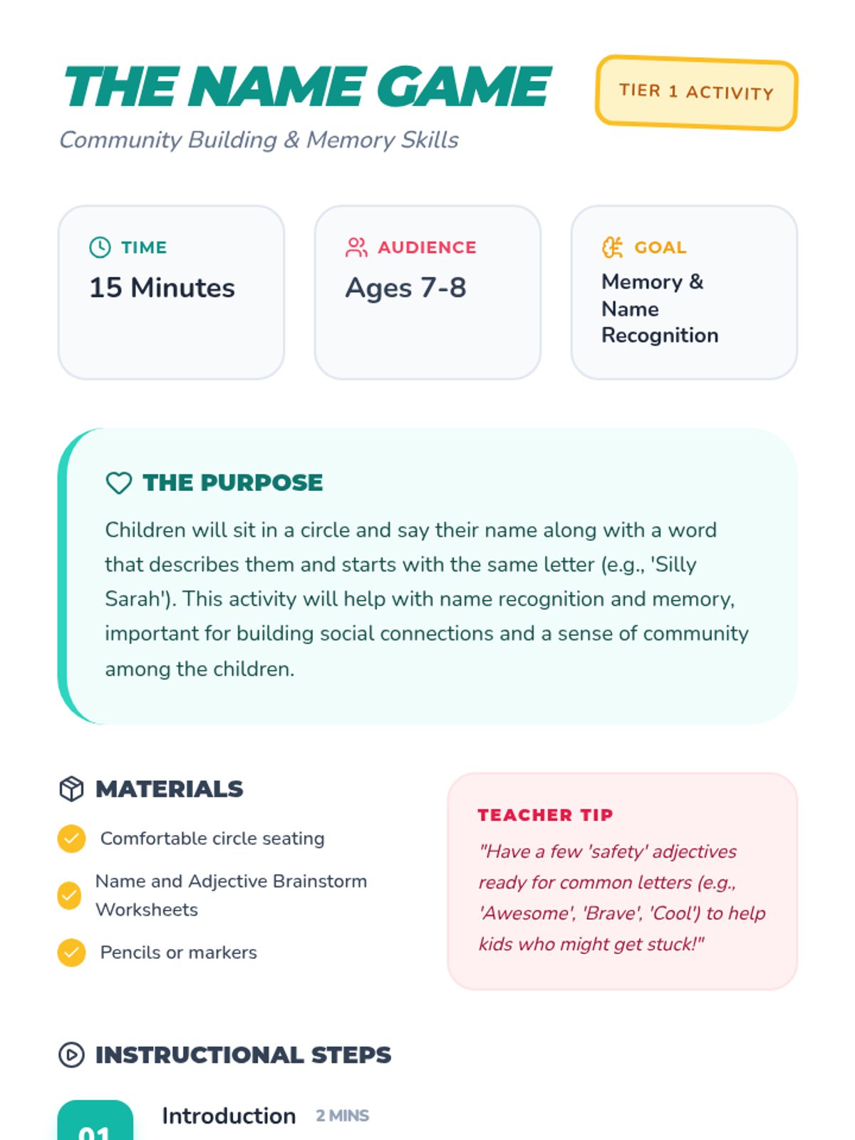 A fun, interactive activity where children build community and memory skills by creating alliterative name-adjective pairs in a circle game.