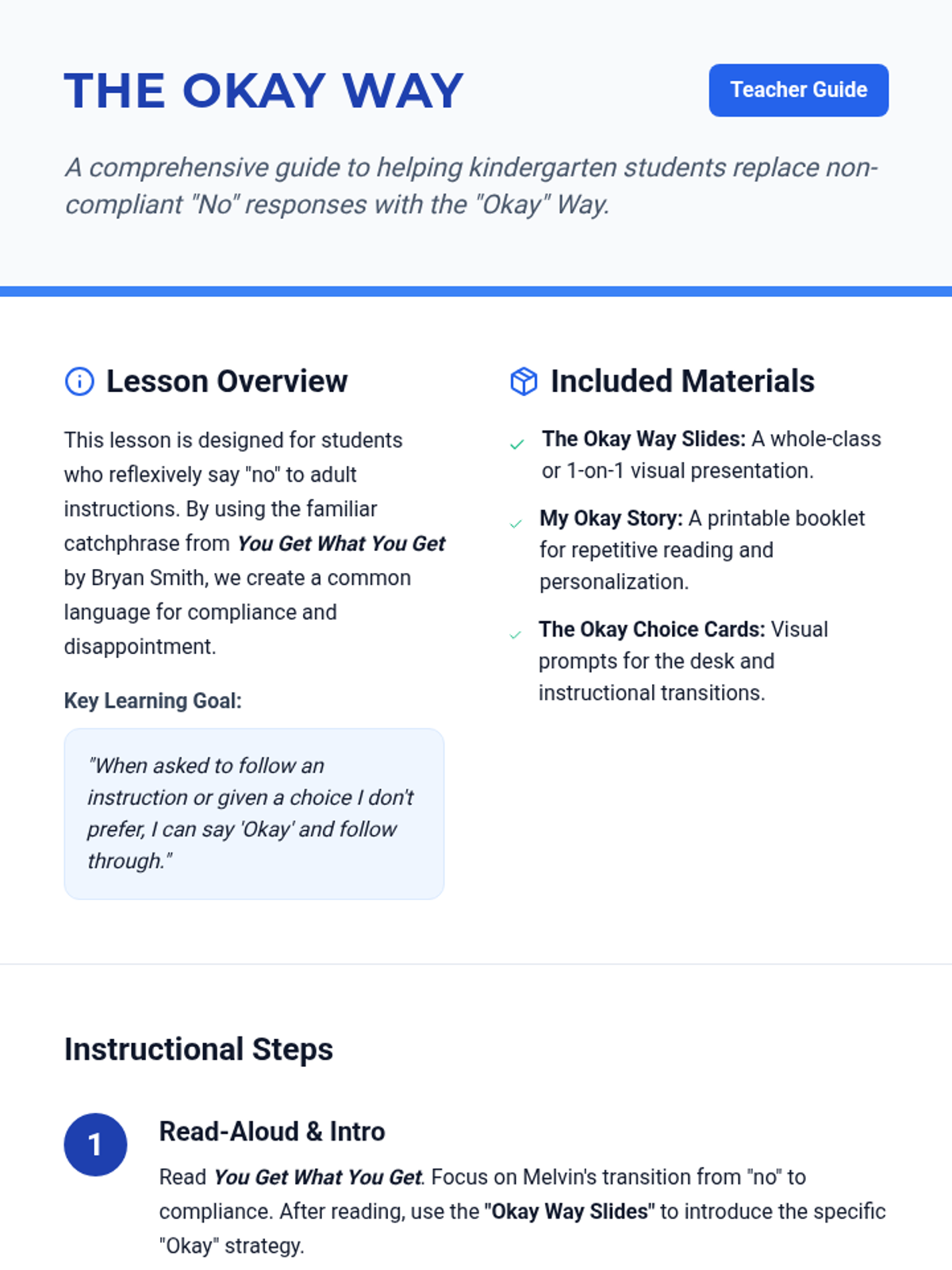 A social-emotional lesson for kindergarten students focused on replacing 'no' with 'okay' and accepting outcomes, aligned with the book 'You Get What You Get'.