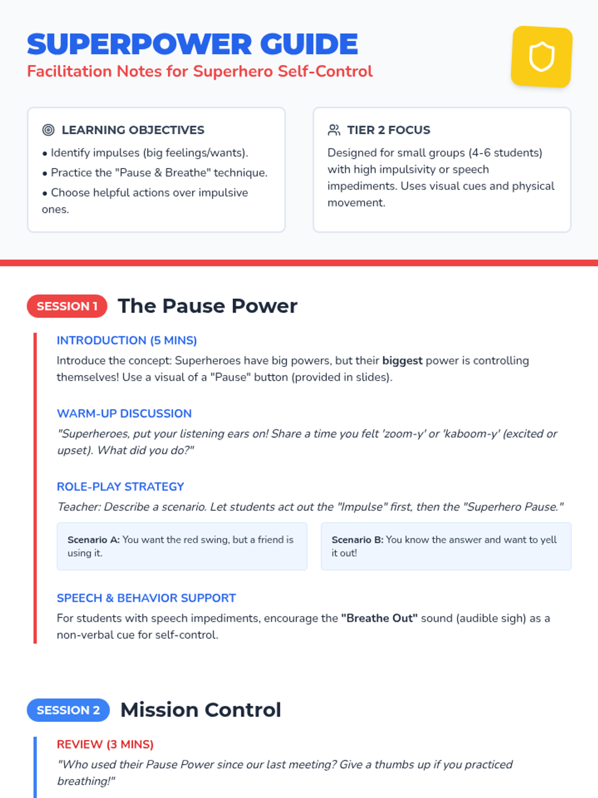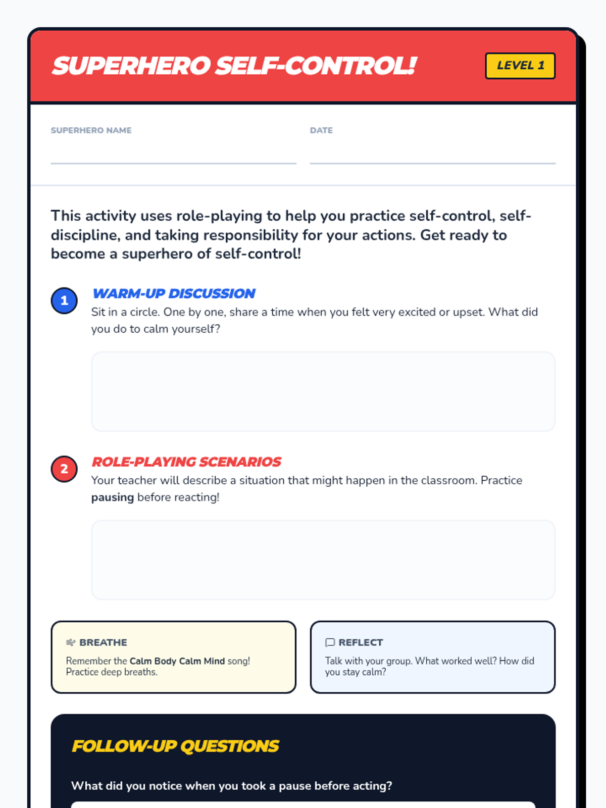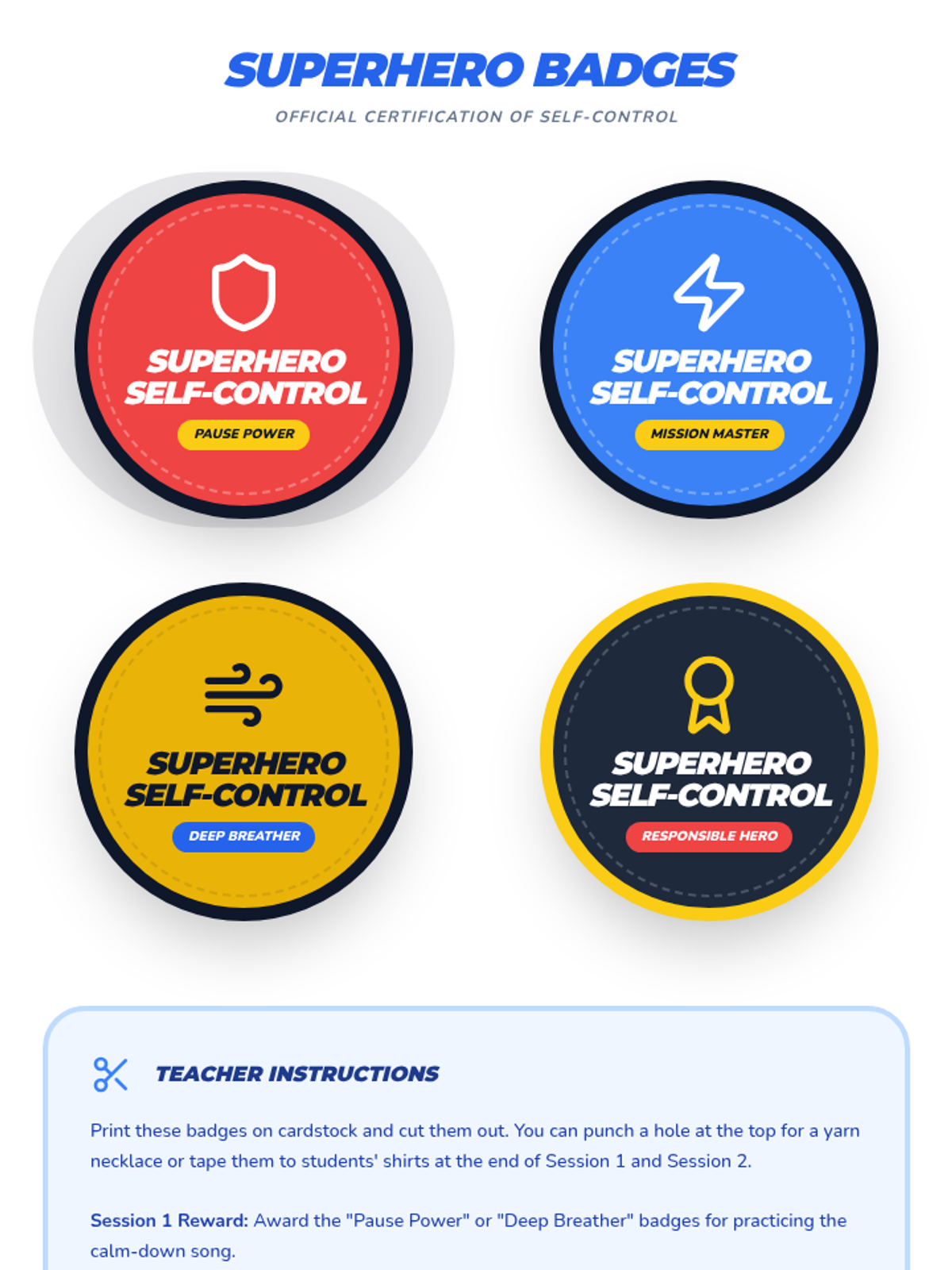 Focuses on the 'Pause Power'—teaching students to stop and breathe before reacting to emotions or impulses. Includes role-playing and the introduction of superhero self-control badges.
