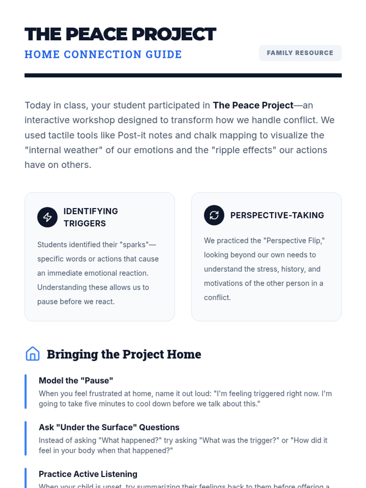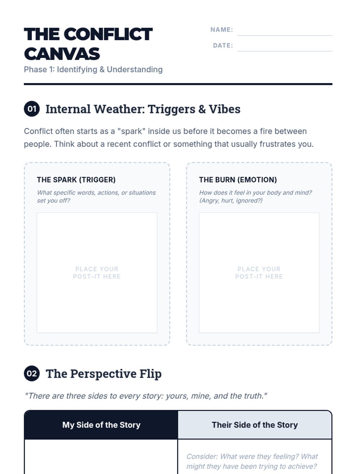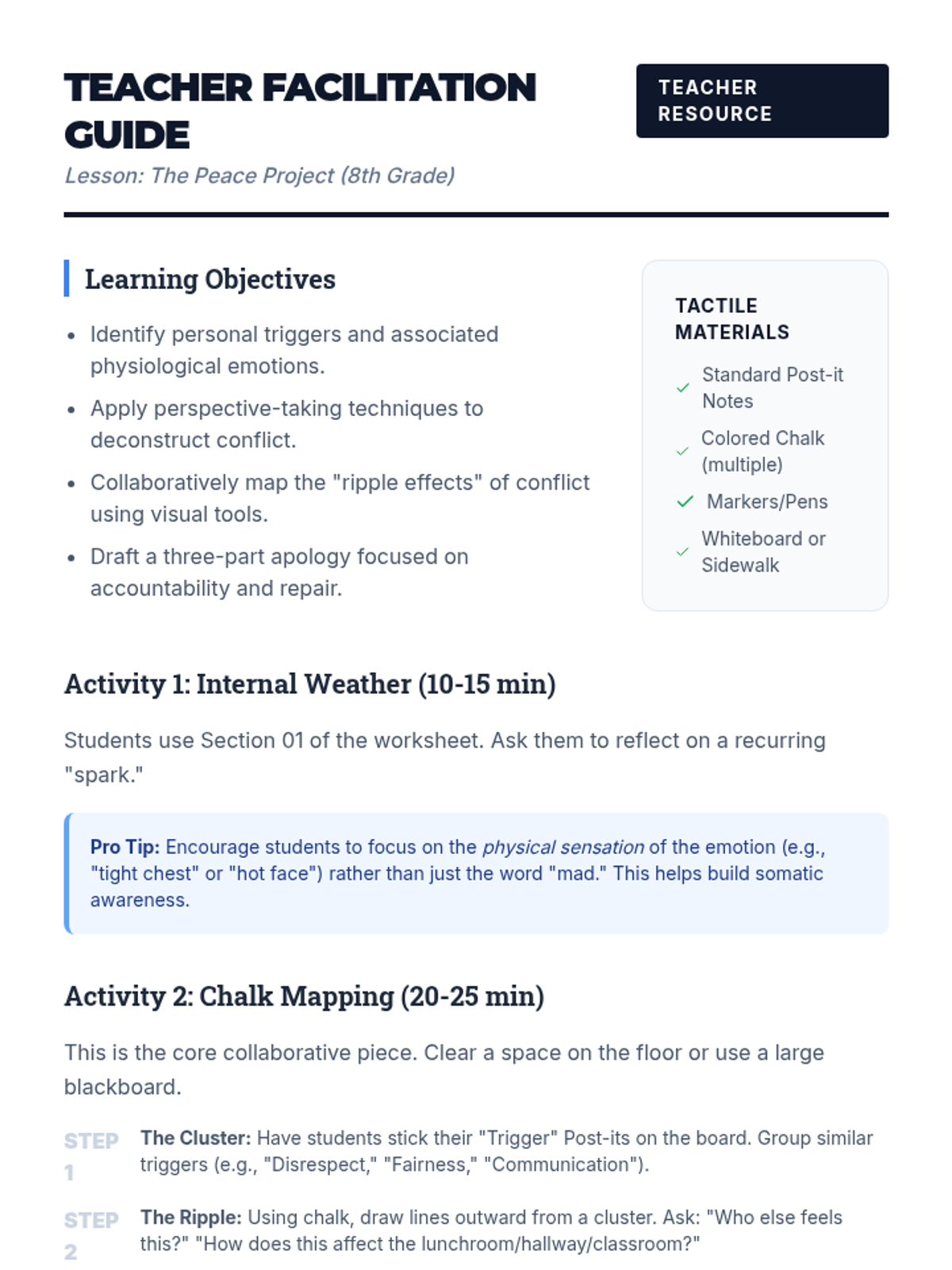 An interactive conflict resolution lesson for 8th graders using tactile tools like post-it notes and chalk to map out emotions, perspectives, and paths to reconciliation.