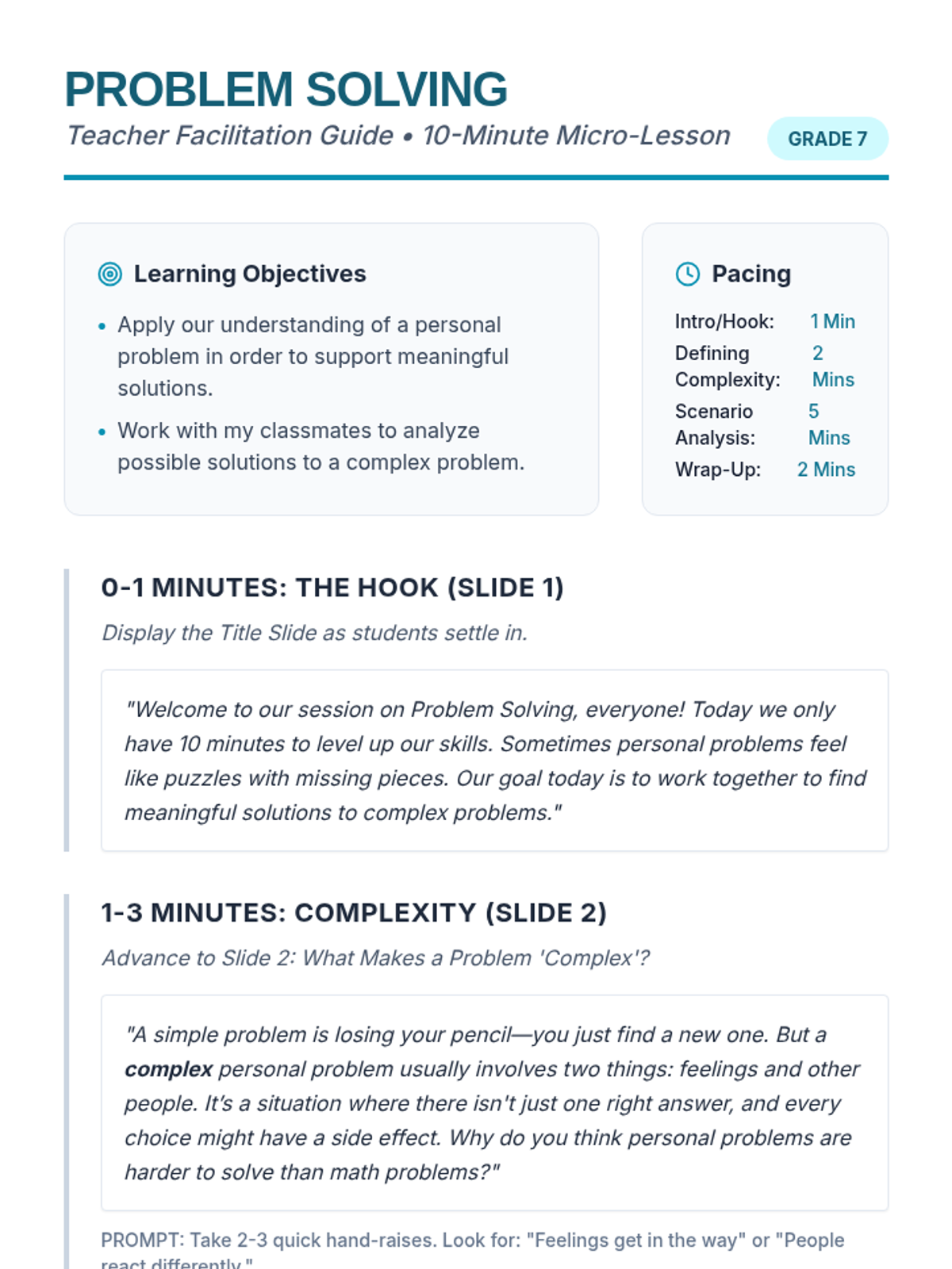 A fast-paced, 10-minute micro-lesson focused on analyzing complex personal problems and brainstorming meaningful solutions through collaborative discussion.