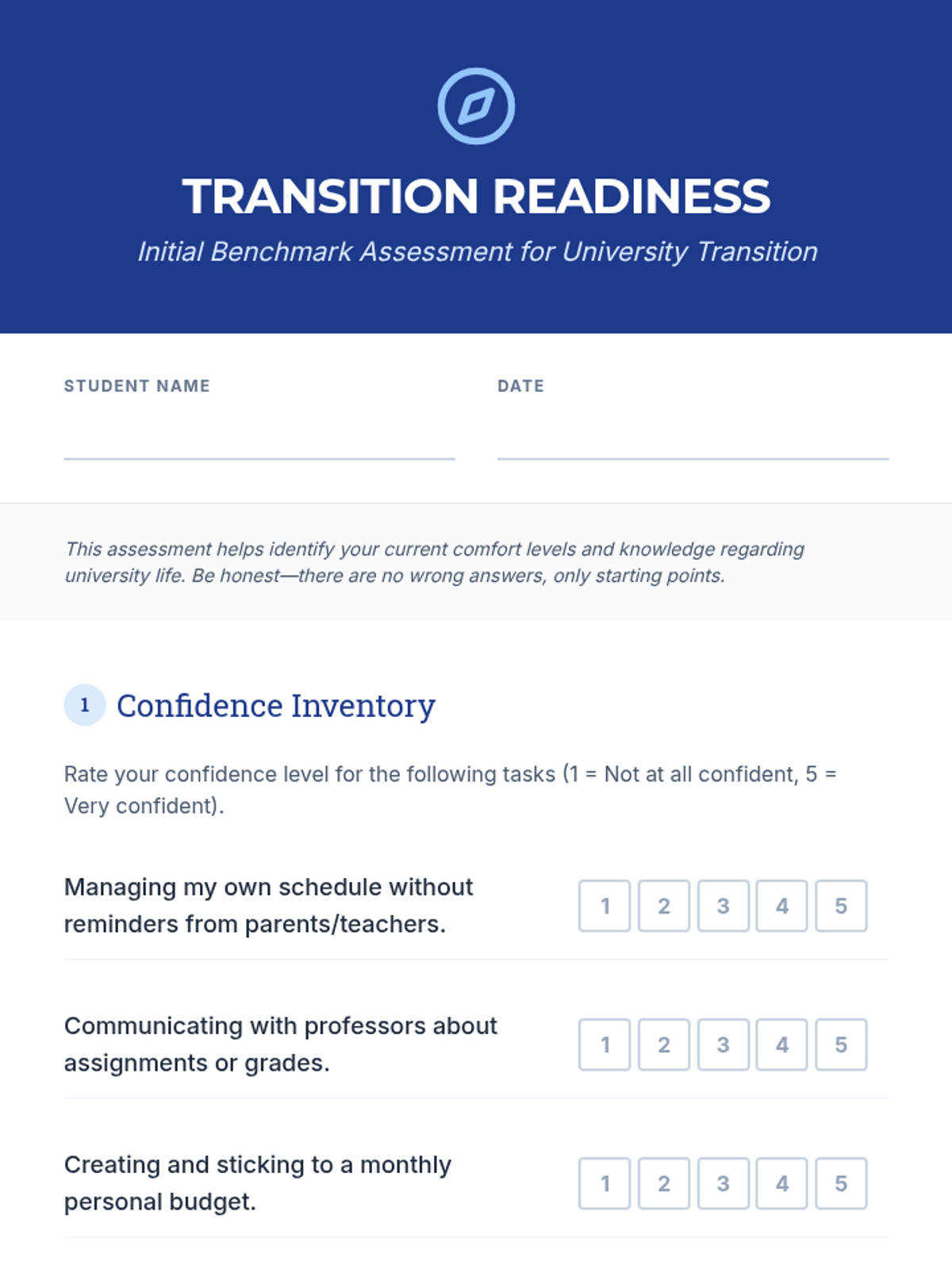 Introduction to the university transition, including a pre-assessment of student readiness and a reflection on high school legacy and future goals.