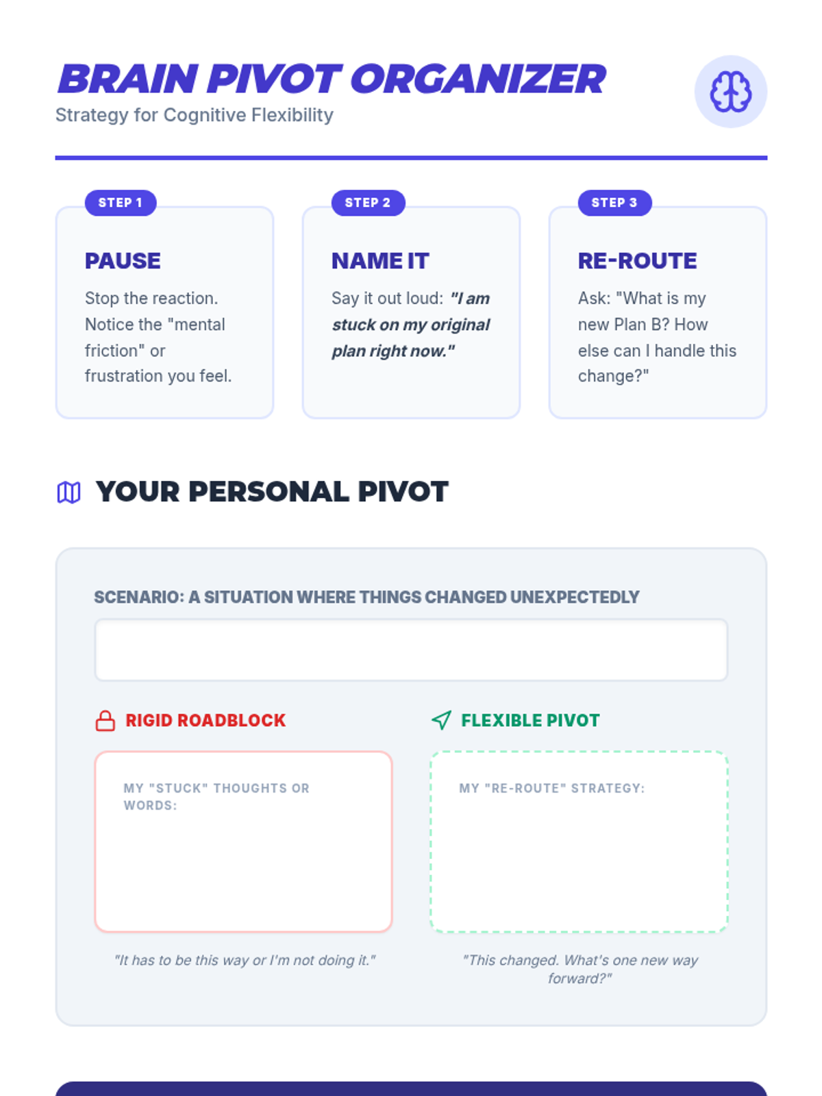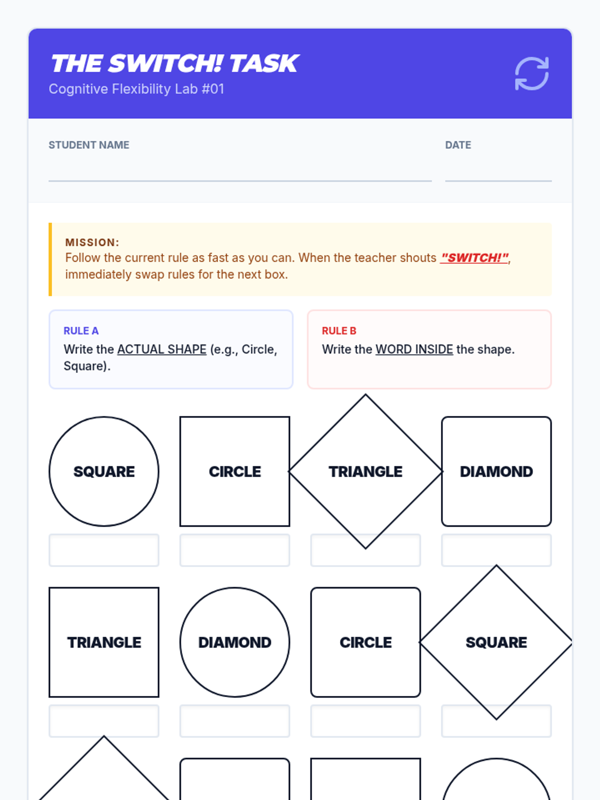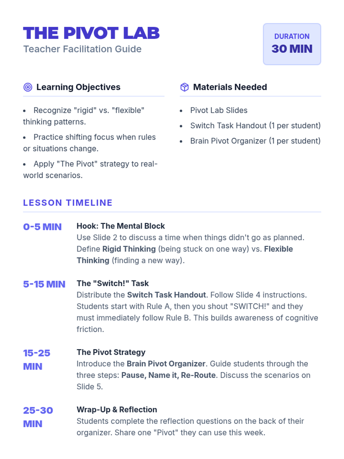 A 30-minute mini-lesson for 7th graders on cognitive flexibility, featuring a 'Switch!' activity and strategies for adapting to change.