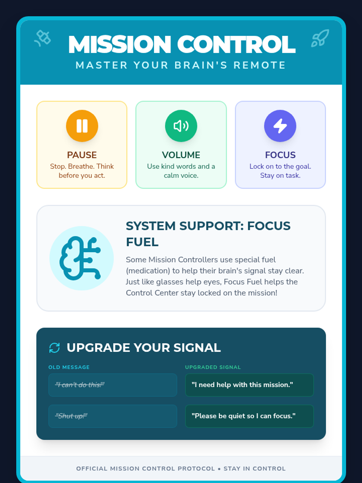 A comprehensive lesson focused on developing self-control, using respectful language, and understanding how to support the brain's focus, including the role of medication in managing ADHD.