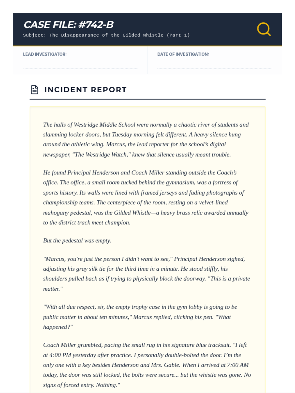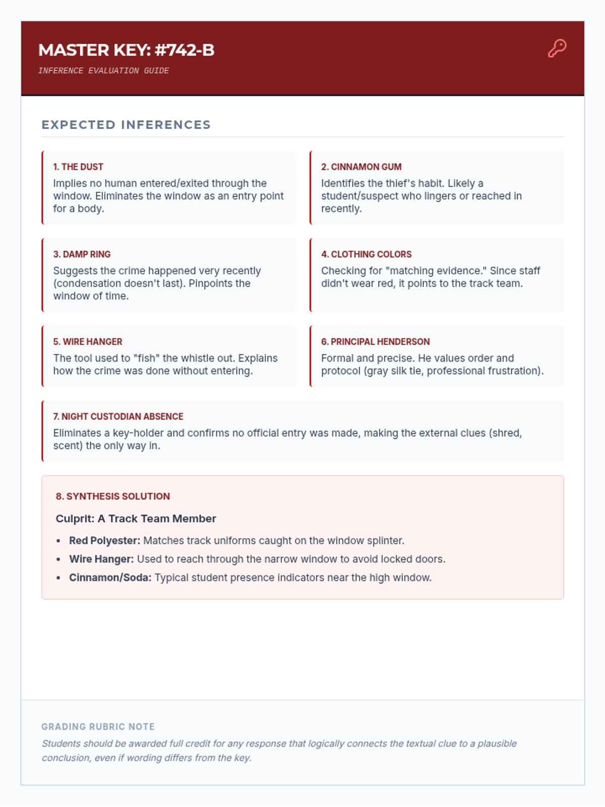 A 6th-grade ELA lesson focused on developing inference skills through a locked-room school mystery. Students analyze clues, character motivations, and environmental details to solve a crime.