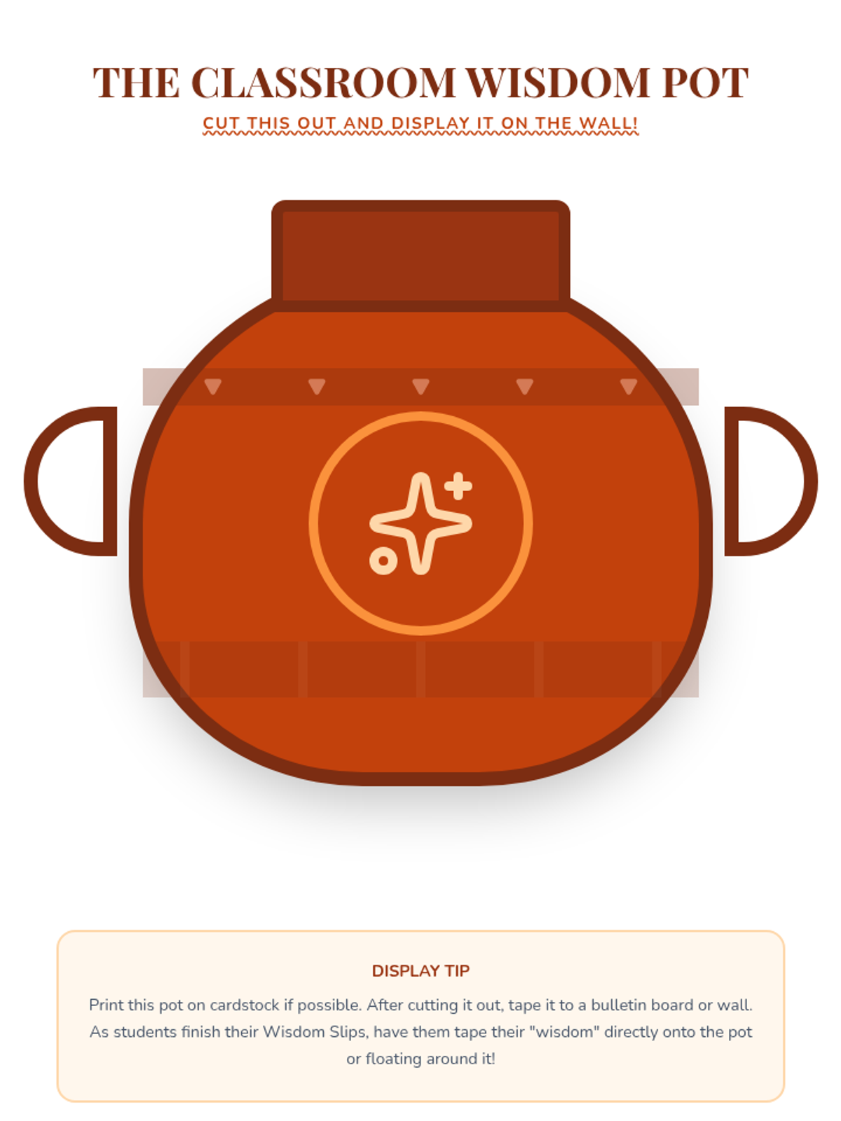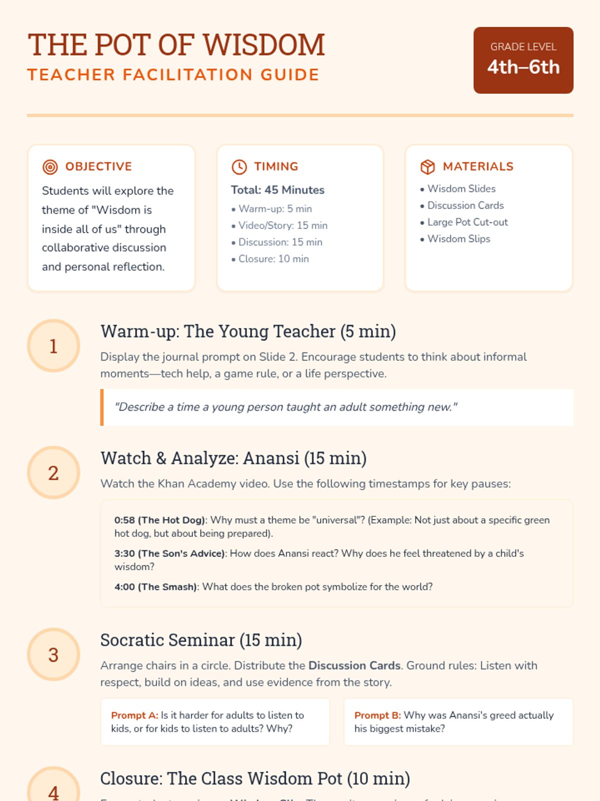 Students explore the theme 'Wisdom is inside all of us' through the West African folktale of Anansi the Spider, engaging in a Socratic Seminar and a collaborative classroom 'Pot of Wisdom' activity.