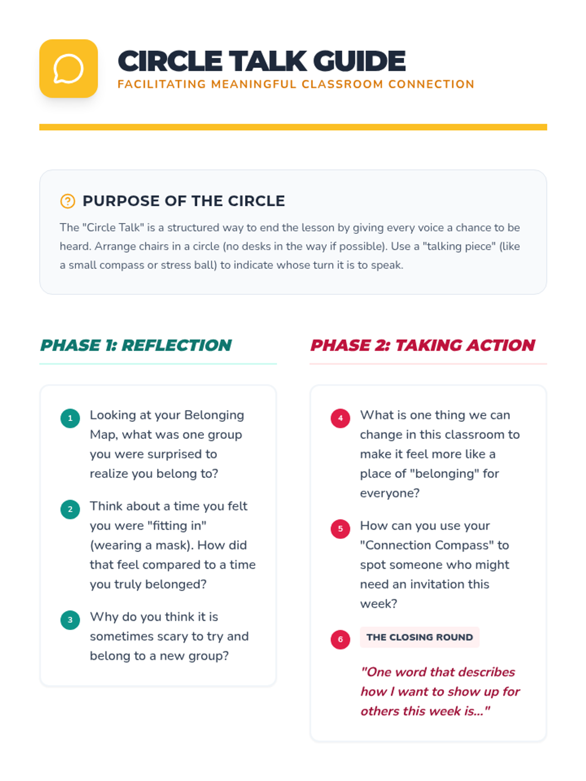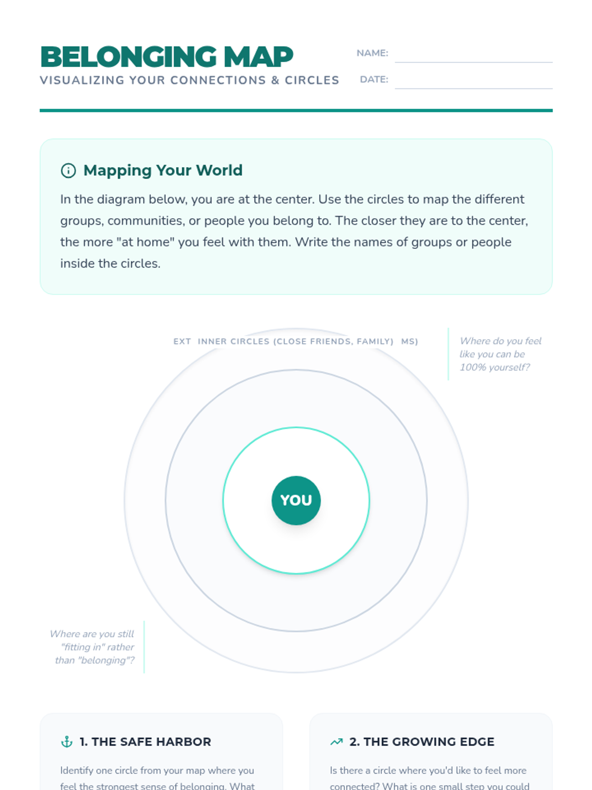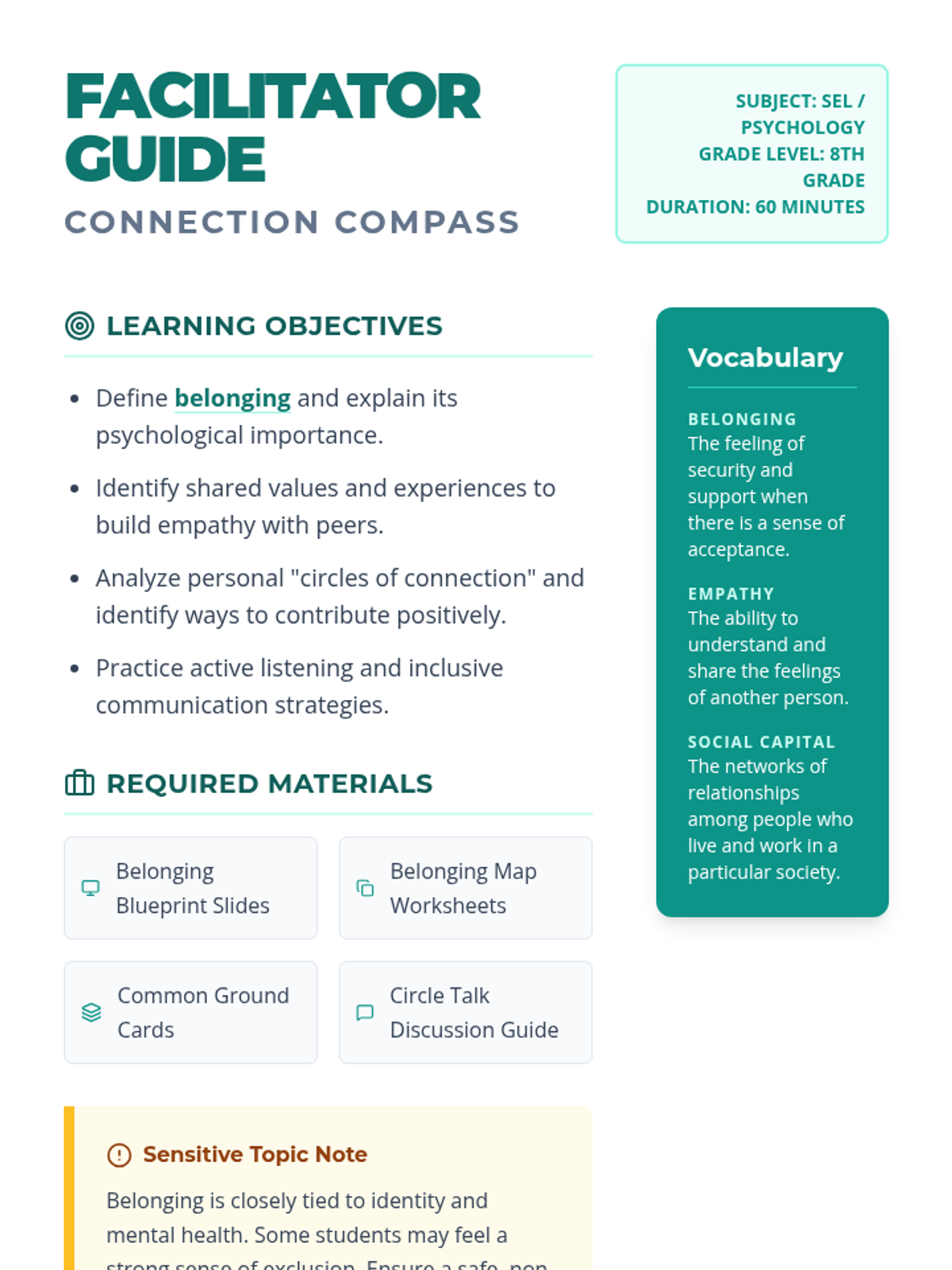 This lesson explores the psychological need for social connection and belonging among 8th graders. Students will engage in activities to identify shared values, discuss inclusivity, and map their own communities to foster empathy and supportive relationships.