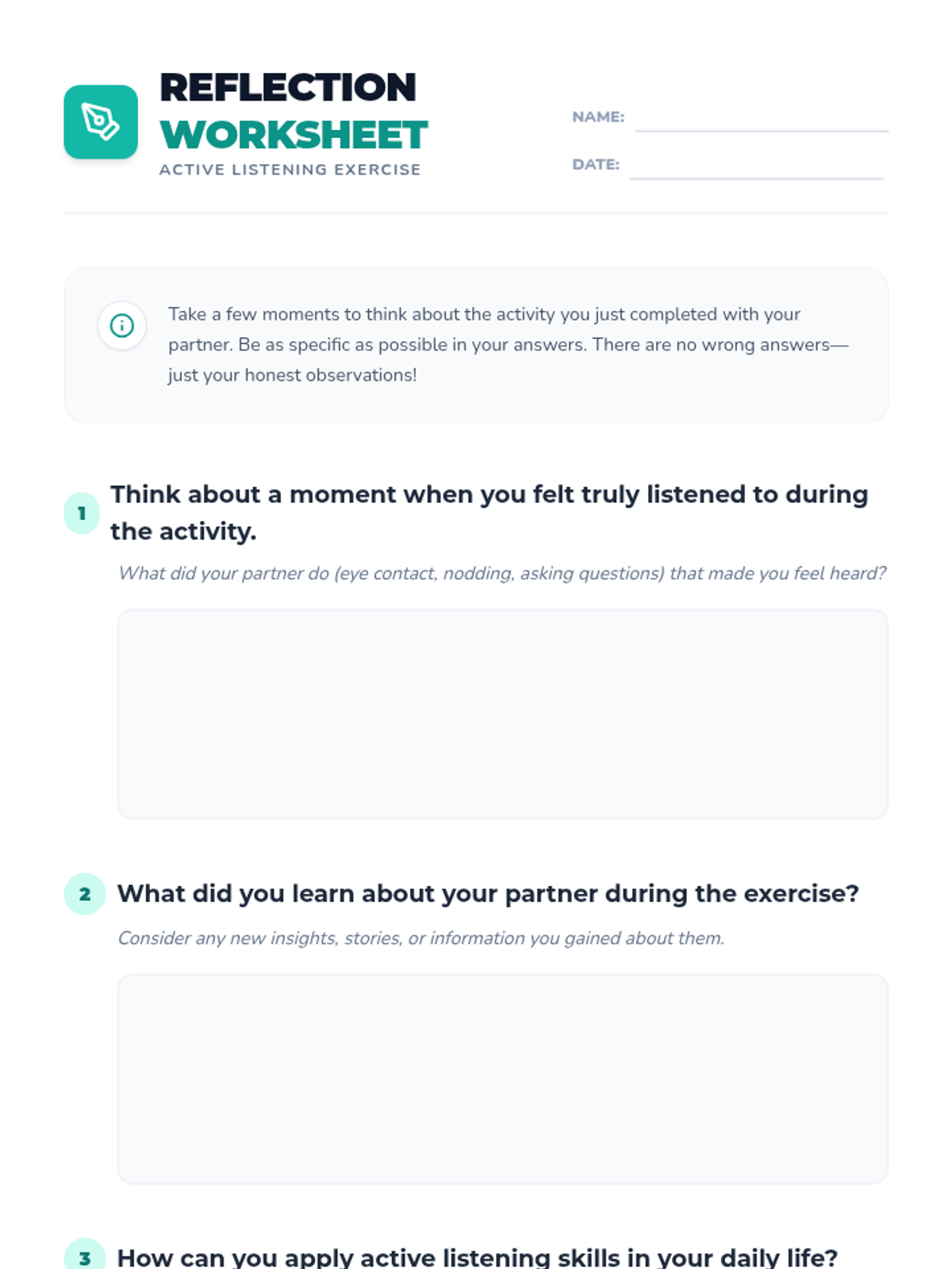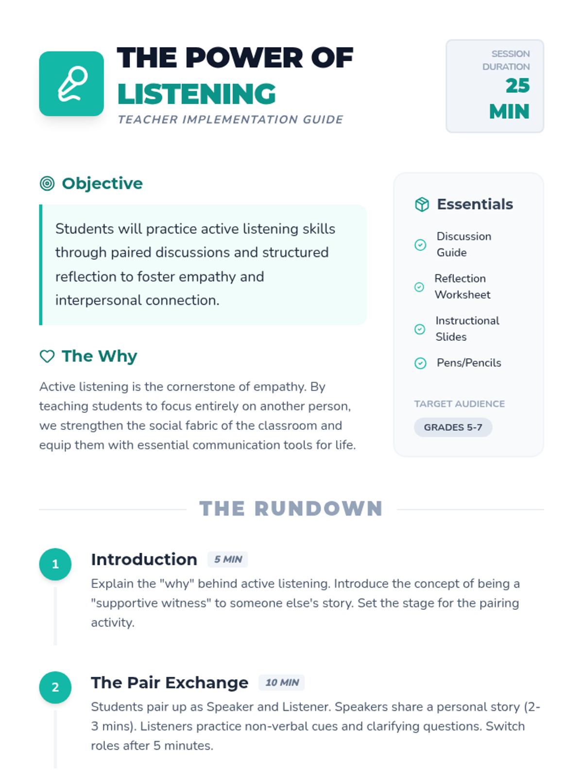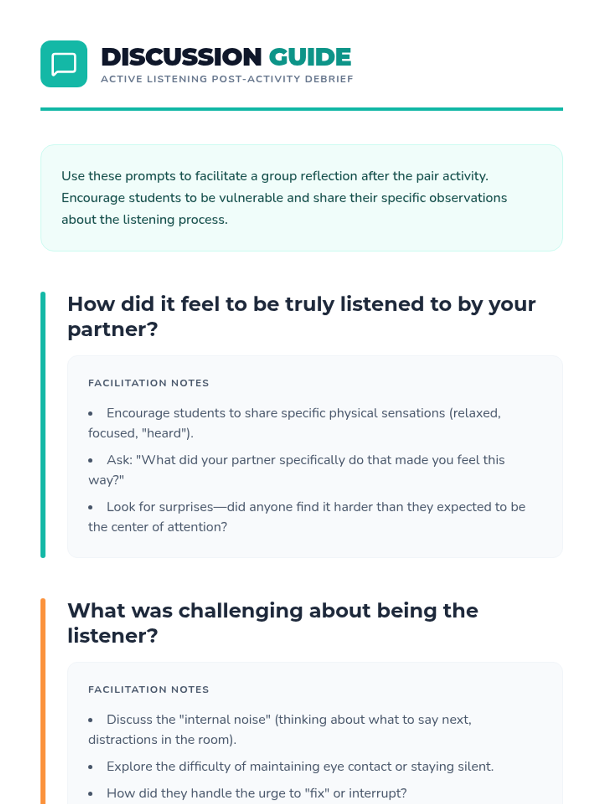 Students practice active listening skills through paired discussions and reflection, fostering empathy and stronger interpersonal connections.