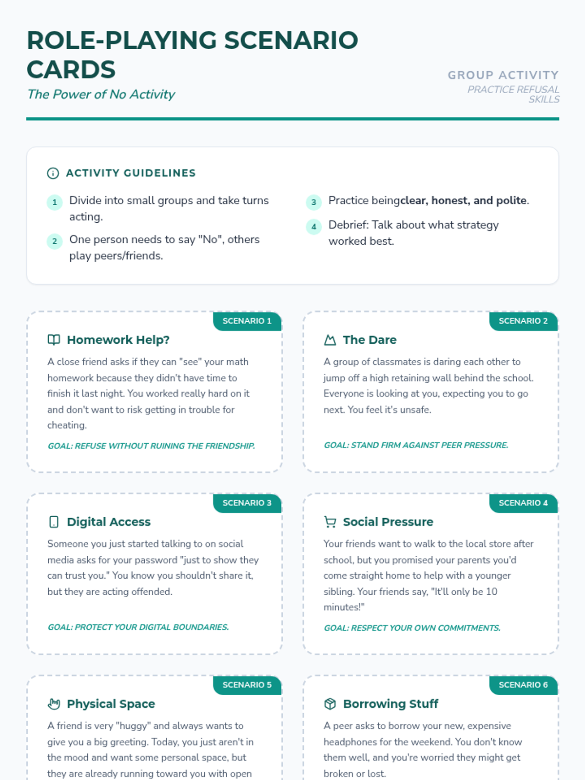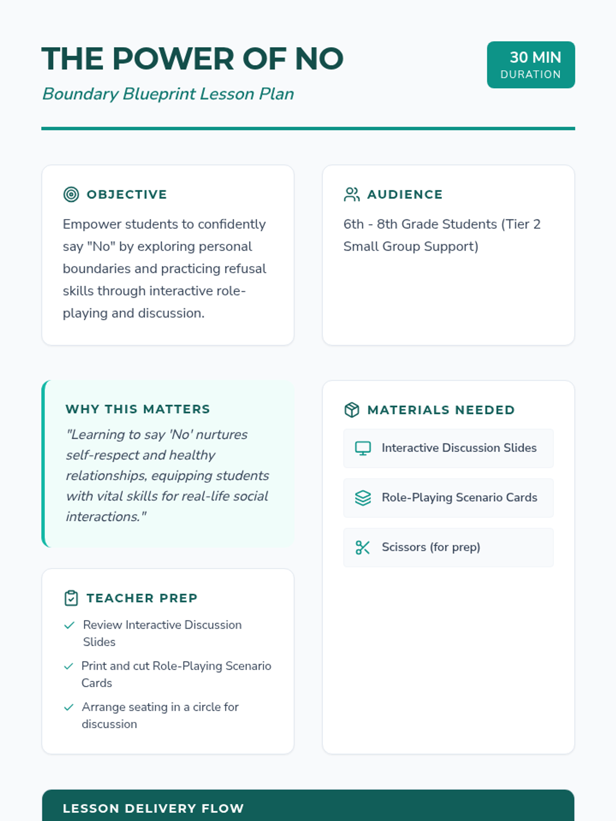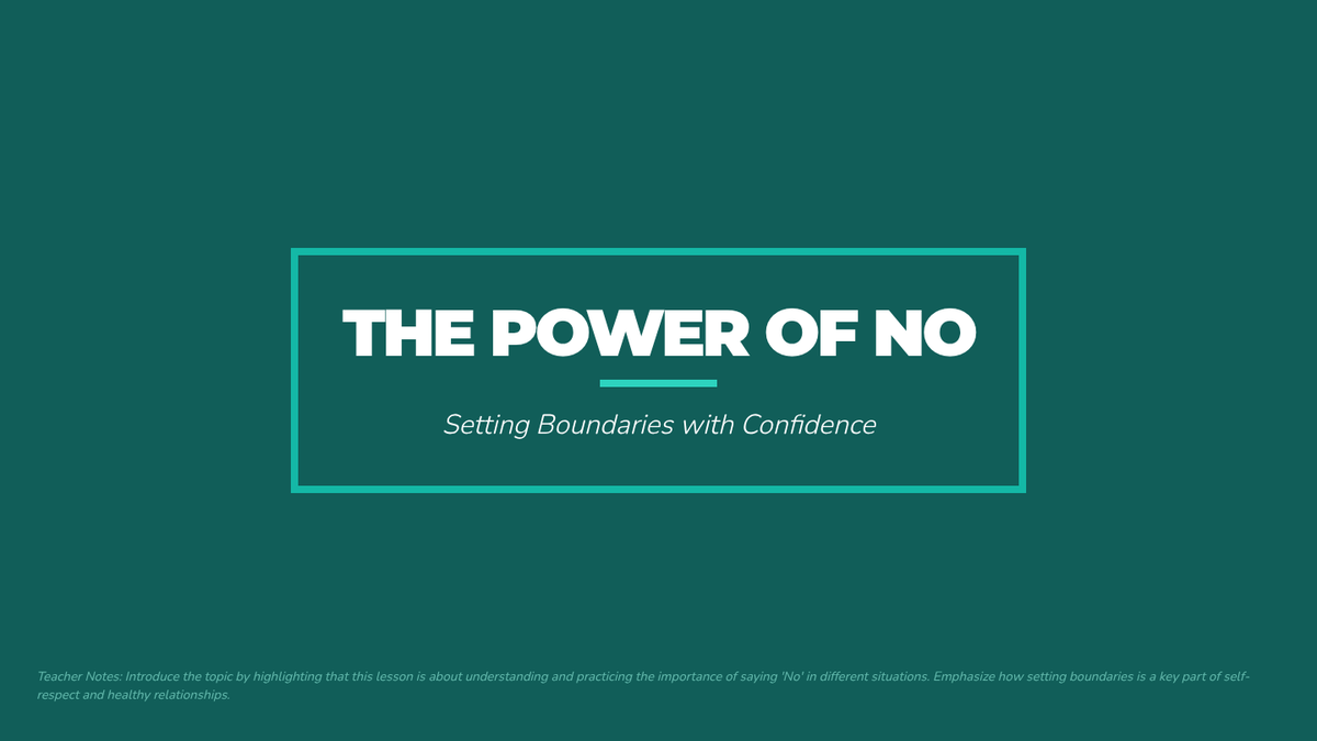This lesson empowers 6th-grade students to understand and practice the importance of saying 'No' in various situations, helping them build confidence and set personal boundaries. It's a crucial skill for developing healthy relationships and self-respect, tailored for small group support over a single 30-minute session.