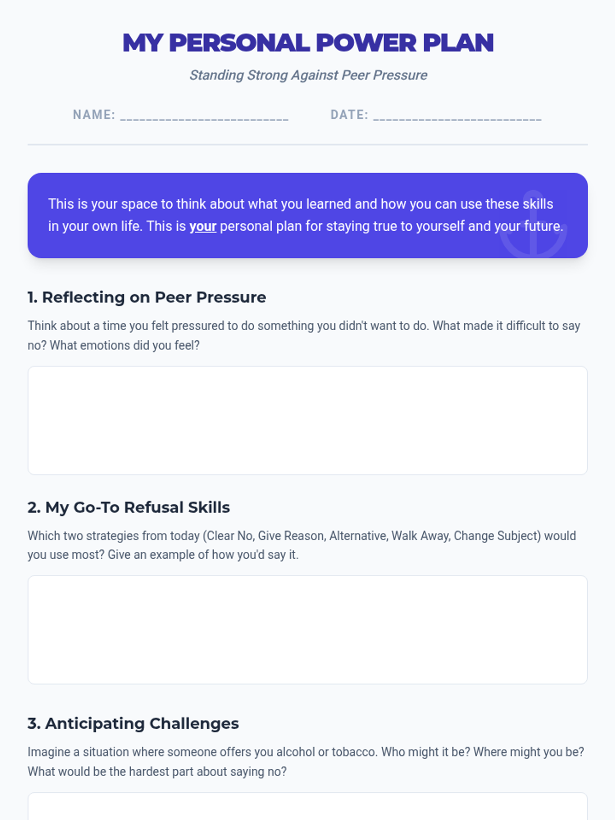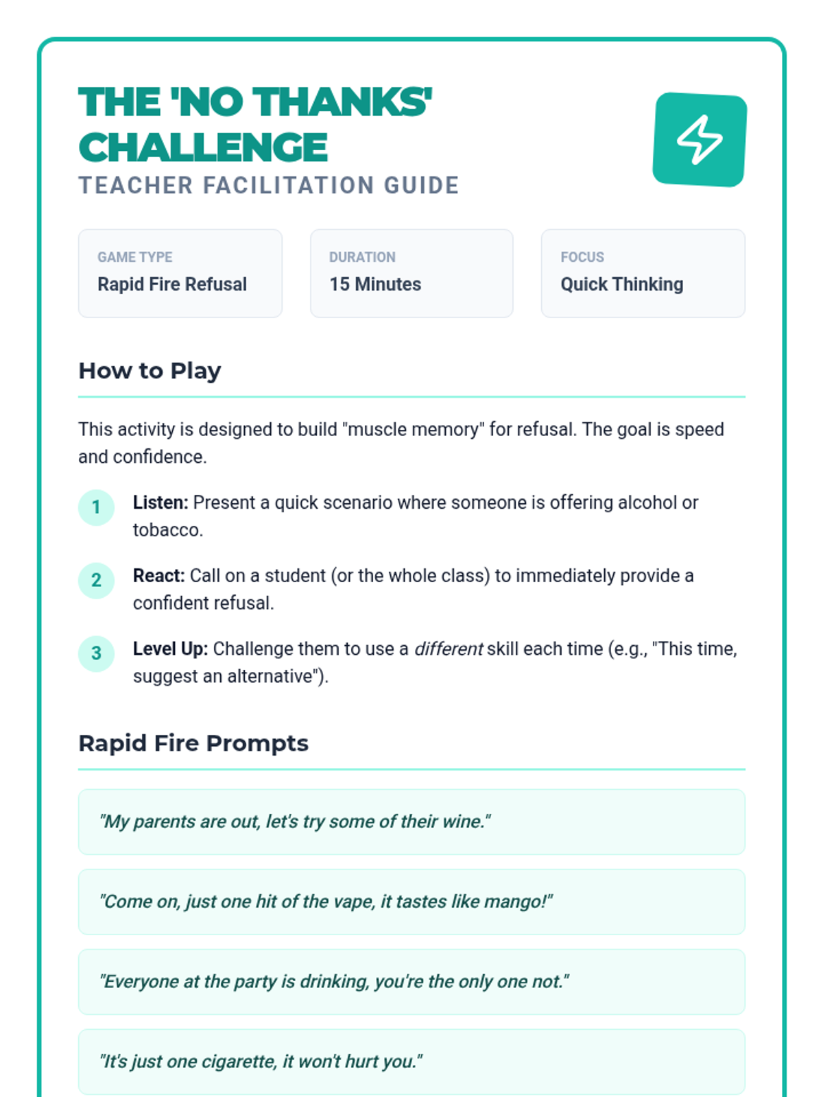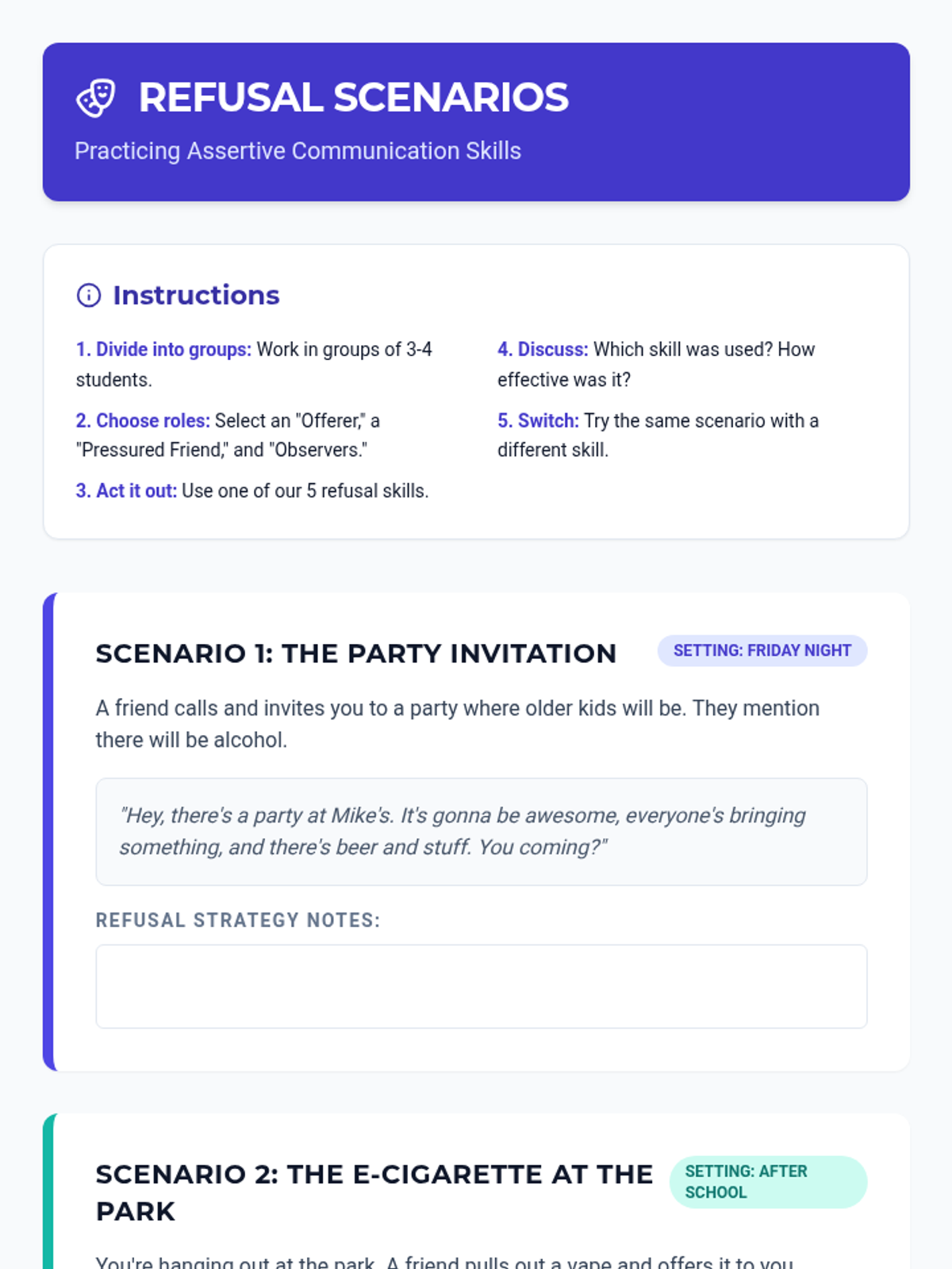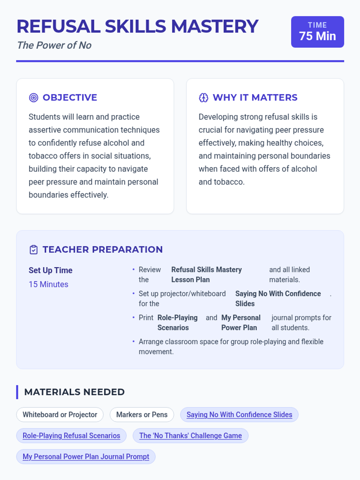 An interactive lesson teaching 8th-grade students assertive communication strategies to refuse alcohol and tobacco offers. Includes slides, role-playing activities, a fast-paced game, and a reflective journal task.