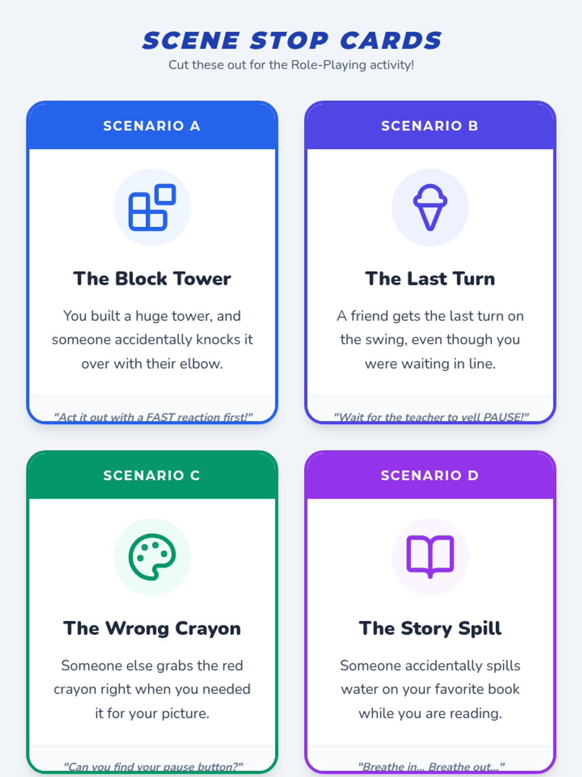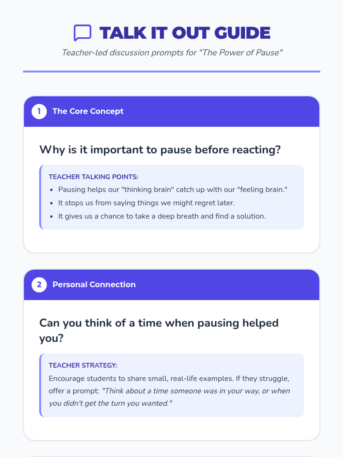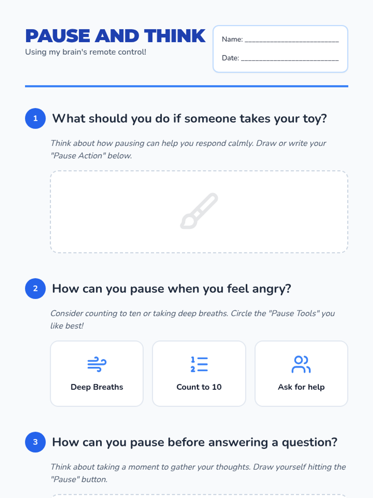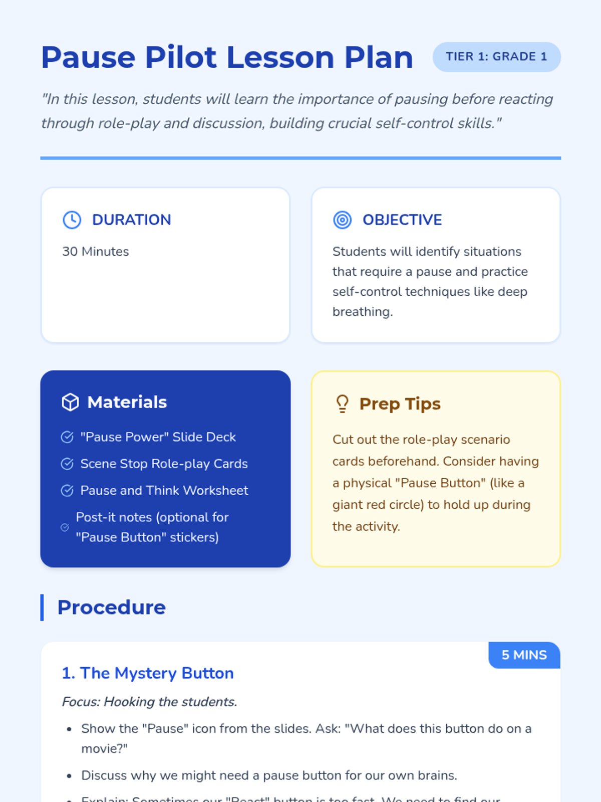 A lesson for Grade 1 students to learn emotional regulation by practicing the 'pause' technique before reacting to challenging situations.
