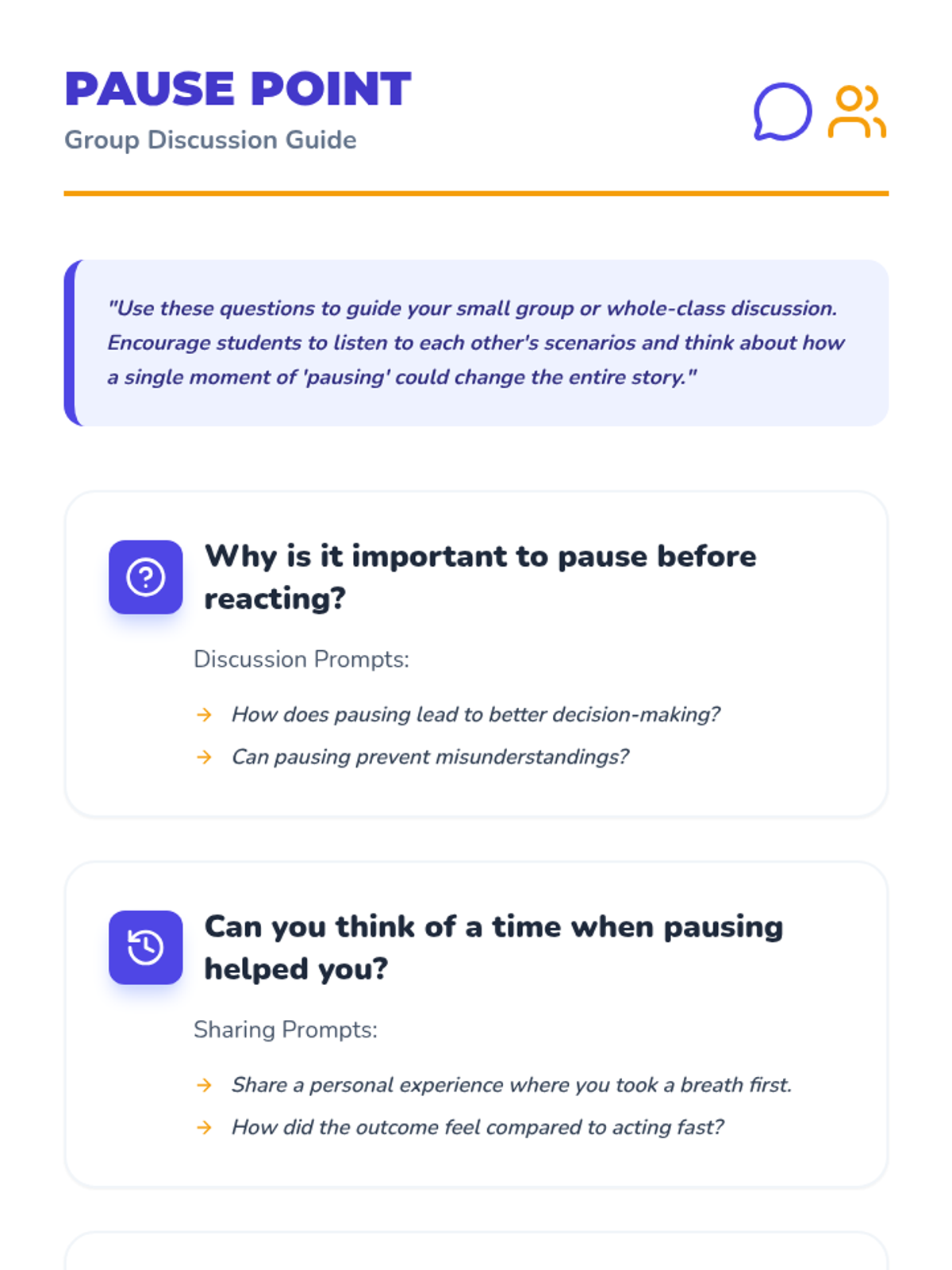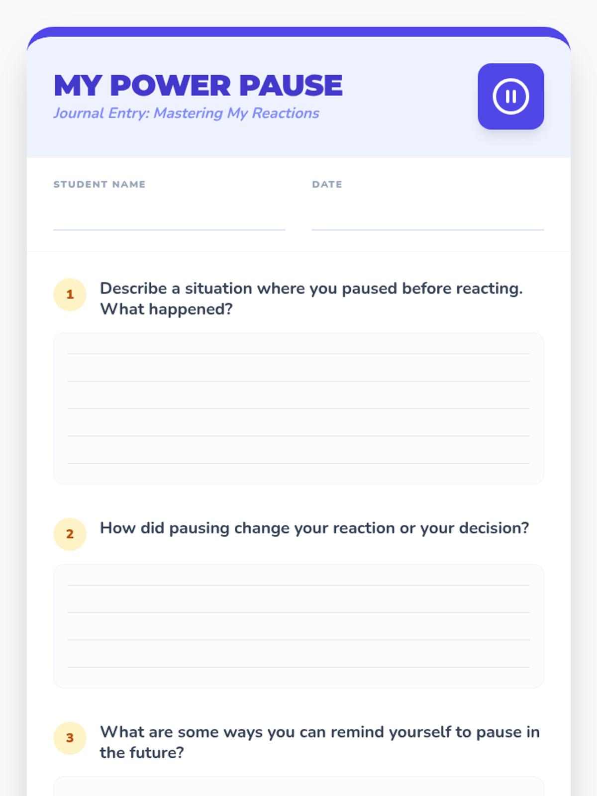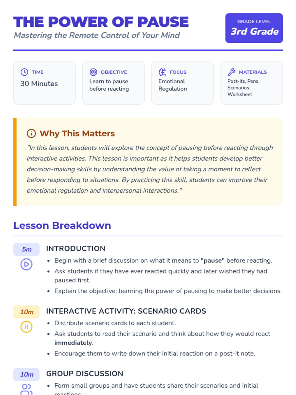 A social-emotional learning lesson for Grade 3 students that teaches the 'Power of Pause'—learning to stop and think before reacting to emotional situations to improve decision-making and interpersonal relationships.