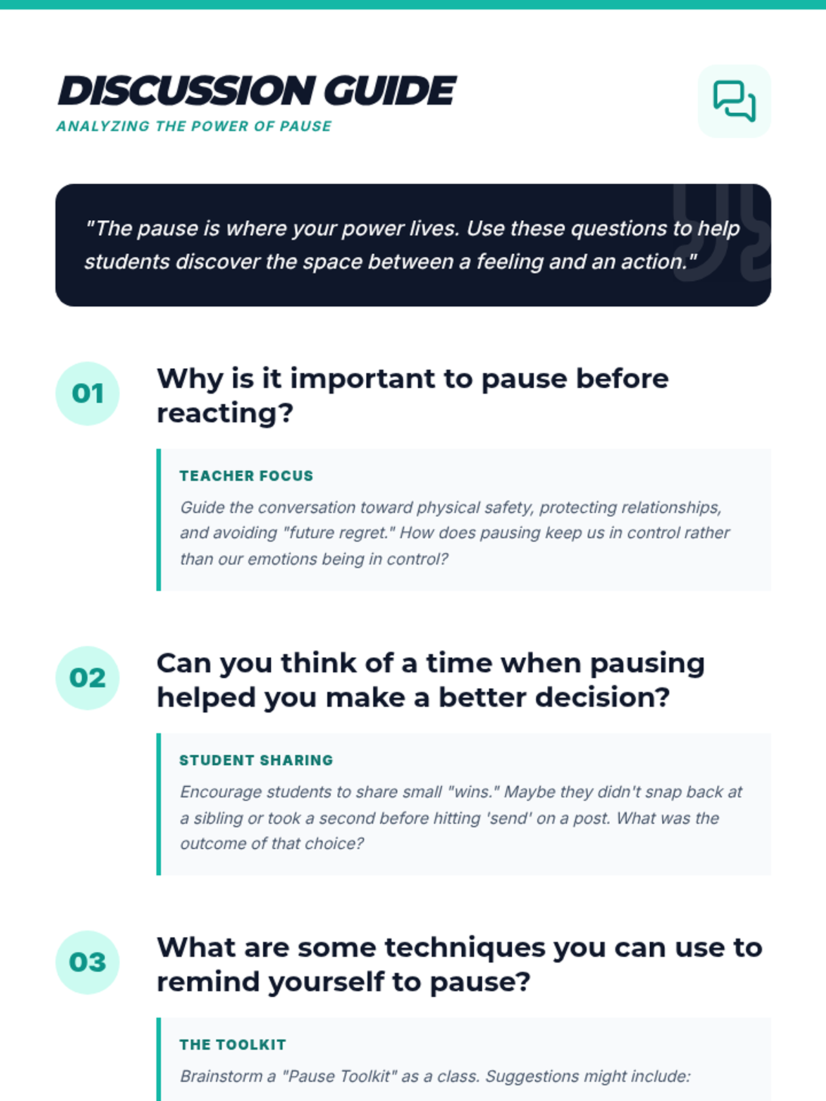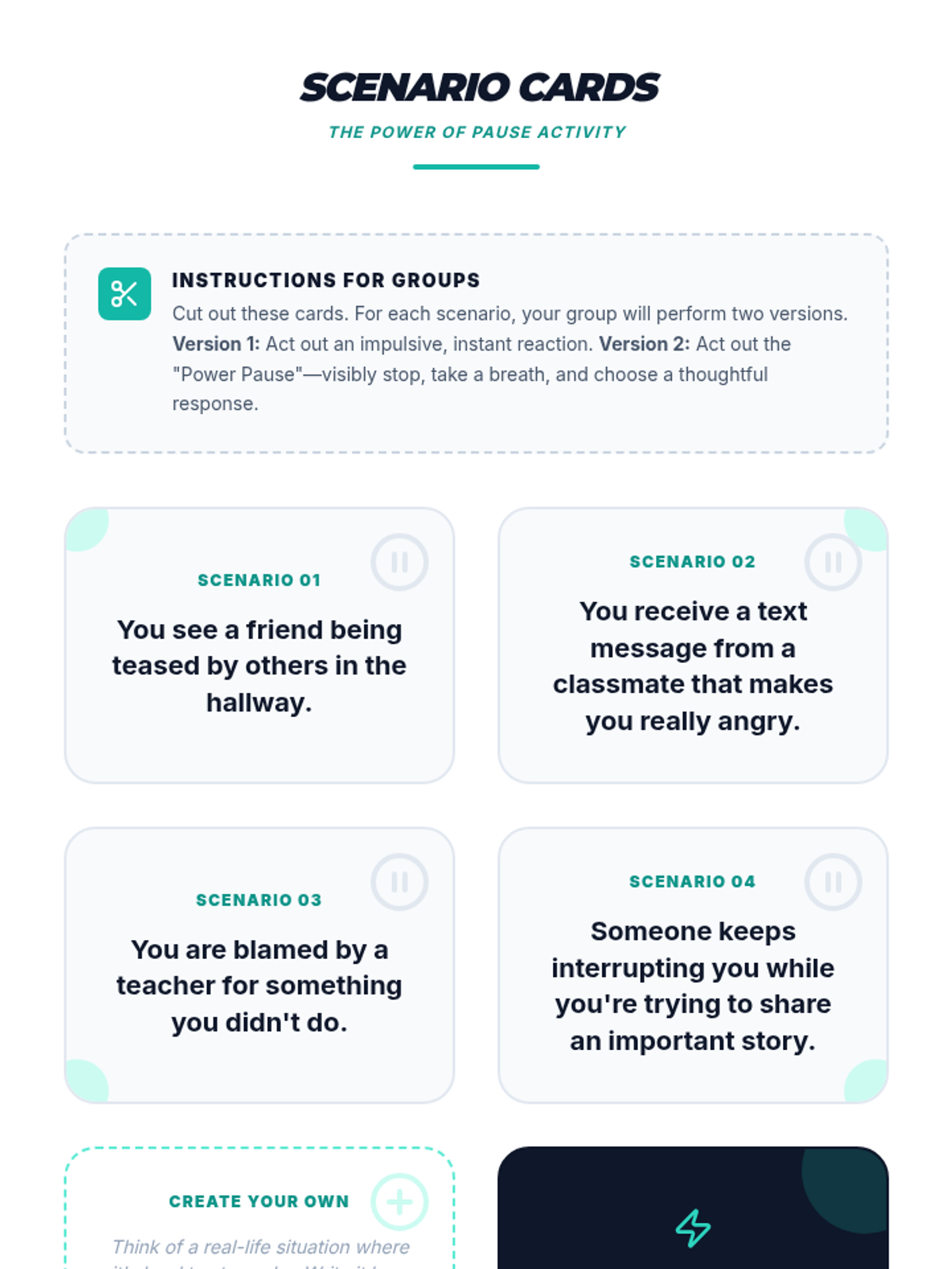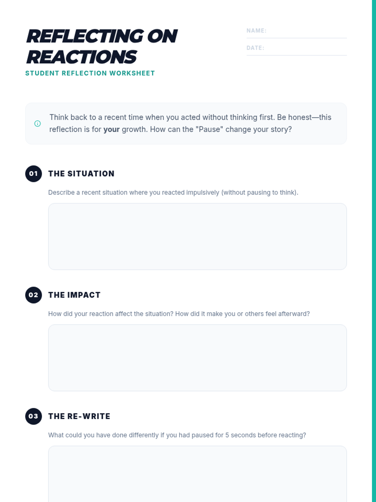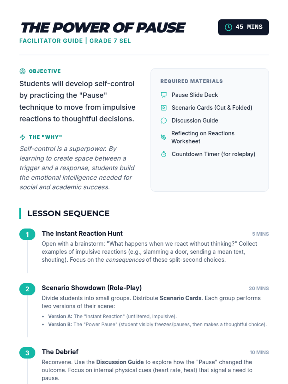 A lesson helping 7th-grade students develop self-control and decision-making skills by learning to pause before reacting to impulsive situations.