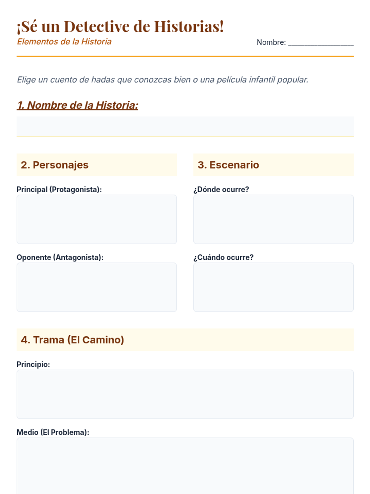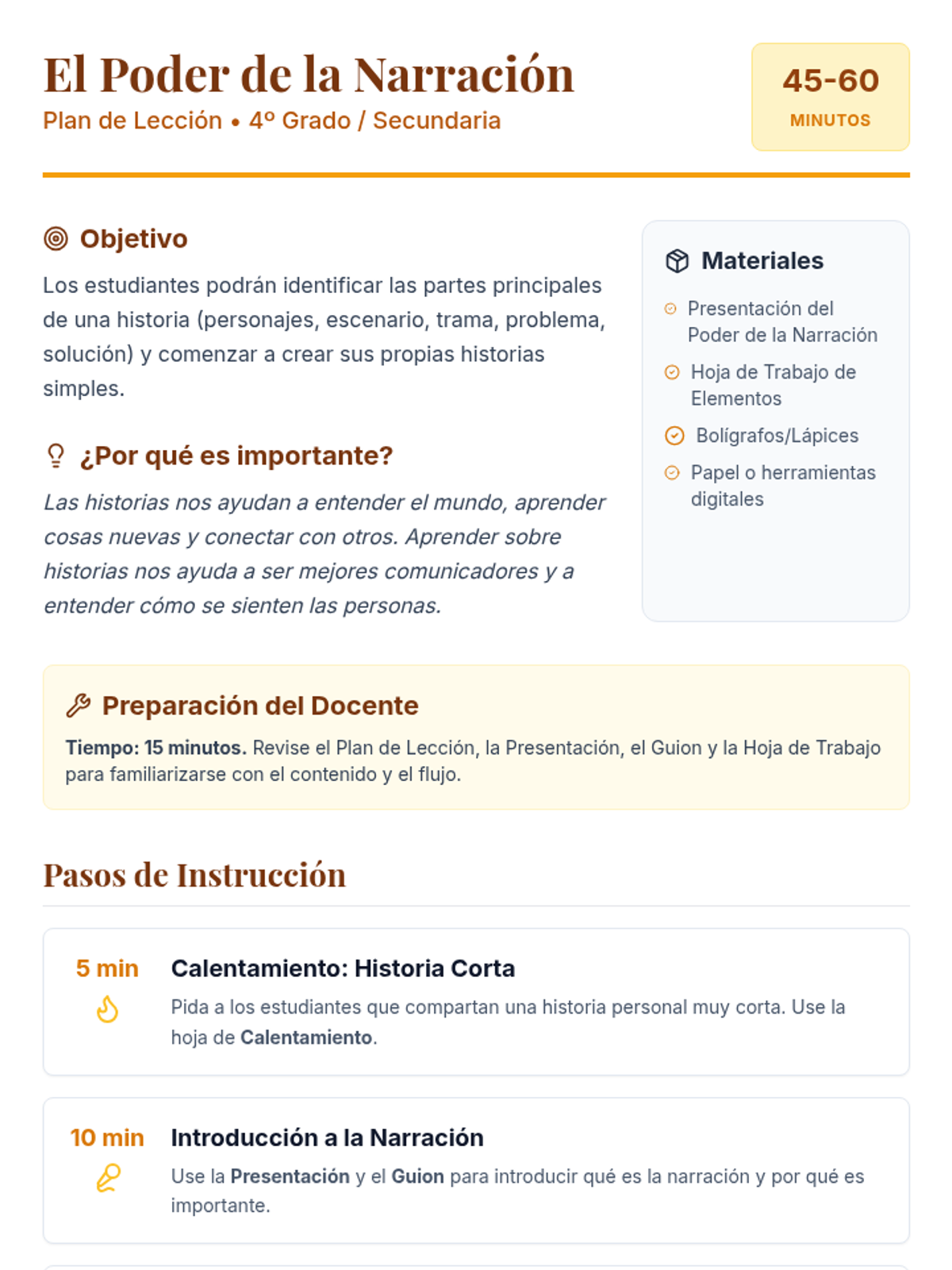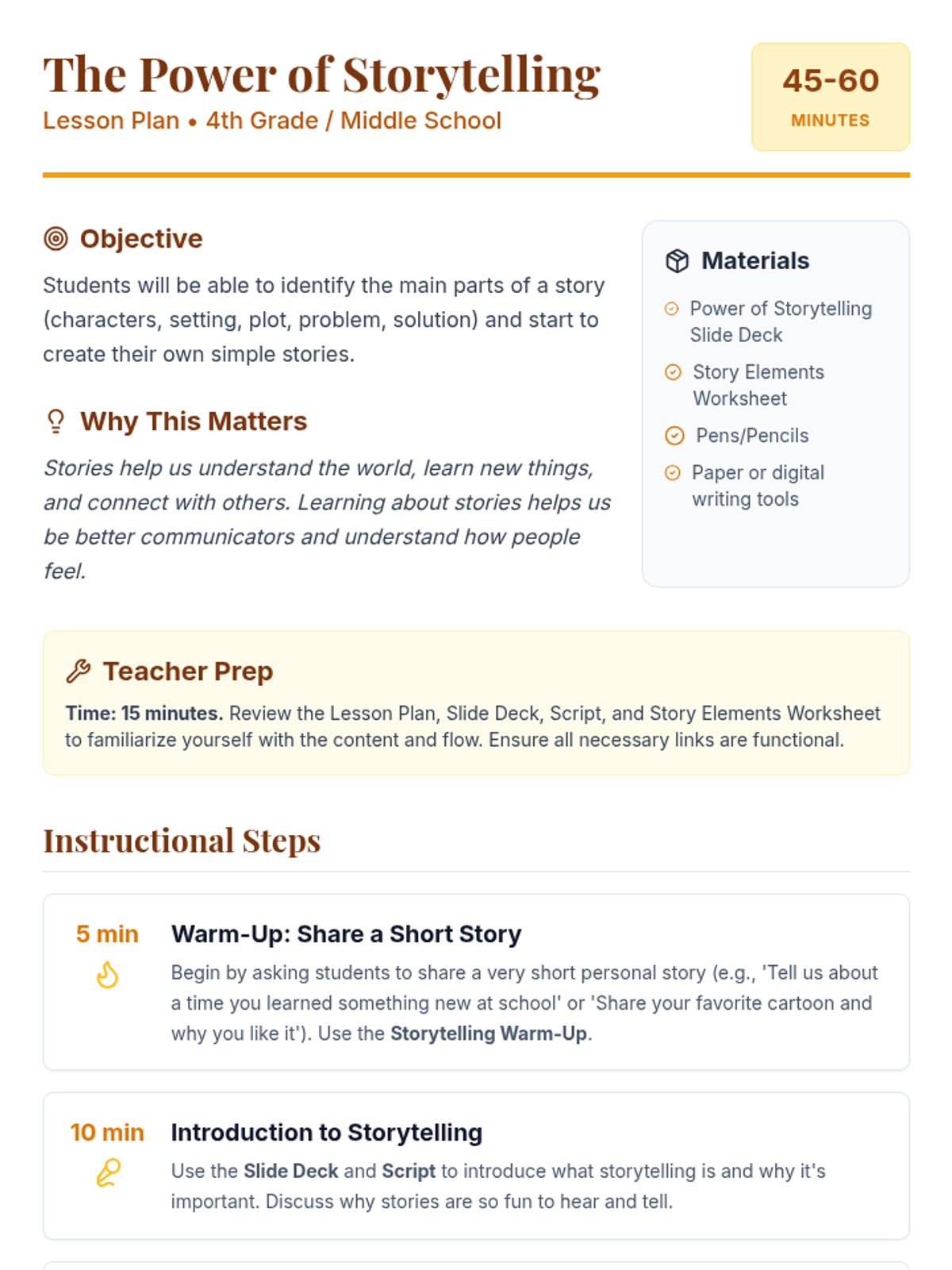Students explore the universal impact of storytelling, identifying key narrative elements (character, setting, plot, problem, solution) and practicing the creation of their own stories. available in English and Spanish.