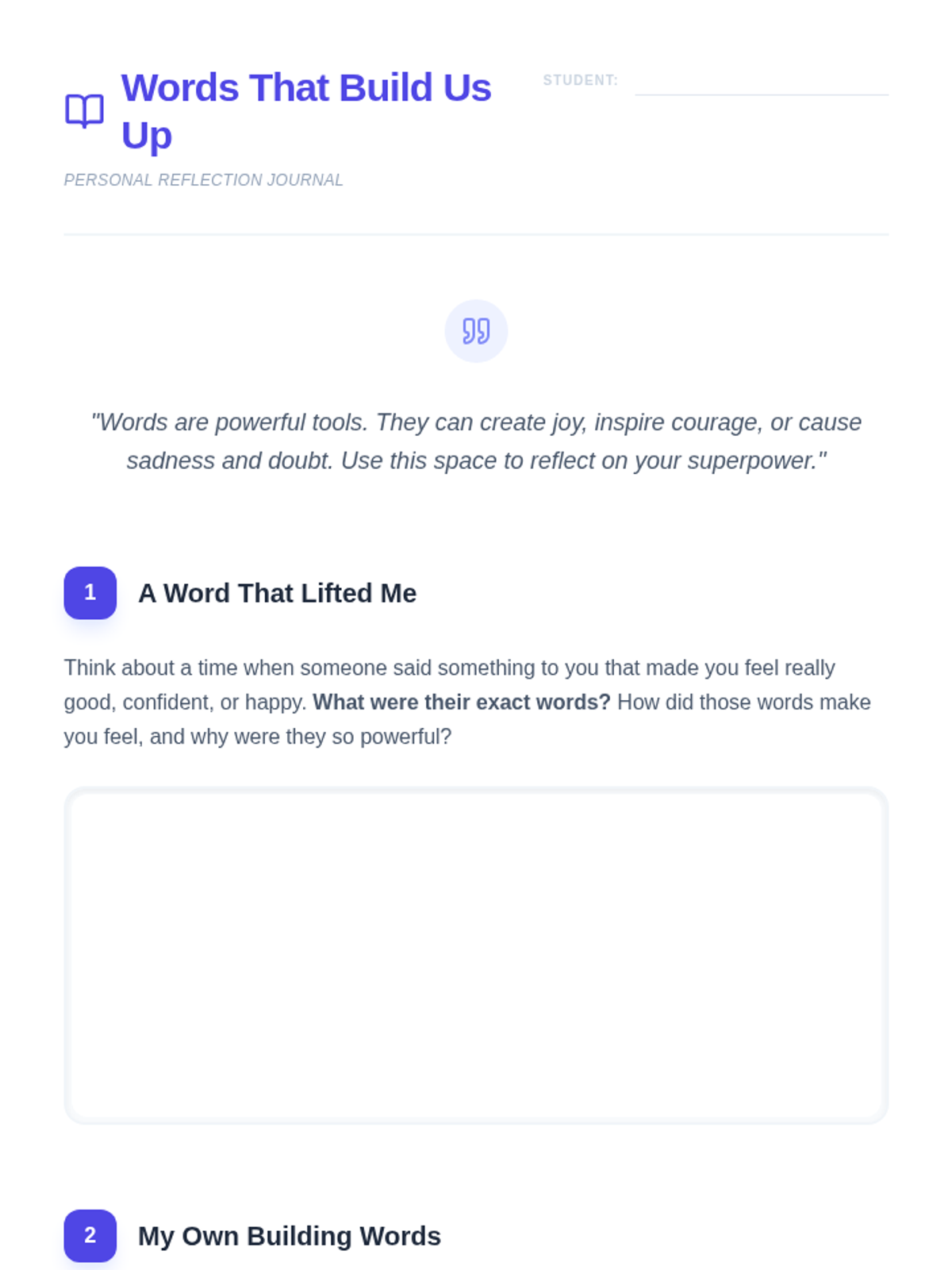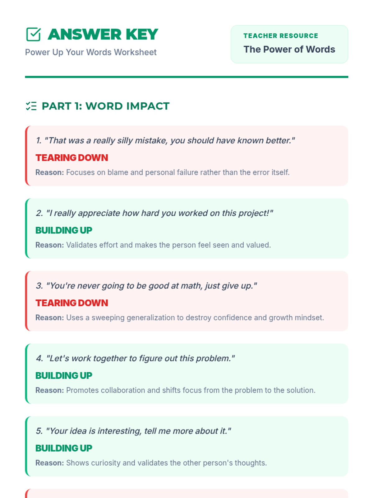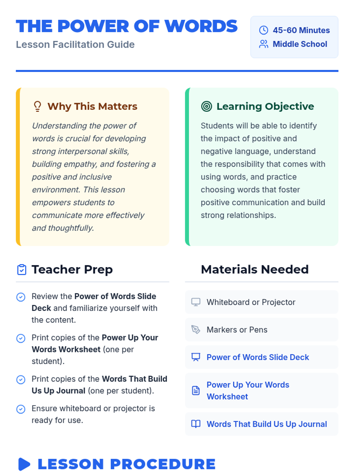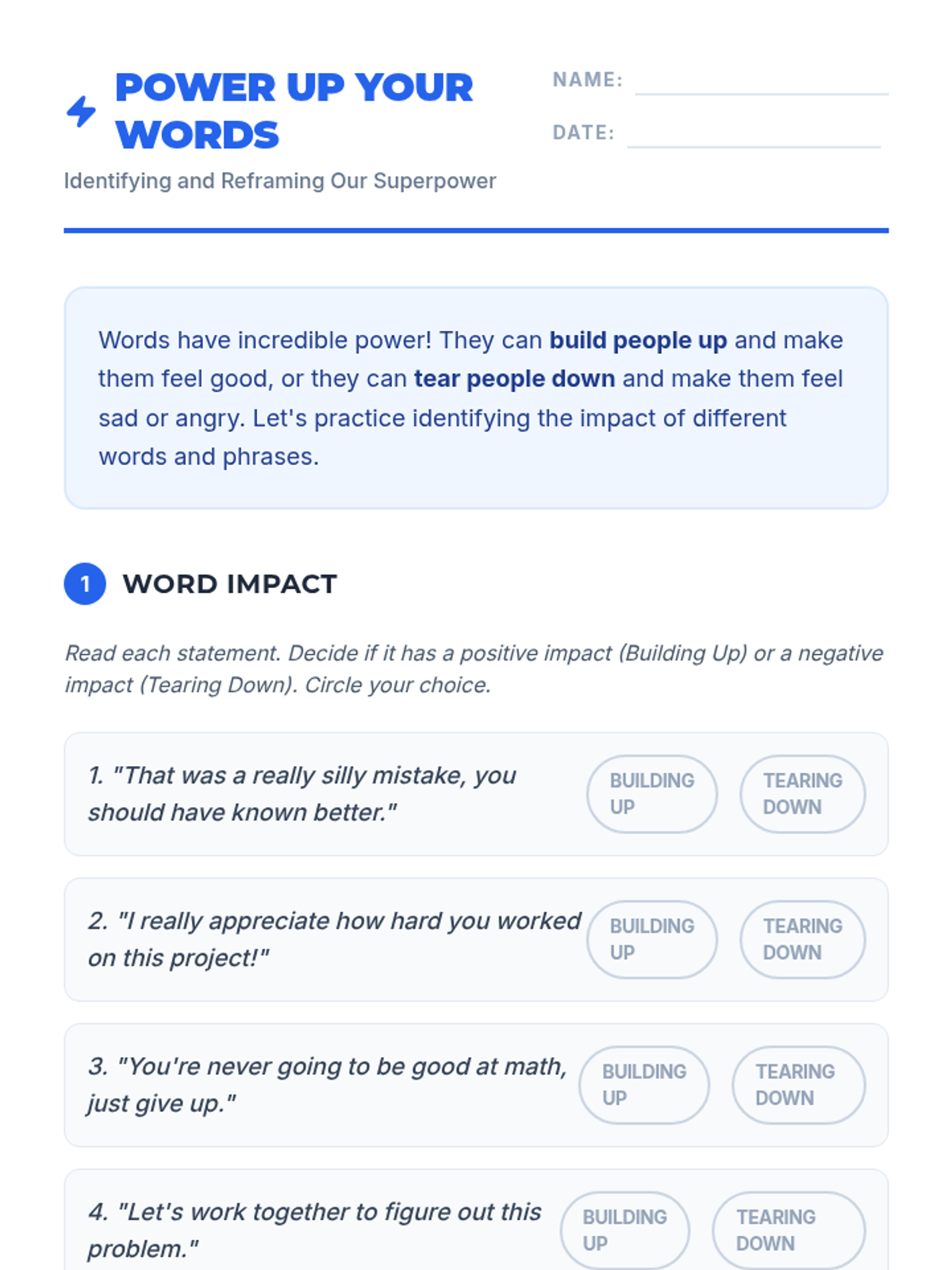 A 45-60 minute middle school lesson exploring the impact of positive and negative language. Students learn to treat their words as a superpower with the responsibility to build others up rather than tear them down.